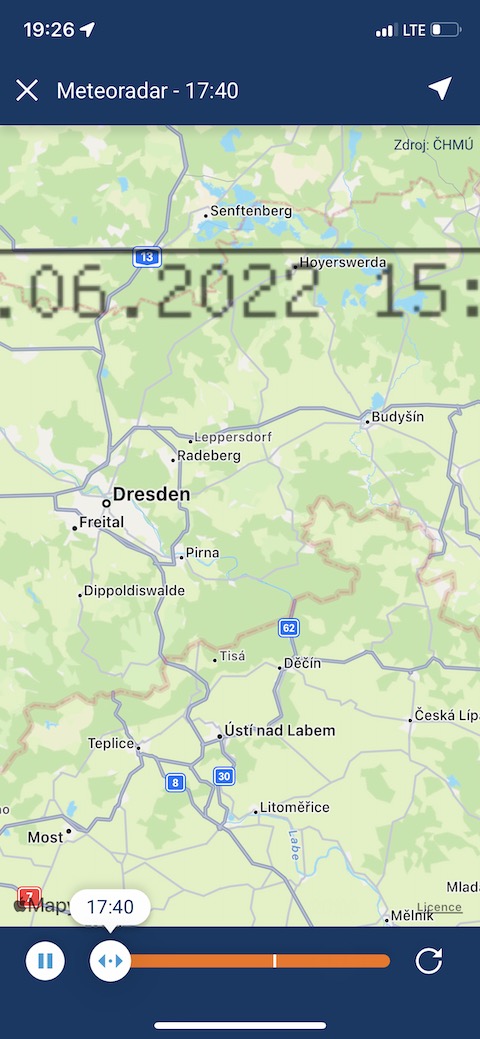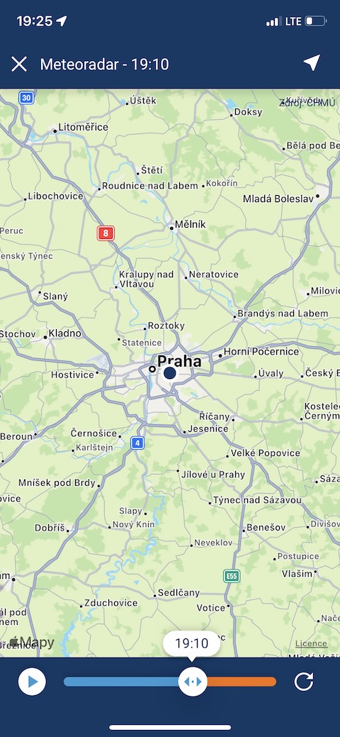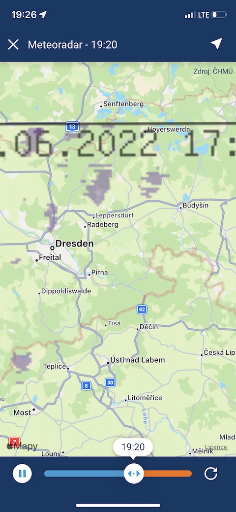 Na úvodní obrazovce aplikace In-Počasí se vám nabízí rychlý náhled na radarovou mapu. Pokud se rozhodnete prozkoumat ji podrobněji, stačí na ni klepnout. Otevře se vám detailní zobrazení, kde ve spodní části objevíte časovou osu. Ta vám umožní sledovat vývoj počasí v čase. Pro spuštění animace, která zobrazuje pohyb oblačnosti a srážek, stačí aktivovat ikonu přehrávání na levém okraji této osy. Tímto způsobem získáte dynamický pohled na aktuální a blížící se meteorologické jevy.