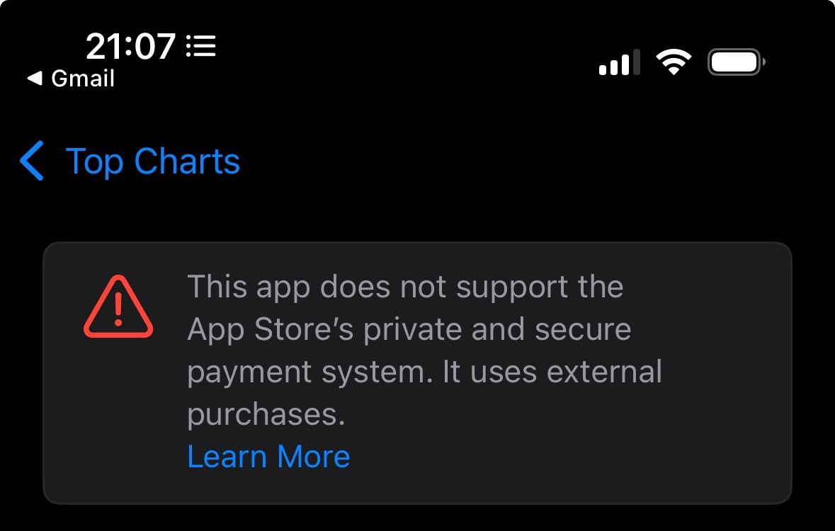 Apple opět budí rozruch. Tentokrát svým novým přístupem k aplikacím v EU, které využívají alternativní platební metody mimo systém App Storu.  Ve svém obchodě s aplikacemi totiž začal zobrazovat novou zprávu informující právě o alternativní platební metodě, avšak s tím, že značka, kterou Apple u těchto aplikací zavedl, připomíná spíš varování před malwarem než standardní upozornění. Je proto otázkou, nakolik bude podobné varování Evropské unii po chuti.