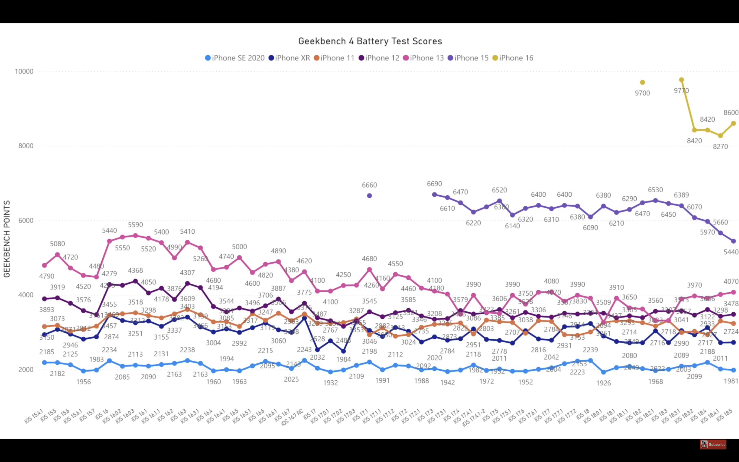 Pokud se podíváte na níže umístěný graf, příliš se toho nezměnilo. U iPhonů SE 2020, XR, 11, 12 a 13 je výkyv natolik zanedbatelný, že zřejmě jen ztěží poznáte rozdíl. iPhone 15 se ovšem propadl o zhruba 500 bodů a dostává se tak v tomto testu na historické minimum. iPhone 16 si naopak o 330 bodů polepšil. Jak výdrž baterie po aktualizaci hodnotíte vy?