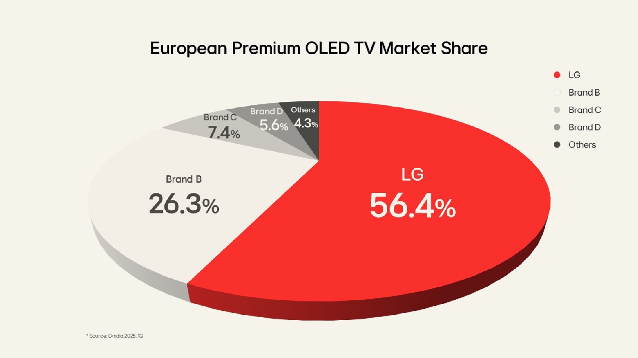 Jen v prvním čtvrtletí roku 2025 dodala společnost LG v Evropě přibližně 391 100 kusů OLED televizorů, čímž si udržela dominantní tržní podíl 56,4 % a vedoucí pozici na klíčových trzích, včetně Velké Británie, Německa a Francie. V současné době nese logo LG více než každý druhý OLED televizor prodaný v Evropě, což svědčí o bezkonkurenční popularitě značky.