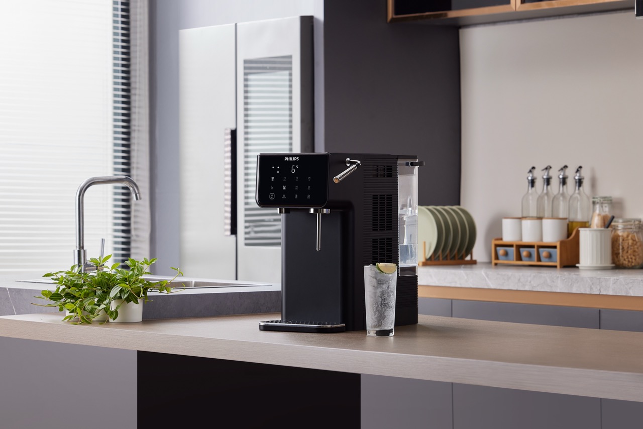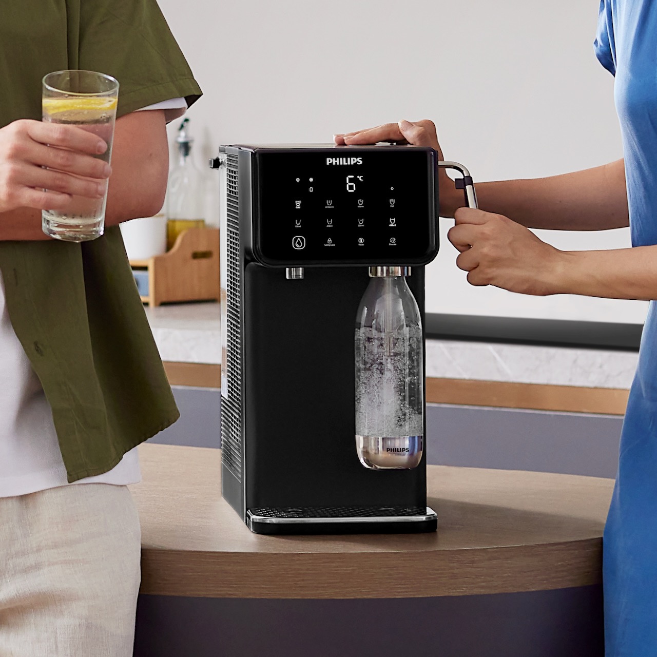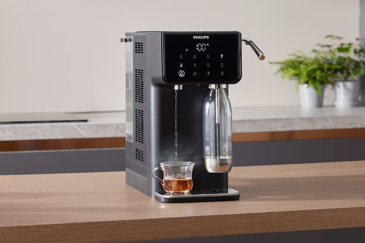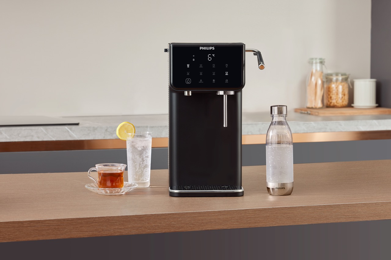 Vypadá stejně elegantně jako kávovar, ale místo kávy vám vyčistí vodu a dodá vám ji v požadované podobě: vychlazenou, ohřátou nebo s bublinkami. Vodní stanice s funkcí sodovkovače Philips ADD5962BK je dokonale všestranná. Vodu nejprve zbaví dusičnanů, pesticidů, olova, chloru, těžkých kovů, PFAS i mikroplastů a pak vám ji třeba ohřeje: vybrat si můžete ze sedmi možností nastavení teploty a hotovo bude za pár vteřin. Nebo vám ji ochladí, případně z ní udělá sodovku. Navolit si můžete i vychlazenou sodovku. Díky UV-C LED světlu se v přefiltrované vodě v zásobníku nemnoží baterie, takže zůstává neustále čistá.