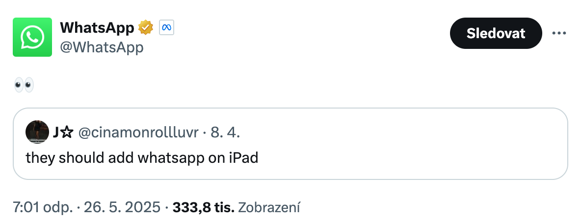 Populární komunikační platforma WhatsApp, vlastněná společností Meta, zřejmě chystá spuštění své aplikace pro iPad. Na tuto verzi uživatelé čekají dlouhé roky a nyní se zdá, že jejich přání bude brzy vyslyšeno. Náznak přišel přímo z oficiálního účtu WhatsAppu na síti X (dříve Twitter), kde společnost reagovala emotikonem očí na příspěvek s výzvou, aby byla aplikace pro iPad konečně vydána. A byť jde o nenápadné gesto, ve světě technologií má podobná symbolika často jasný význam.