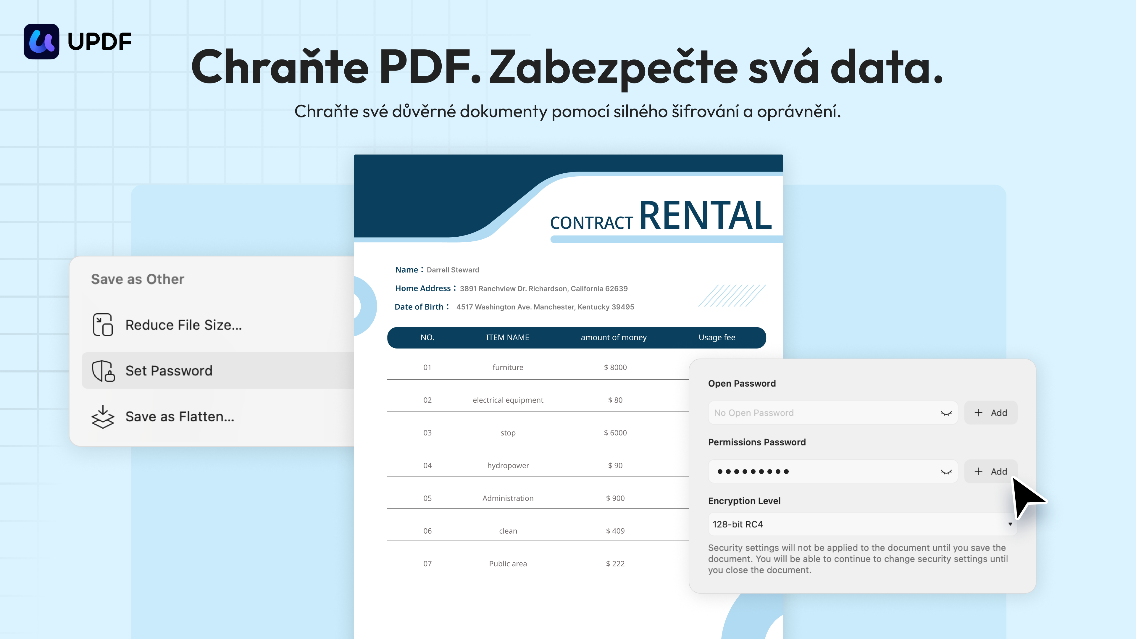 Soukromí je velmi důležité. UPDF pomáhá s ochranou citlivých souborů a má také robustní šifrovací funkce. Má také funkci ochrany heslem, která zajišťuje ochranu všech produktů.