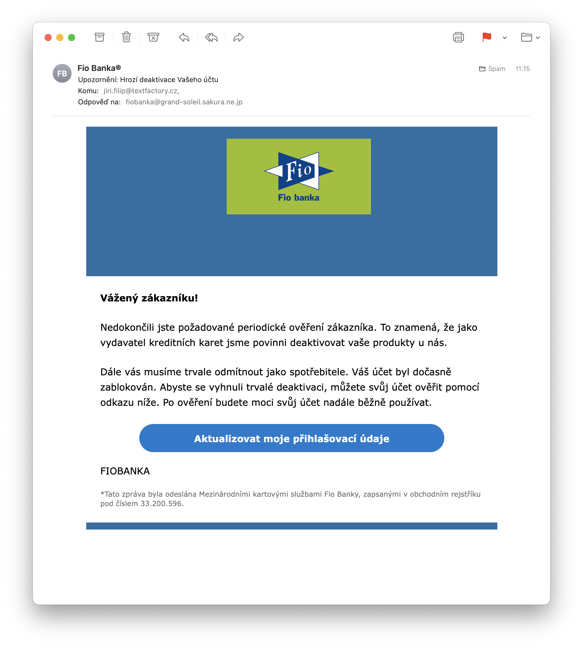 Odhalení tohoto podvodného jednání není naštěstí vůbec složité, jelikož stačí jen rozkliknout detail mailové adresy, ze které vám daná zpráva přišla, a při použití selského rozumu vám bude hned jasné, že bankovní instituce typu Fio banky by nejspíš z domény @grand-soleil.sakura.ne.jp nepsal. Nicméně méně znalí lidé mohou mít s rozeznáním samozřejmě problémy – tím spíš, pokud klienty Fio banky jsou. Tím jsem shodou okolností i já a když mi tak došly maily, na pár vteřin jsem zbystřil. Právě podobné náhody přitom šance útočníků na získání vašich údajů zvyšují a proto je na místě být opravdu velmi obezřetný.
