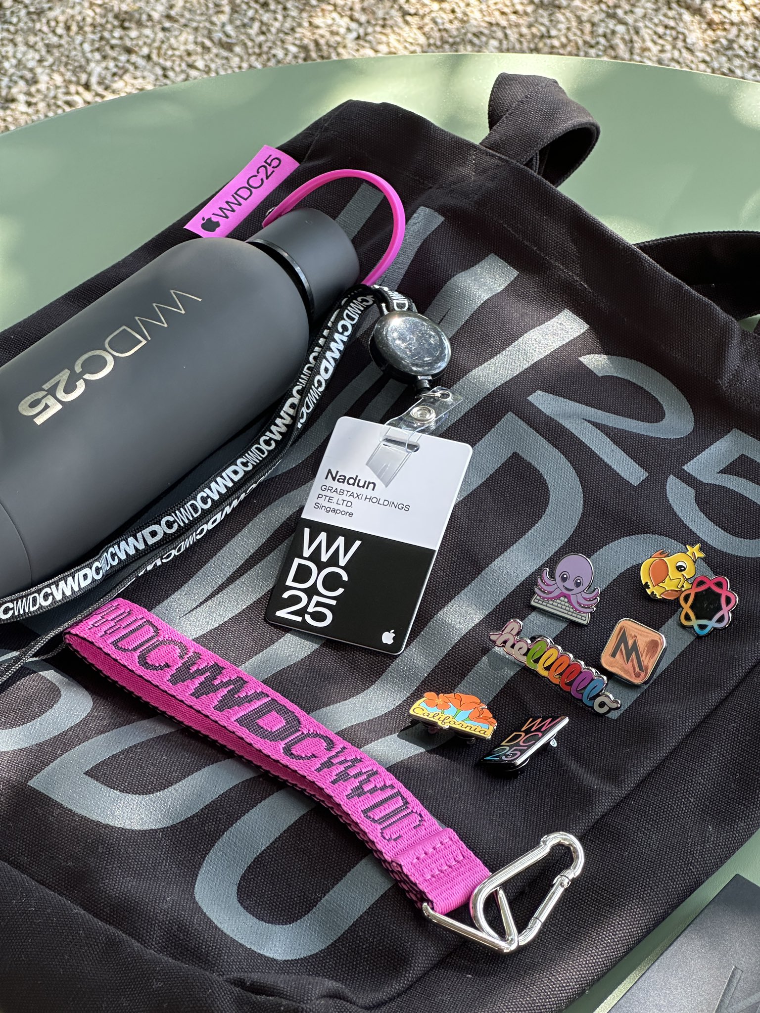 I letos byl pro vývojáře, které Apple pozval na WWDC připraven dárek. Jako tradičně, i tentokrát dostali tašku, ve které si mohou své věci odnést. Jedná se o plátěnou černou tašku s potiskem WWDC25 a fialovým tagem. Nechybí ani láhev na vodu, visačka s popruhem na krk, odznáčky, které doprávází WWDC již dlouhé roky. Trochu netradičně pak Apple místo kšiltovky připravil pro vývojáře klíčenku se skobou, která je ve fialové barve s nápisem WWDC, jenž se neustále opakuje po celém obvodu klíčenky.
