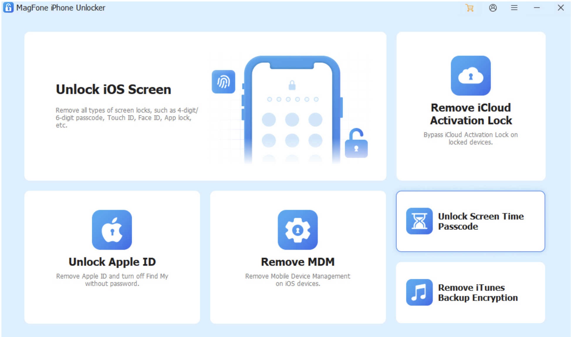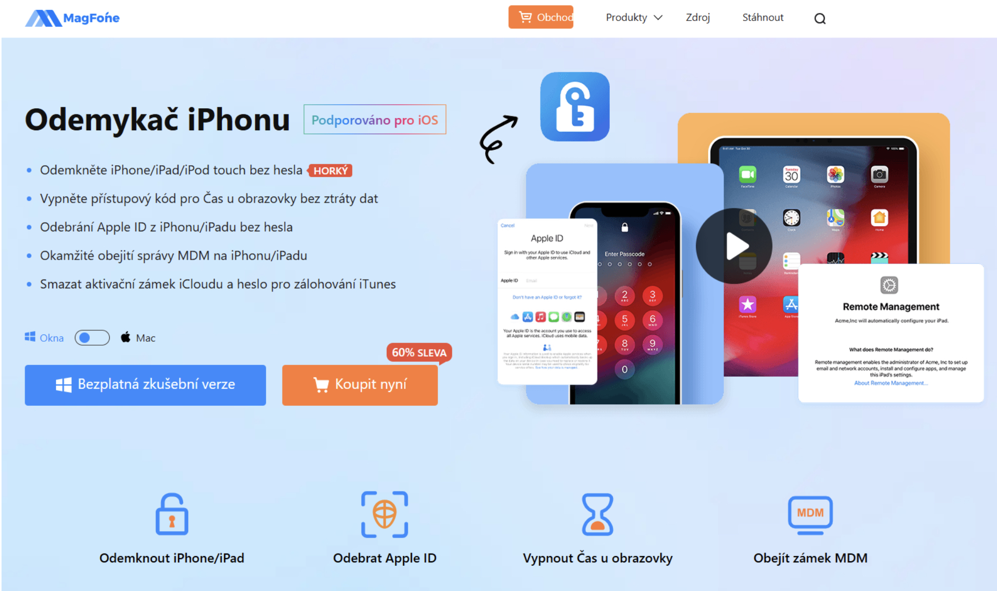 MagFone iPhone Unlocker je profesionální nástroj navržený pro odemknutí iOS zařízení bez hesla. Podporuje: