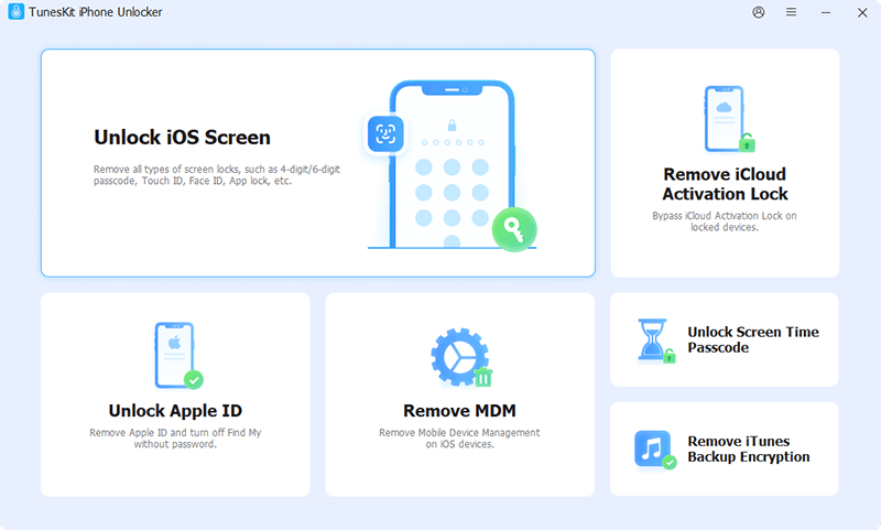 TunesKit iPhone Unlocker je profesionální nástroj, který lze použít k odblokování iPhonu, iPadu a iPodu touch. S jeho pomocí nepotřebujete žádné ověřovací údaje, jako je přístupový kód, Apple ID nebo heslo Apple ID. Může vás zachránit z různých situací zablokování zařízení, jako je zapomenutý přístupový kód iPhone, žádná možnost odebrání profilu MDM, Apple ID zakázané z bezpečnostních důvodů, zapomenutý přístupový kód Screen Time, iPhone uzamčený na majitele atd.