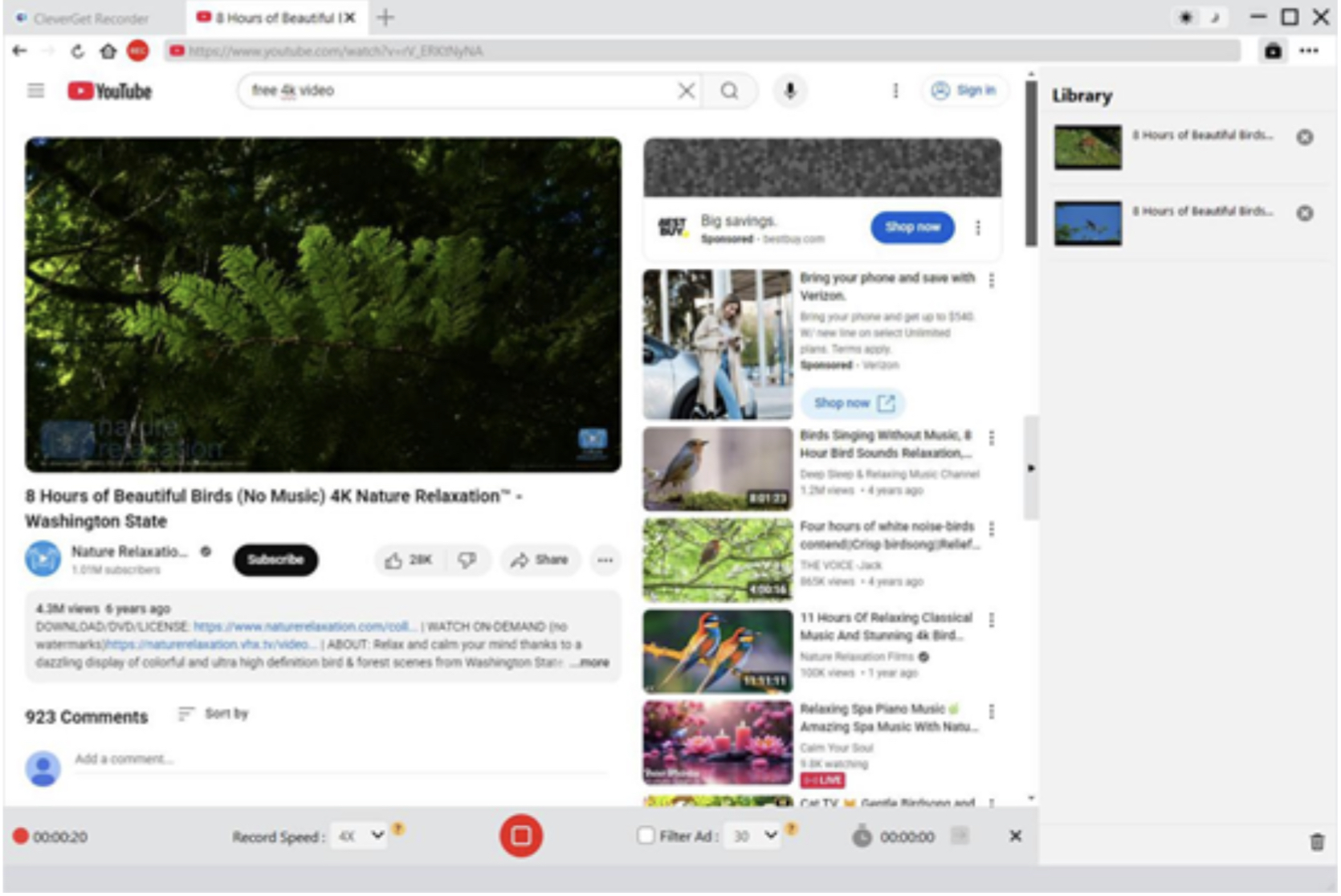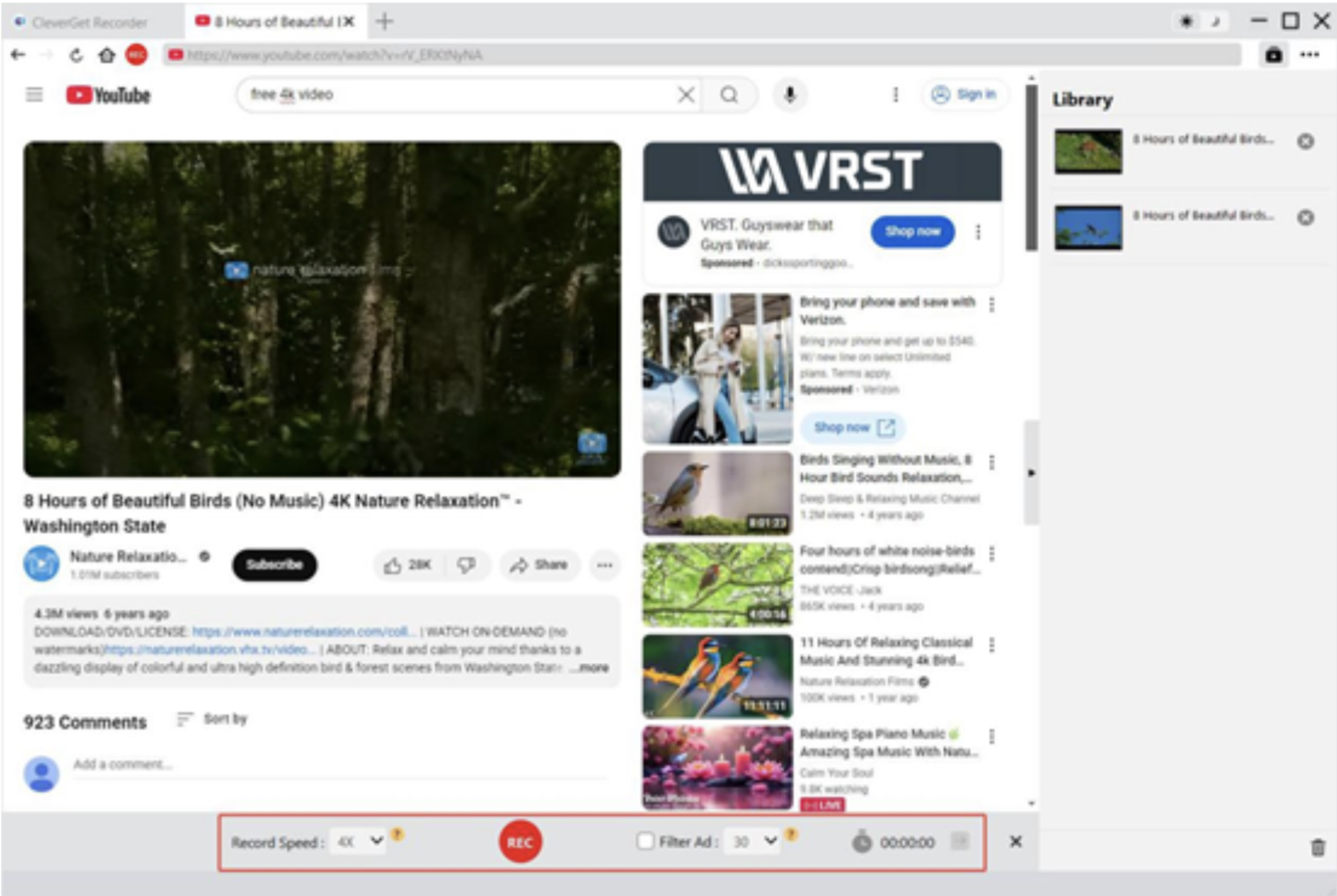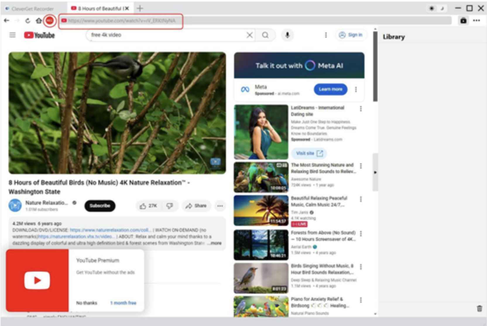 Po potvrzení nastavení nahrávání klikněte na červené tlačítko REC na panelu nástrojů a začněte nahrávat streamované video. Délku nahrávání můžete sledovat v levém dolním rohu. Poté musíte počkat na dokončení nahrávání. Všechny nahrávky můžete zobrazit otevřením postranního panelu Knihovna (Library) vpravo.