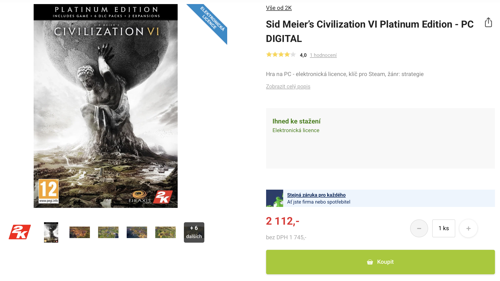 Právě díky těmto prvkům je nutné každé rozhodnutí důkladně promyslet, protože může mít dopad na celý další vývoj vaší říše. Diplomacie je oproti předchozím dílům mnohem propracovanější a nabízí víc než jen výměnu surovin nebo vyhlášení války. Potěší i stylizovaná grafika, která je přehledná, barevná a snadno čitelná i v pozdějších fázích hry, kdy mapa doslova ožívá. Civilization VI v této edici osloví jak veterány série, tak i úplné nováčky, kteří chtějí poznat, proč je tahle značka tak ikonická. Platinum Edition je zkrátka tím nejlepším, co můžete z šestého dílu Civilization dostat. A pokud jste strategiemi dosud jen lehce koketovali, tohle je ideální vstupní brána.