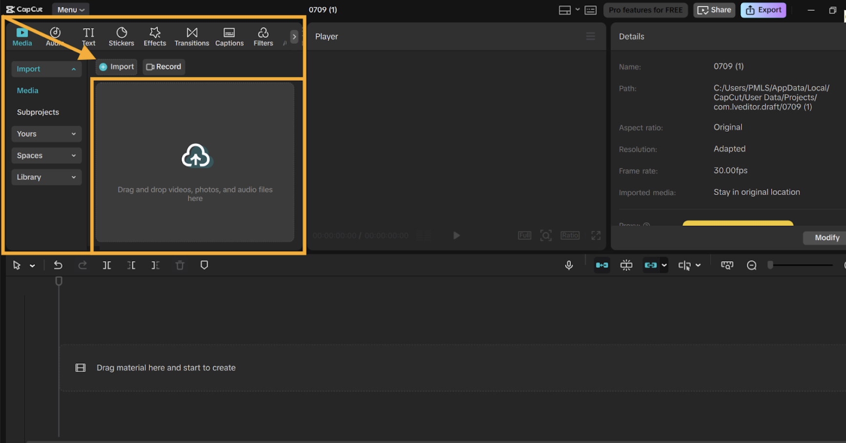 Open CapCut PC and click the “Import” icon. Choose the videos or photos that you will use. Drag them into the bottom timeline on the screen.