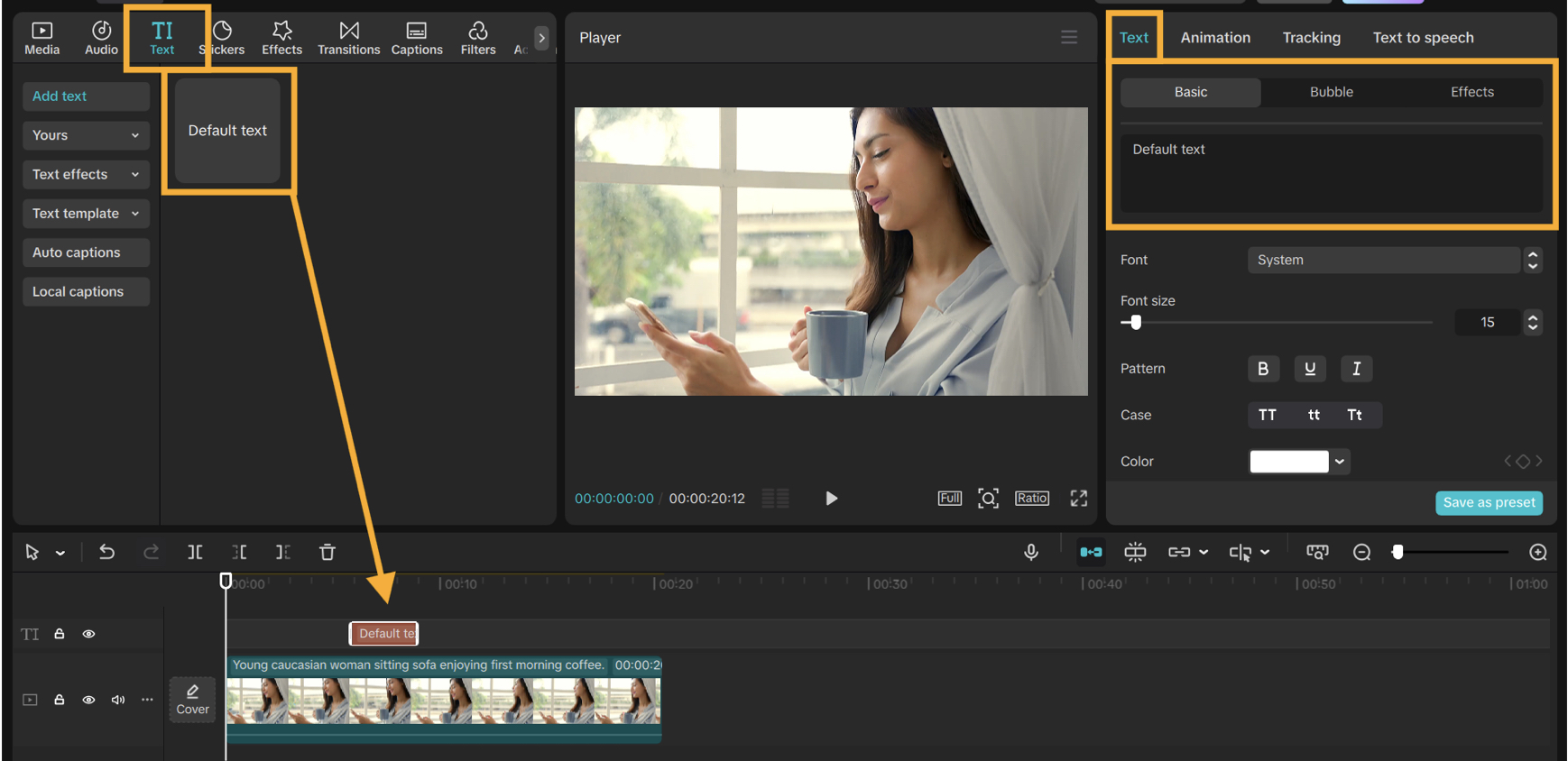 Click on „Text“ from the top menu. Select „Default Text“ and drag it to the timeline. Enter your message into the text box.