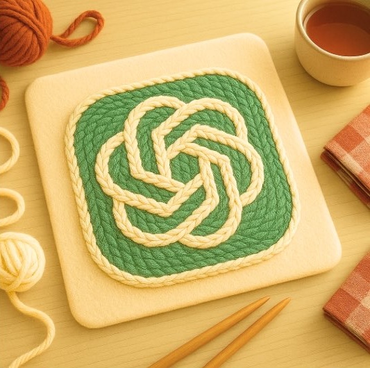 Create a hyper-realistic 3D rendering of the [NÁZEV ZNAČKY] logo, hand-crafted from thick braided wool yarn. The logo is knitted in high detail with visible yarn texture and outlined with soft cream stitching. Display it on a pastel beige felt mat on a light oak wooden craft table, surrounded by matching yarn balls, knitting needles, a folded patchwork cloth, and a ceramic cup of tea. Sunlight streams from a side window, casting soft shadows. Clean, cozy, top-down composition. 1080×1080 square format.
