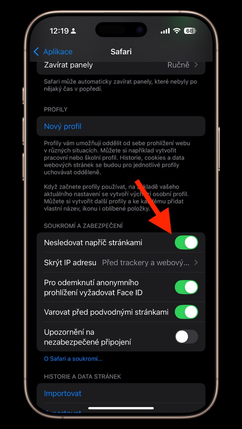 Ačkoliv je tato funkce zapnutá ve výchozím nastavení, někteří ji omylem vypnou. Proto si ji raději zkontrolujte: Jděte do Nastavení > Aplikace > Safari a v sekci Soukromí a zabezpečení zapněte „Nesledovat napříč stránkami“.
