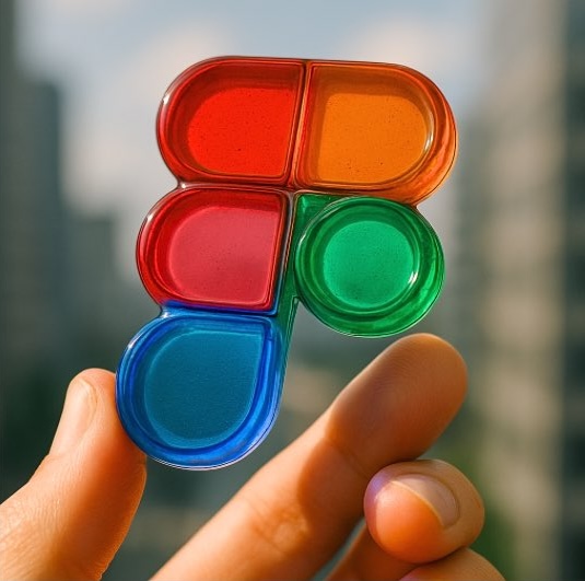 Create a photorealistic 1080×1080 image of a human hand naturally holding a translucent glass version of the [BRAND] logo in its original vibrant colors, tilted at an angle to showcase depth and premium material quality. Use soft natural daylight with gentle reflections, internal light scatter, and colored highlights on realistic fingertips. Set against a softly blurred modern cityscape background in bokeh. Render in 4K quality with macro lens effect, shallow depth of field, accurate glass refraction, and realistic material shaders for social media showcase.