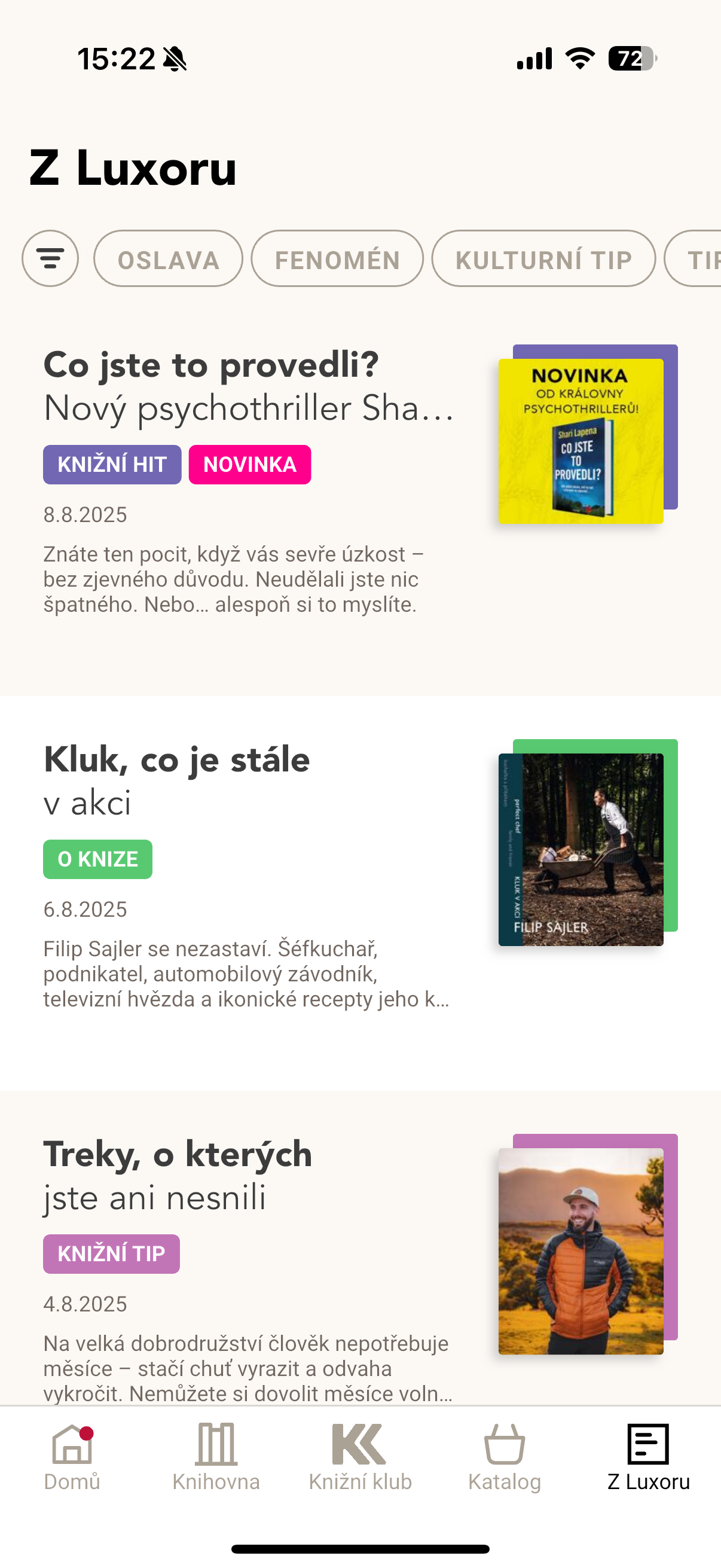 Jednou z největších novinek je plná integrace Knižního klubu přímo do aplikace Můj Luxor. Ten se po více než třiceti letech fungování stal oficiálním věrnostním programem Luxoru a společně s tím dostal i řadu vylepšení. Klubová karta je nově digitální a vždy po ruce v mobilu, stejně jako přístup k e-knihám a audioknihám, které si lze přes aplikaci okamžitě číst nebo poslouchat. A co víc – e-knihy či audioknihy lze koupit za zvýhodněné klubové ceny.