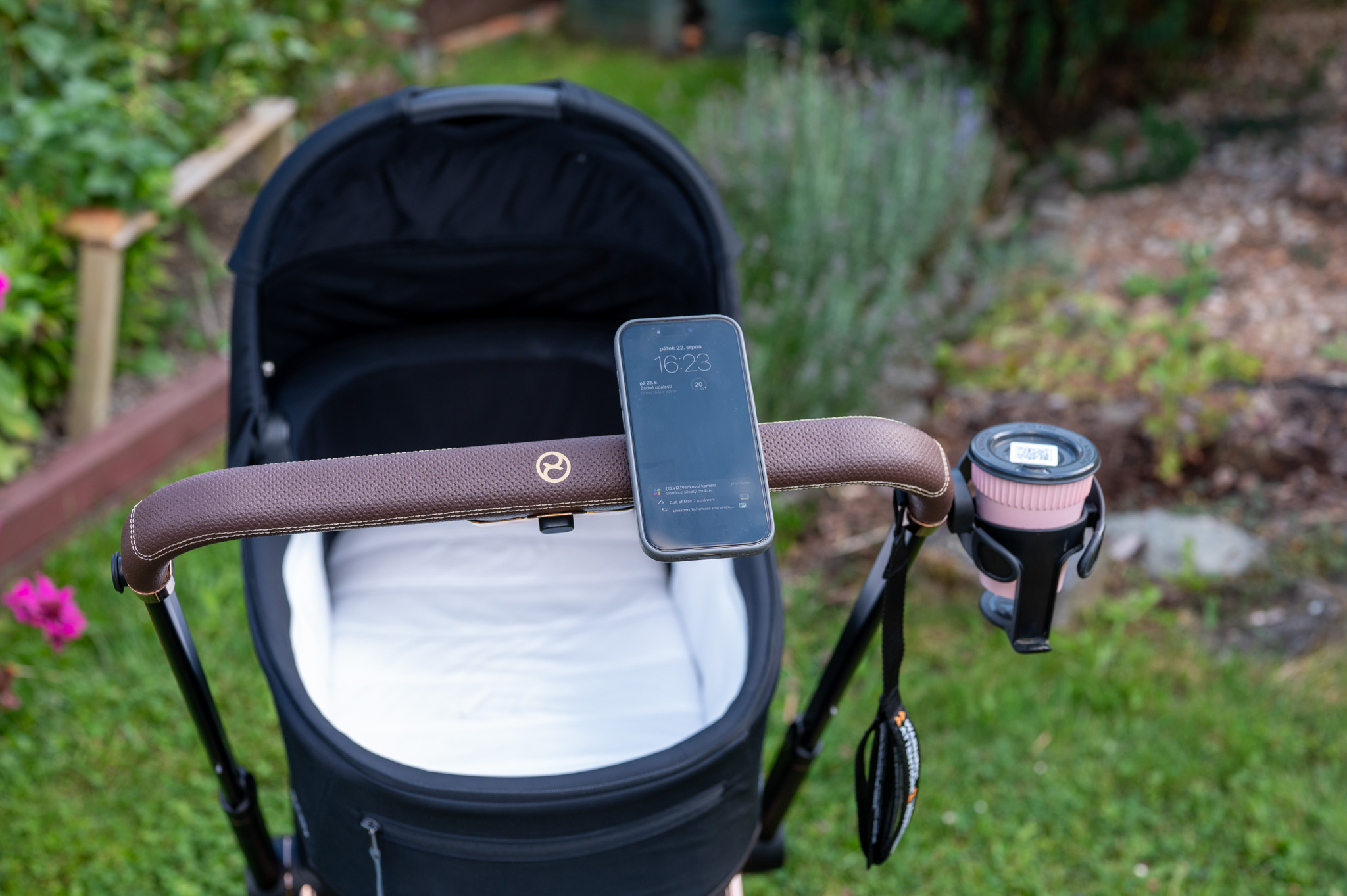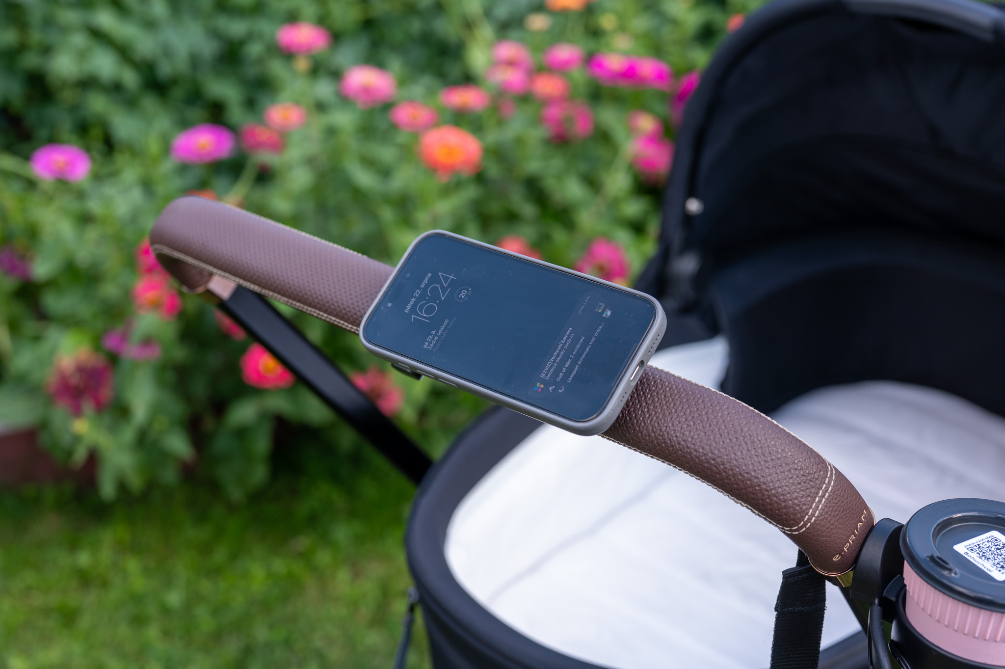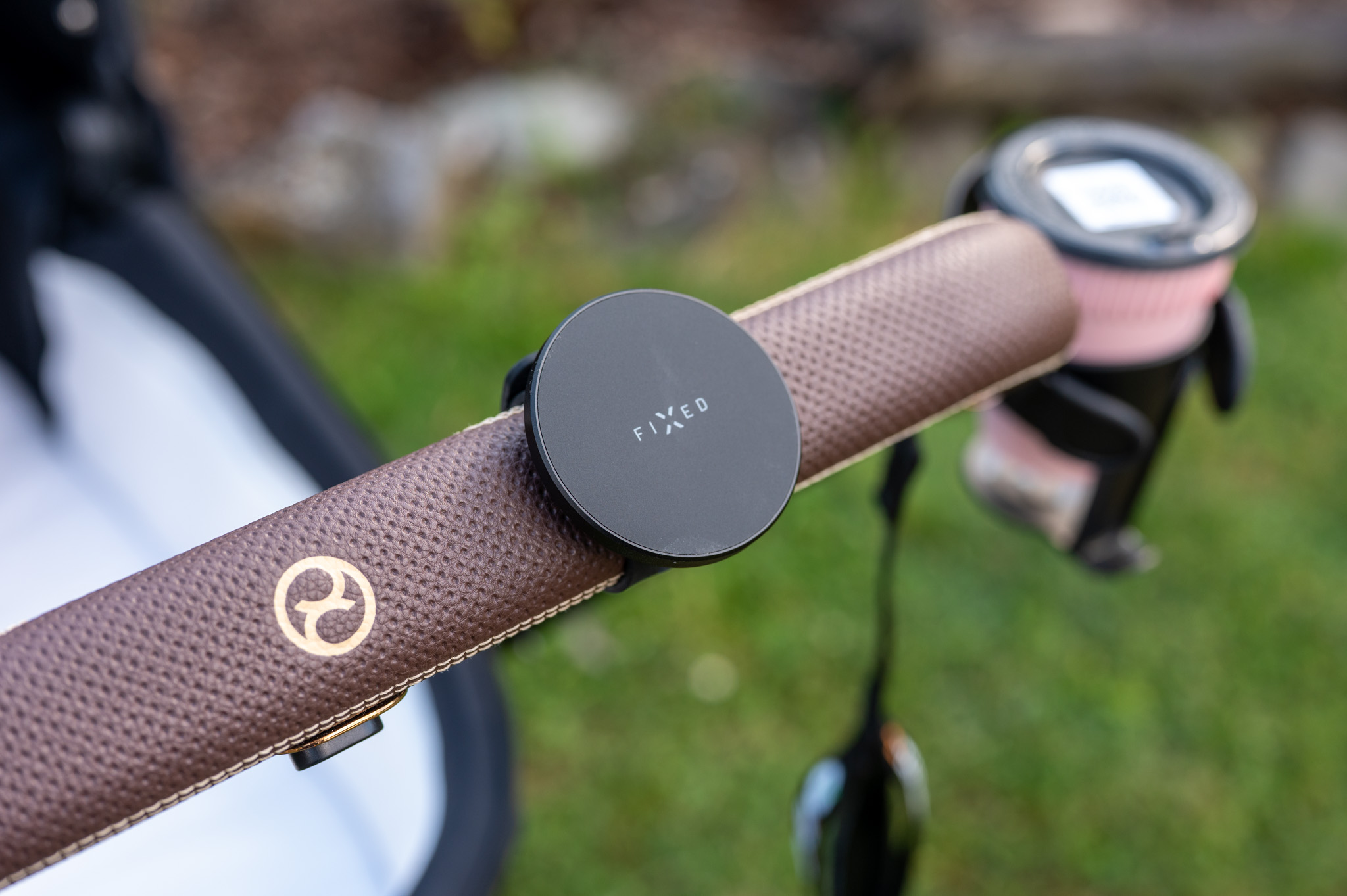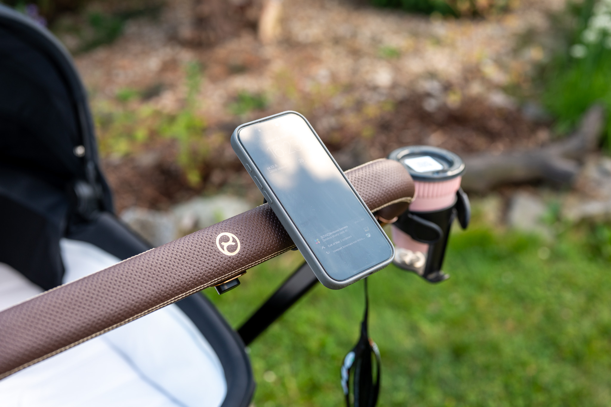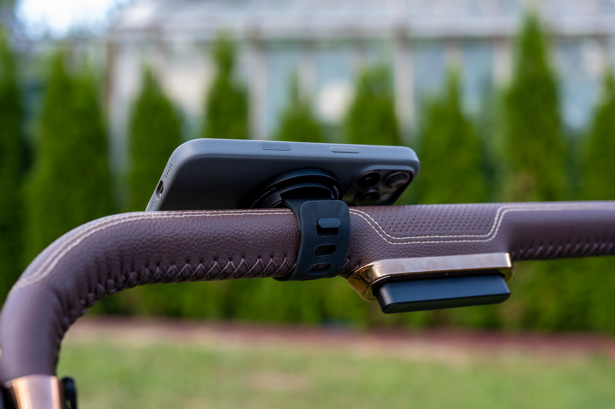 Samotný povrch držáku je pogumovaný, takže nehrozí škrábance, a rozměry 60 × 60 mm s váhou 73 g z něj dělají nenápadný, ale užitečný doplněk, který třeba právě na madlu kočárku nevypadá vůbec špatně a hlavně nezavazí (dáte-li si jej samozřejmě tak, aby byl mimo místo, kde rukojeti držíte).
