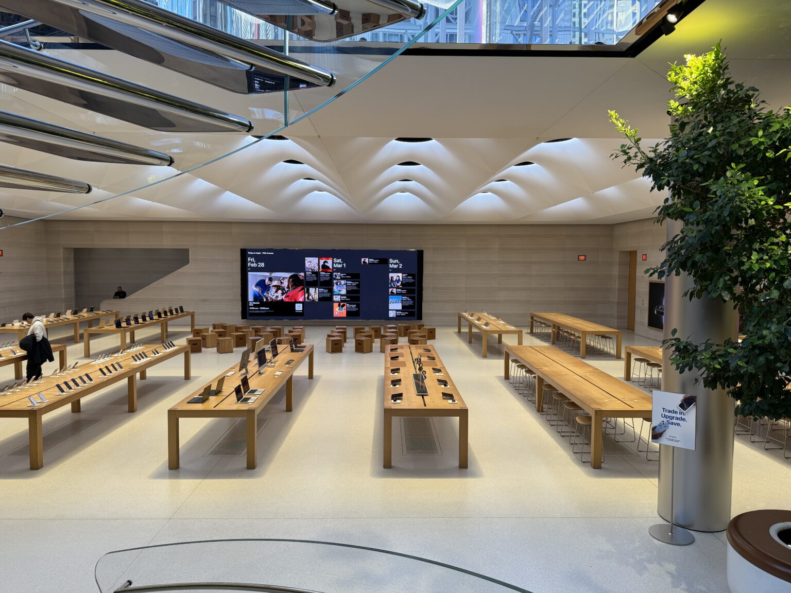 Nechybí pak ani fotografie, na které můžete vidět nejnovější a stále aktuální verzi Apple Store, kde Apple přidal množství světlíků, díky kterým využívá denní světlo k osvícení vnitřních prostor prodejny. Bohužel v současné době je celé náměstí včetně skleněné kostky zakryto střechou a obchod již nevypadá zdaleka tak dobře, jako dřív. Pokud tedy zavítáte do tohoto Apple Store, pak si cestou na toaletu prohlédněte sérii fotografií, které nikde jinde na světě neuvidíte.