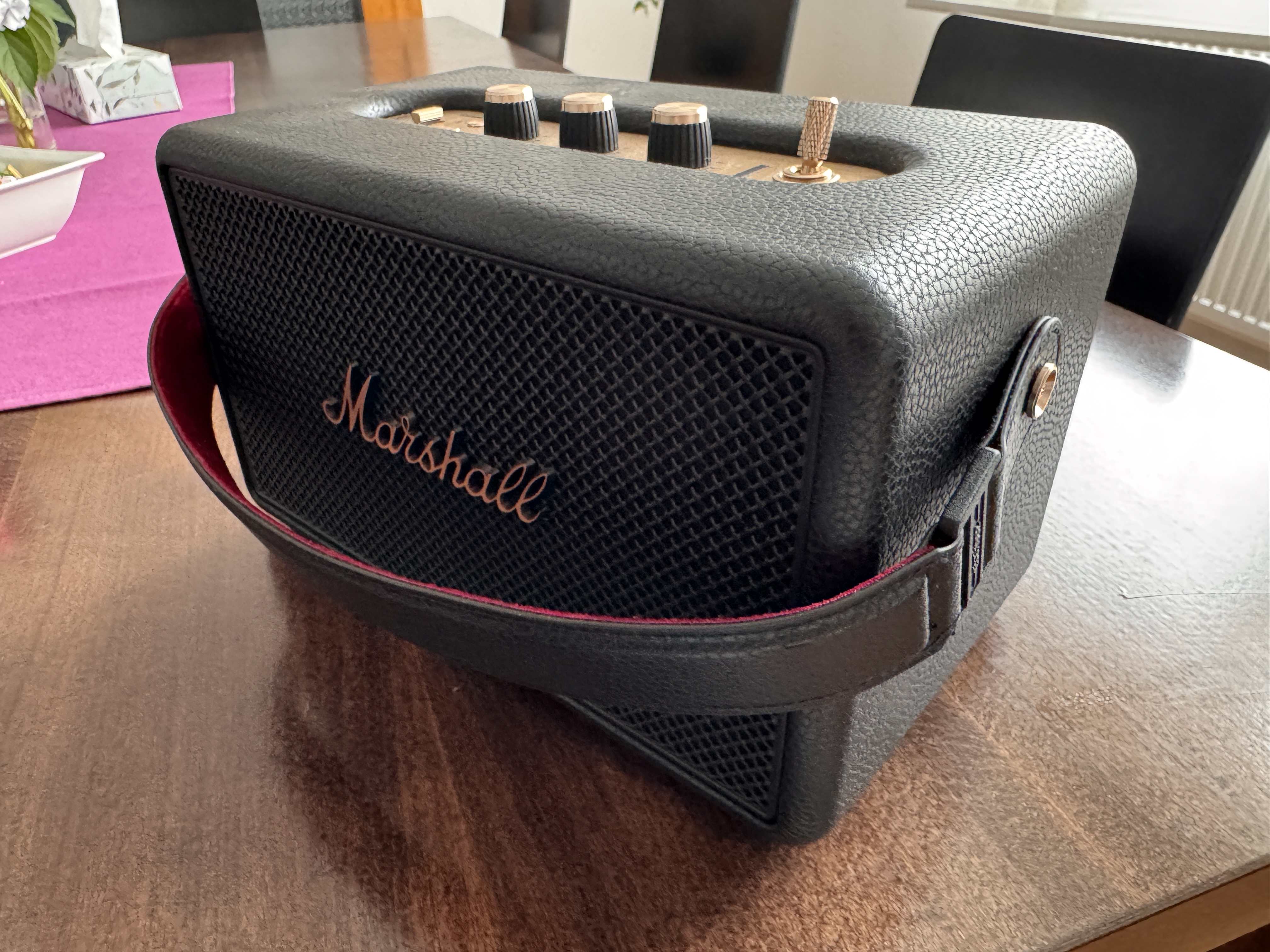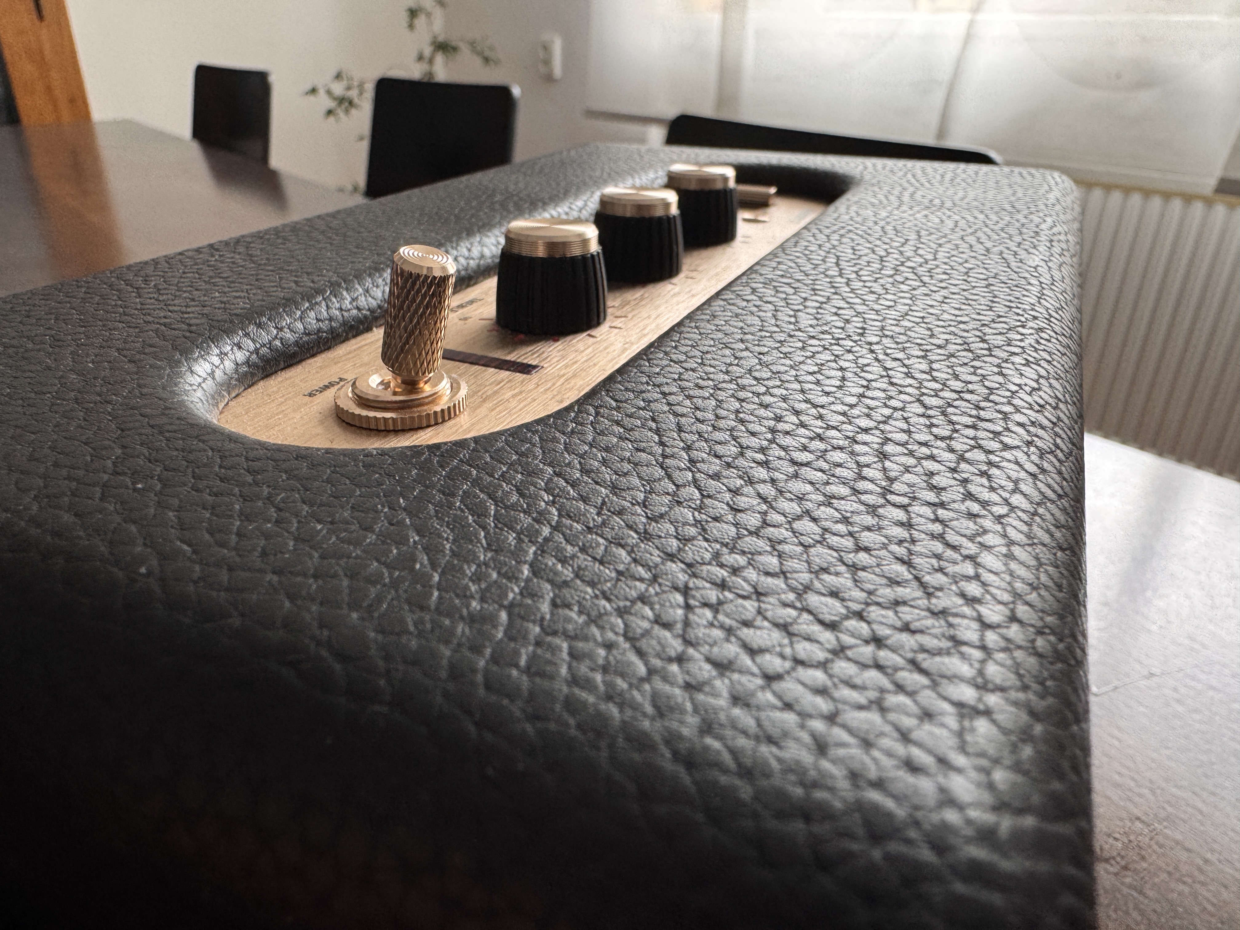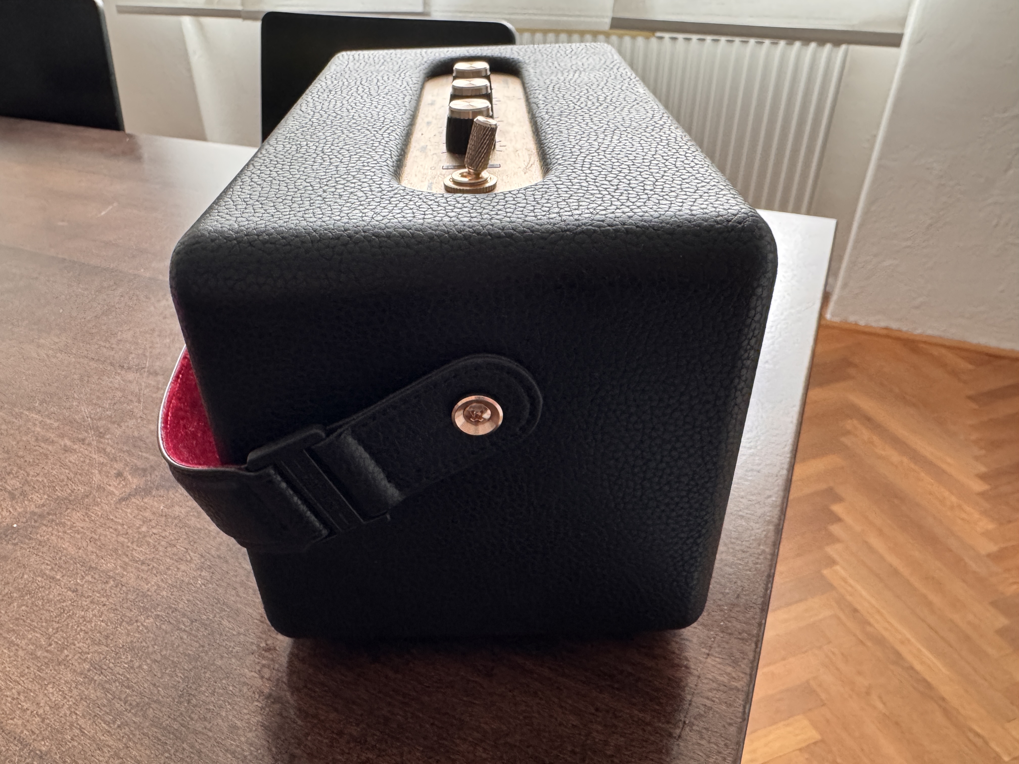 Největší kouzlo se však skrývá na horním ovládacím panelu. V době dotykových ploch a minimalistických tlačítek se Marshall drží osvědčené klasiky. A sice analogových ovládacích koleček. Zlatavý panel z broušeného kovu hostí tři hlavní otočné ovladače pro regulaci basů, výšek a celkové hlasitosti. Jejich chod je dokonale plynulý a přesný, což umožňuje jemné doladění zvuku přesně podle osobního vkusu, žánru hudby nebo akustiky prostředí. Co se týče přenosnosti, s hmotností okolo 2,5 kg se nejedná o kapesní zařízení, ale o poctivý kus hardwaru, který je stále dostatečně mobilní pro přenášení z místnosti do místnosti nebo na venkovní posezení. Klíčovým prvkem je zde praktický a stylový popruh, jehož design je inspirován kytarovými řemeny. Je pevný, pohodlný a dokonale doplňuje celkový vzhled. Kilburn III se nezalekne nečekané letní přeháňky na zahradní párty nebo náhodného polití u bazénu, a to díky certifikaci IP54.
