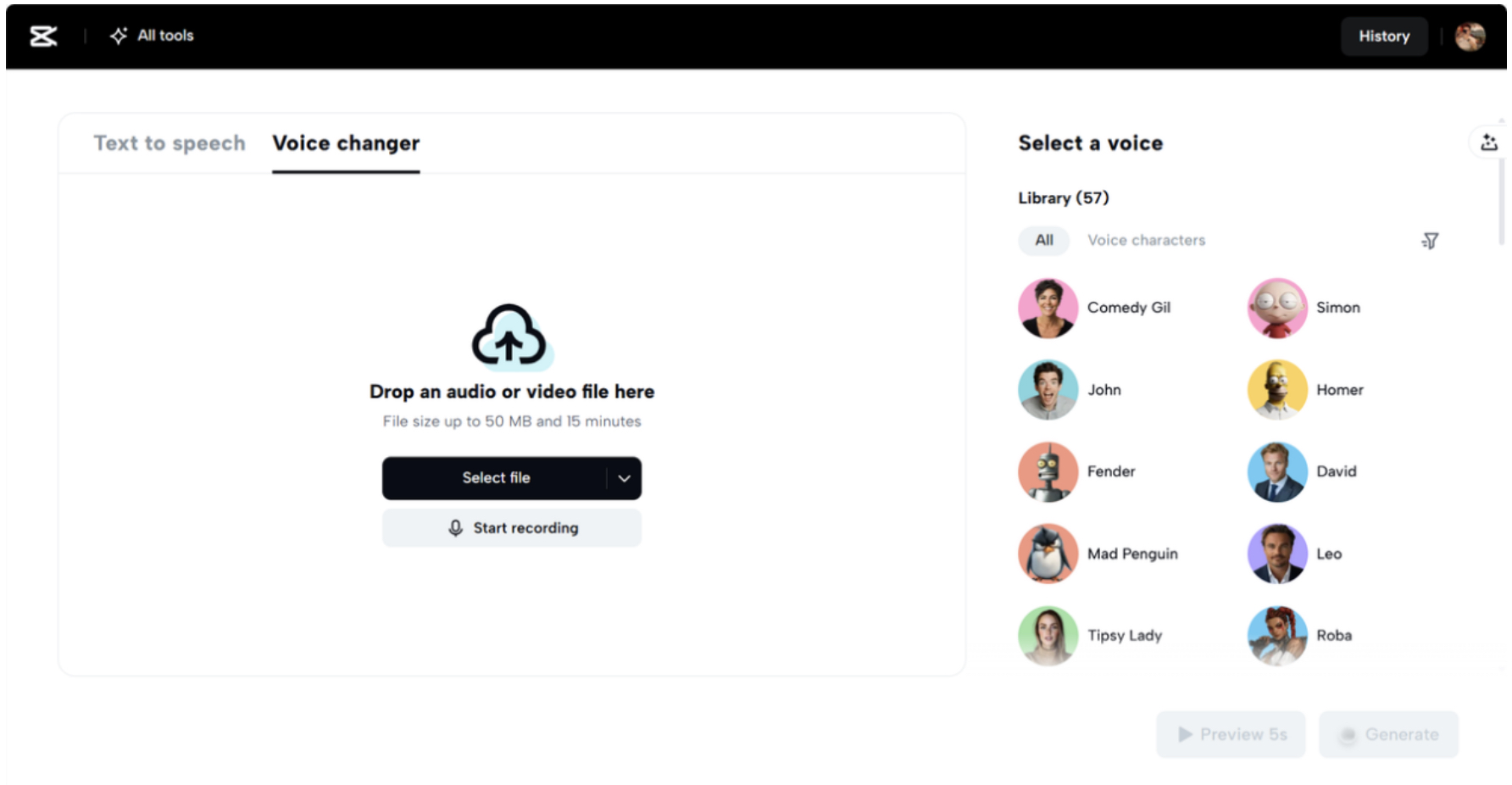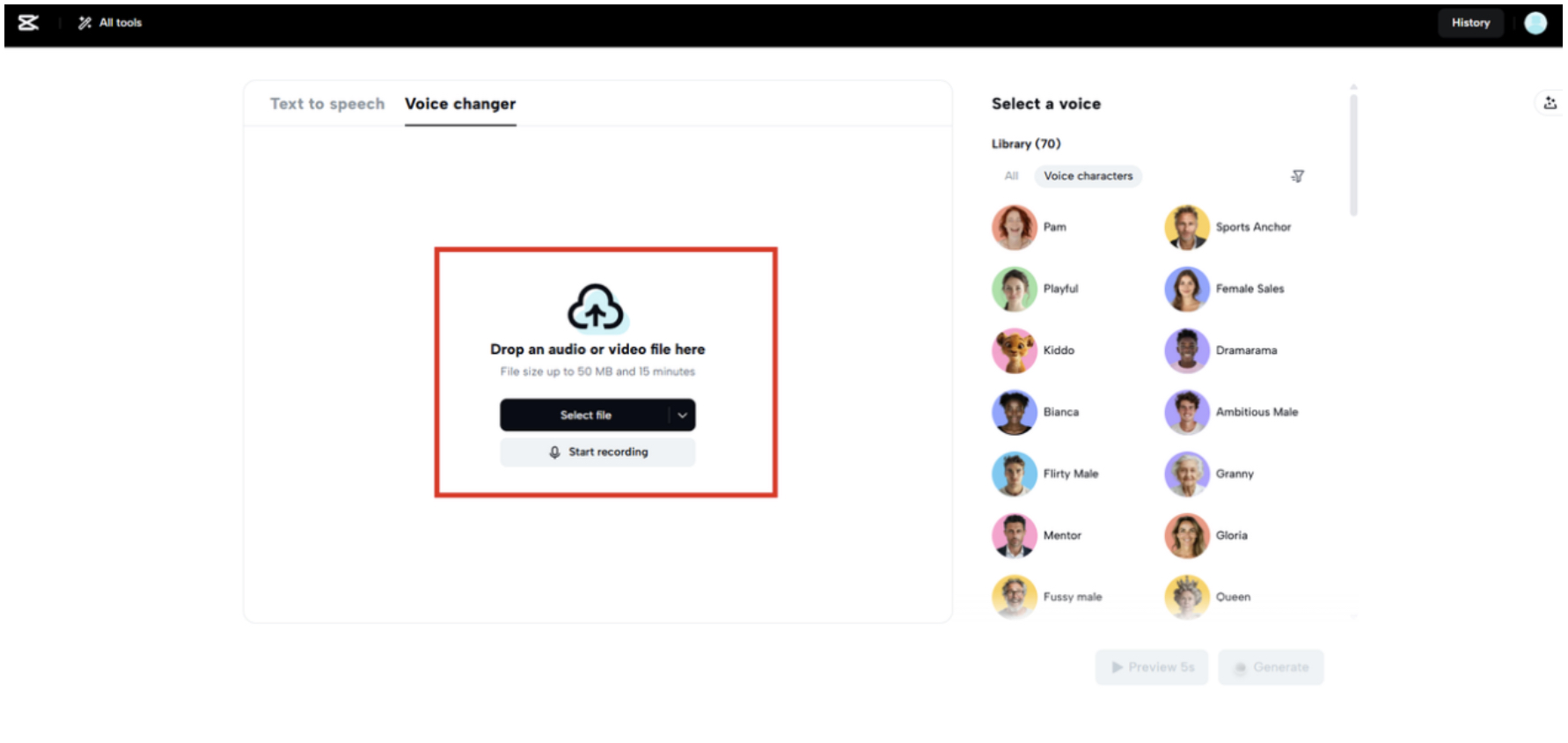 To access the AI-powered voice changer in CapCut Web, click the „Try for free“ button. Click on „Select file“ and upload your company presentation or training video. You can also drop files on the upload section The files can be up to 15 minutes or 50 MB. In case you prefer to introduce new talking points, tap on „Start recording“ and make your new records.