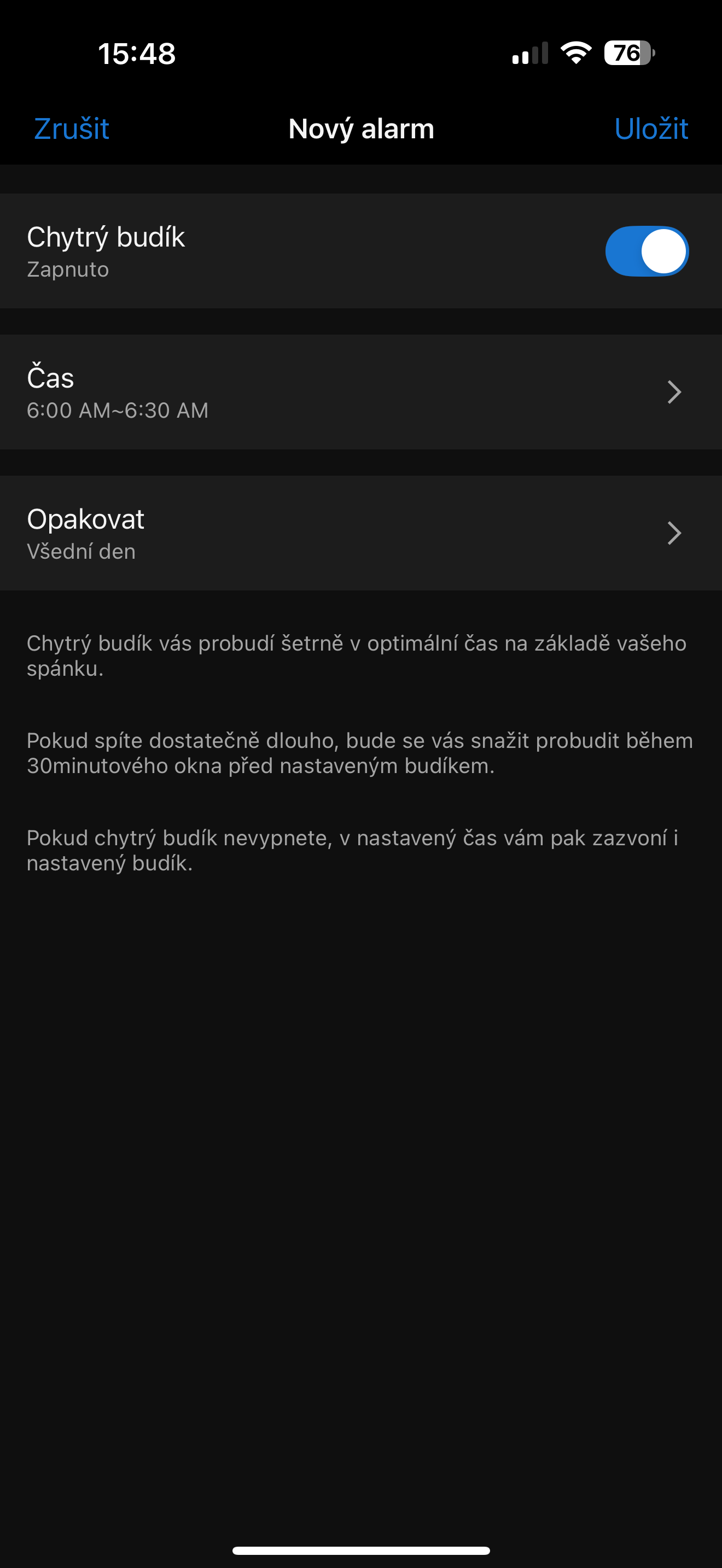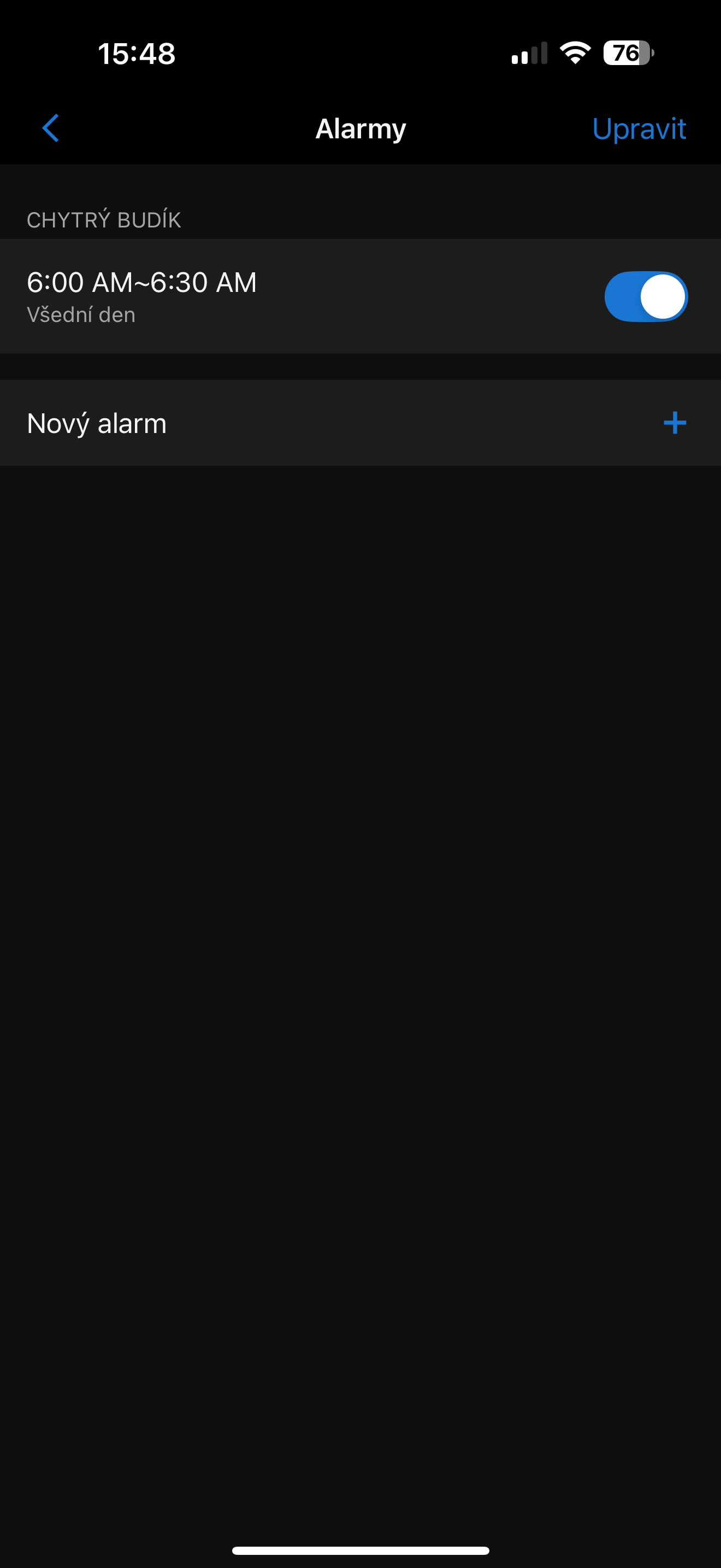 Garmin do svého spánkového trackeru integroval i funkci chytrého budíku. V aplikaci si nastavíte čas a v jeho rozpětí vás bude Monitor budit podle toho, jakou fází spánku aktuálně spíte. Dělá tak vibracemi, které si jde nastavit ve třech intenzitách, zvuk přítomen není. Dvojím klepnutím do Monitoru budík odložíte o 10 minut, když do něho klepnete 4×, vypnete jej. Pokud ho sundáte ještě před budíkem, tak se samozřejmě spánek ukončí a budík se neaktivuje. Nemusíte nikde nic spouštět ani vypínat, vše funguje automaticky.