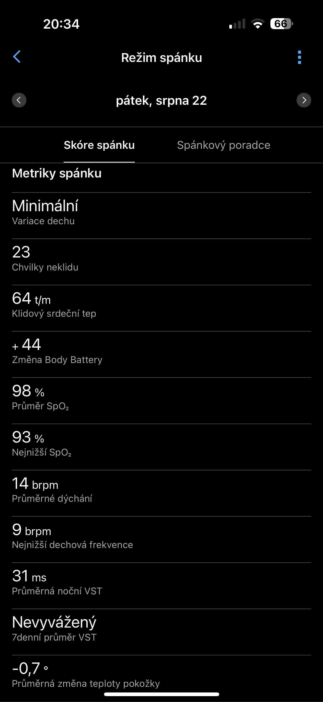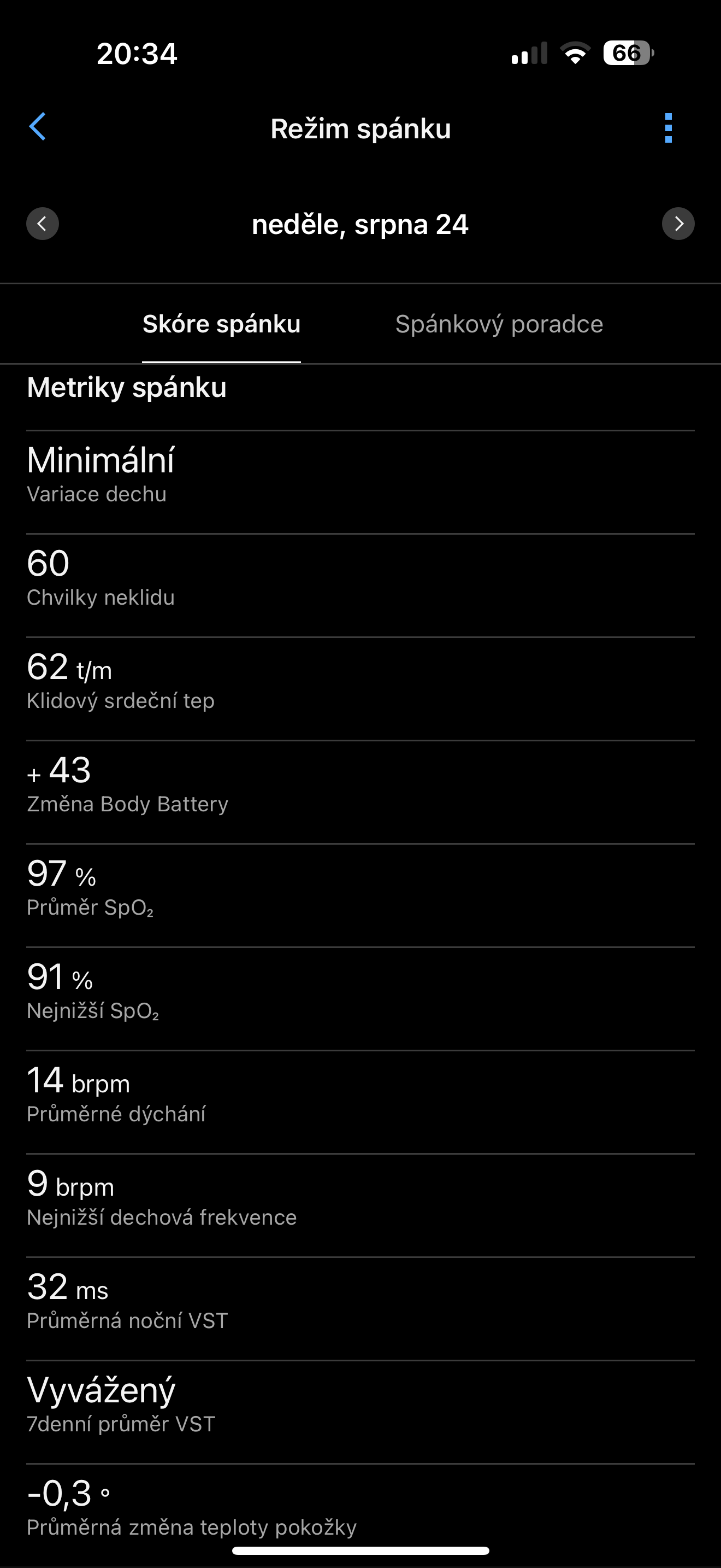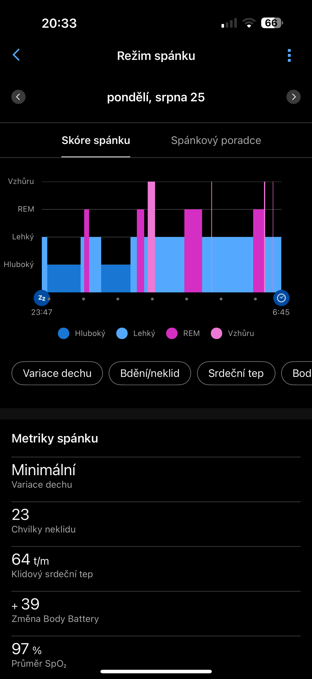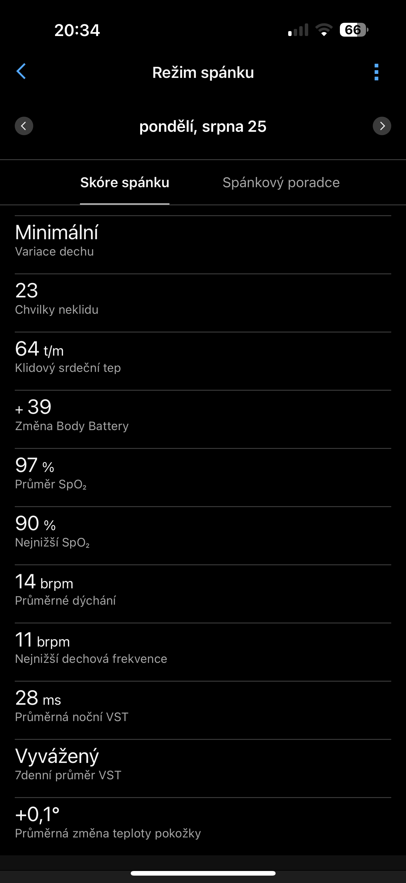 Můžete si toho všimnout, když stihnete přečíst ranní zprávu dřív, než se mezi sebou zařízení propojí. Zajímavé je, že Monitor mi při zkoušení spaní i s hodinkami na ruce naměřil vždy vyšší hodnoty. To přisuzuji jednoduše tomu, že si hodinky na noc na zápěstí povoluji, aby se mi v nich pohodlněji spalo, a proto nejsou naměřené hodnoty tak přesné.