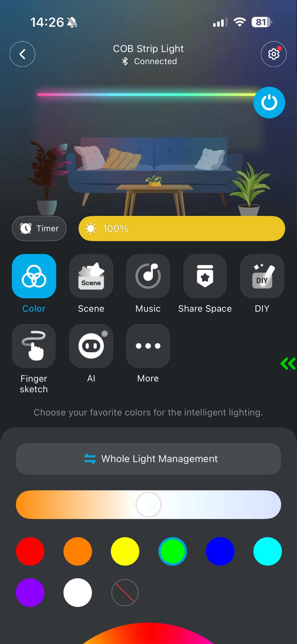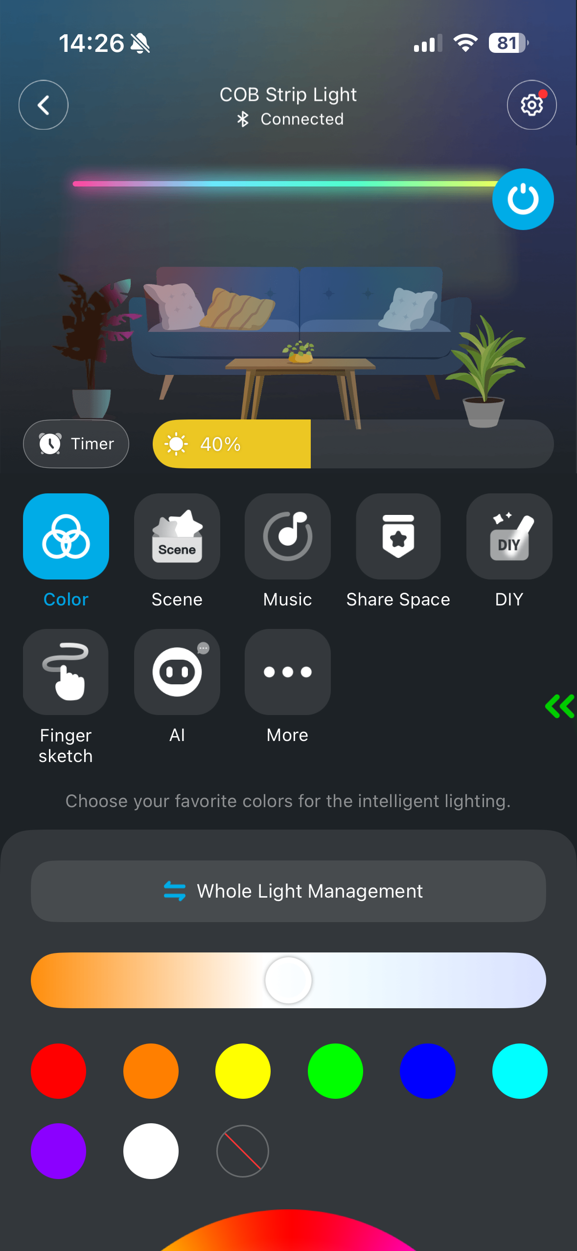 Barevné možnosti jsou prakticky neomezené. Díky technologii RGBICW dokáže pásek zobrazit nejen 16 milionů barev, ale také různé odstíny bílého světla (W – White). Na rozdíl od starších RGB pásků, které umí zobrazit vždy jen jednu barvu po celé délce, technologie RGBIC (Independent Control) umožňuje ovládat barvu jednotlivých segmentů pásku nezávisle. Govee Ultra Bright RGBICW Pro je rozdělen na 12 samostatně ovladatelných segmentů na metr, což otevírá dveře k vytváření úchvatných barevných přechodů, duhových efektů a dynamických scén. Pásek dokáže zobrazit až 57 různých barev najednou, což vytváří živé a plynulé světelné show.