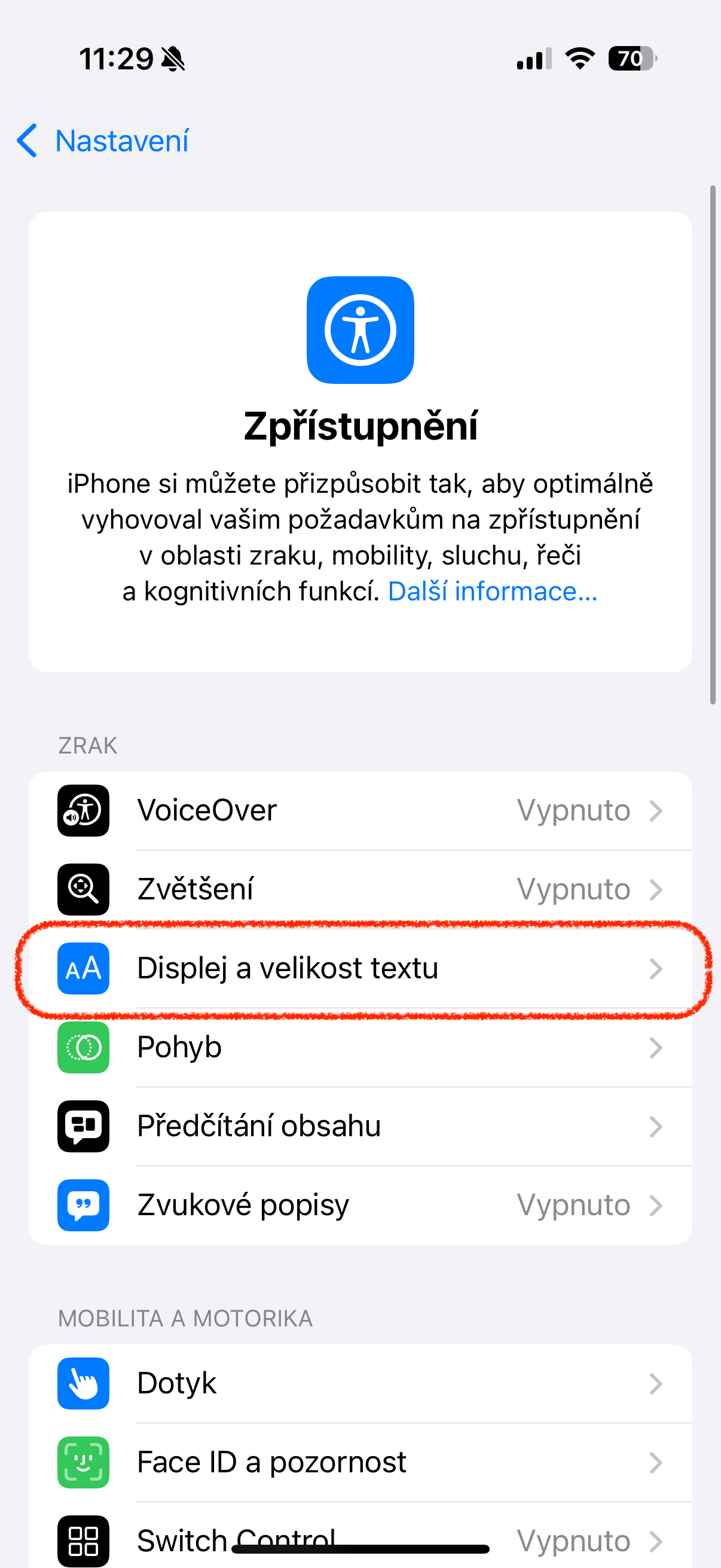 Možnost snížit jas displeje pod minimální výchozí úroveň je skryta ve Zpřístupnění. Konkrétně je třeba:
