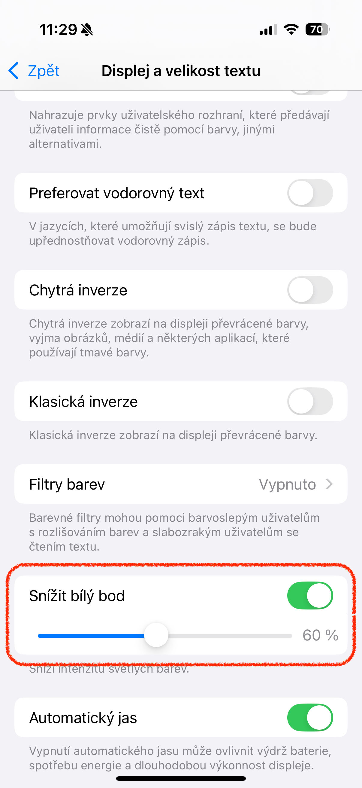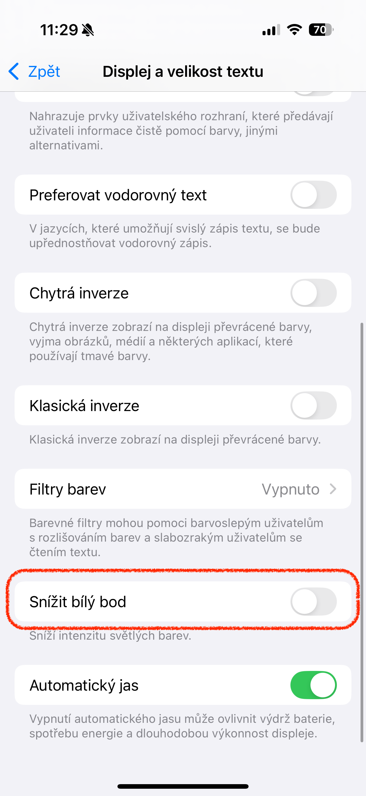 - Scrollovat dolů a zde aktivovat možnost Snížit bílý bod s tím, že poté si lze nastavit, jak moc má jas displeje klesnout