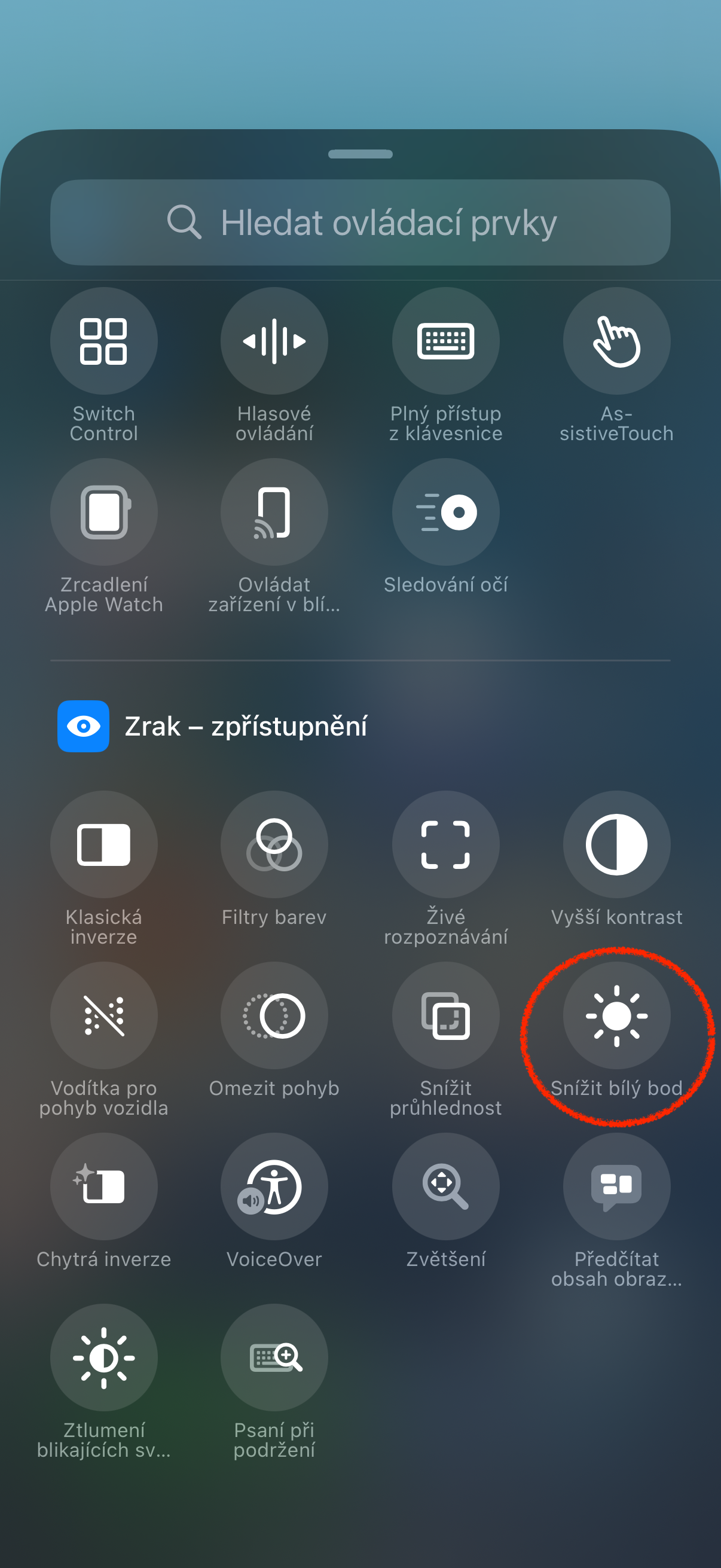 - Zvolit možnost Přidat ovládací prvek s tím, že je třeba scrollovat úplně dolů do Zrak – zpřístupnění a zde si přidat ikonu Snížit bílý bod.