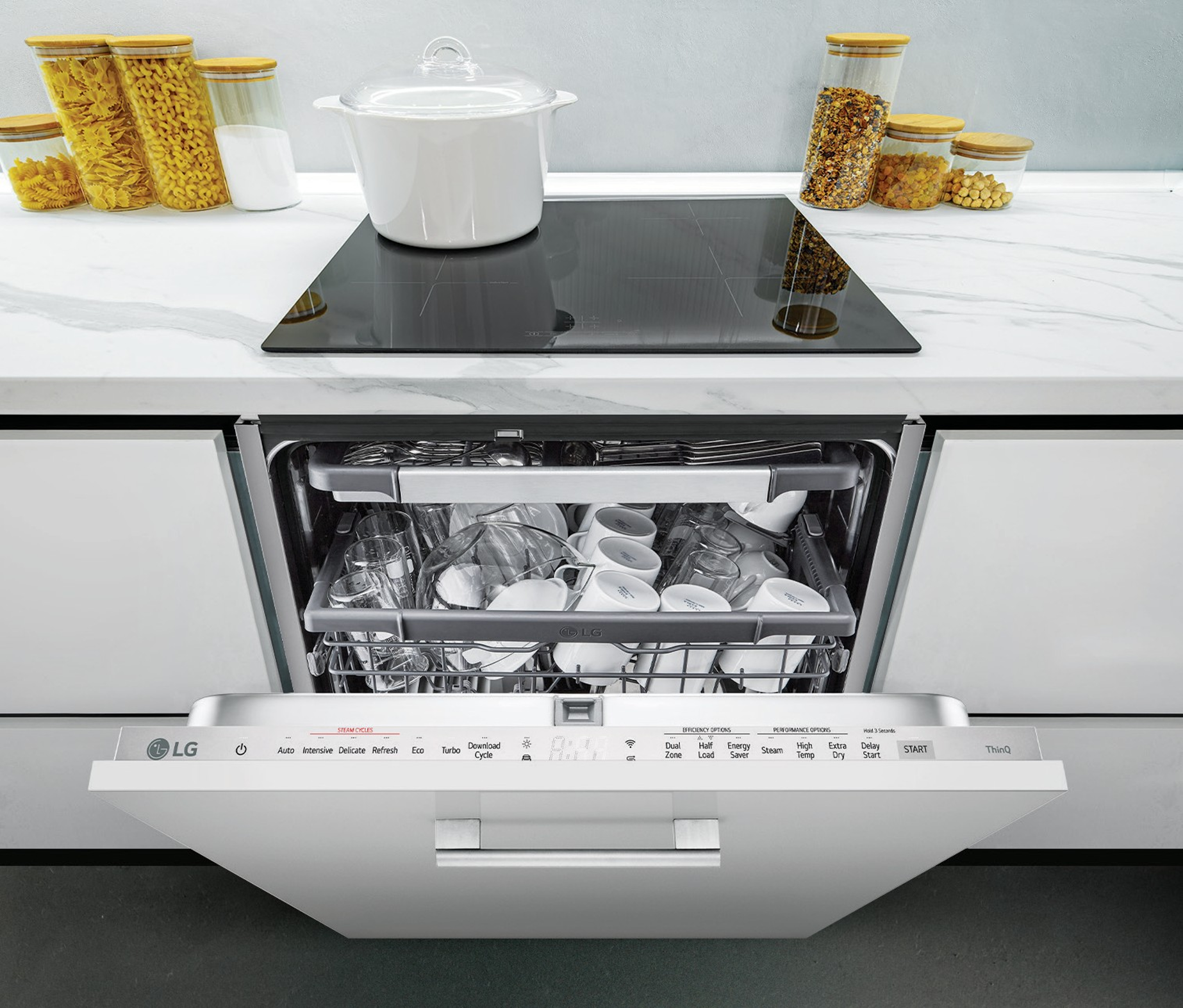 Vestavné myčky nádobí od LG jsou vybaveny inovativními technologiemi pro dokonalou čistotu a maximální efektivitu. Systém QuadWash™ s vícesměrnými tryskami myje nádobí ze všech úhlů, zatímco funkce TrueSteam™ s párou zaručuje hygienickou čistotu. Invertorový DD motor zajišťuje nejen tichý provoz, ale i dlouhou životnost. Osvětlení Info. osvětlení promítané na podlahu informuje o stavu mycího cyklu.