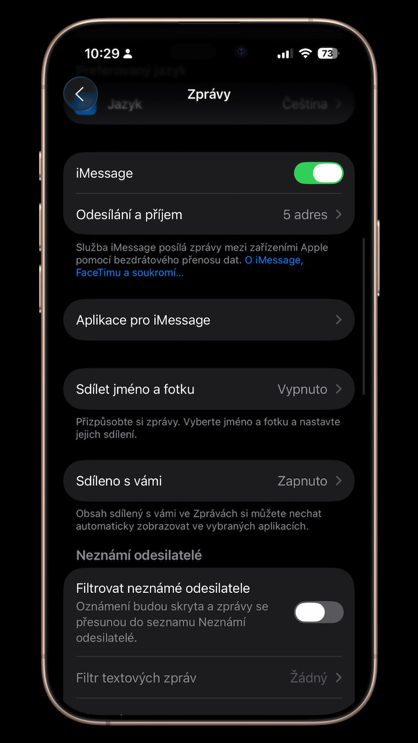 Po odebrání neaktivní SIM je nutné znovu aktivovat iMessage. To uděláte v Nastavení → Aplikace → Zprávy → Odesílání a příjem, kde vyberete zobrazené telefonní číslo.