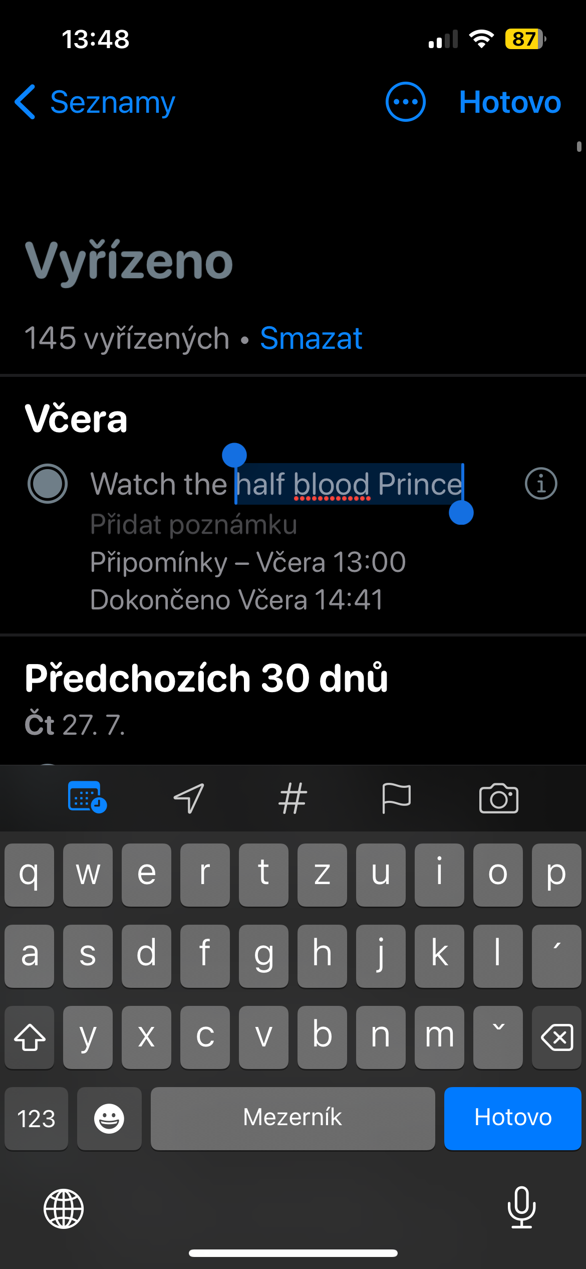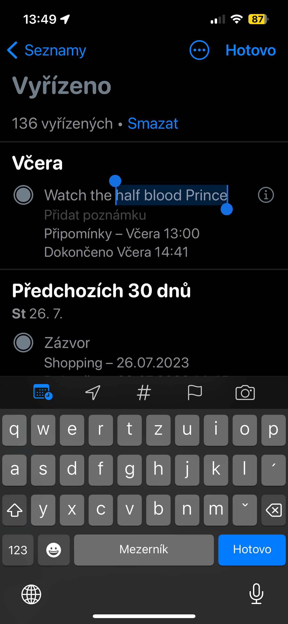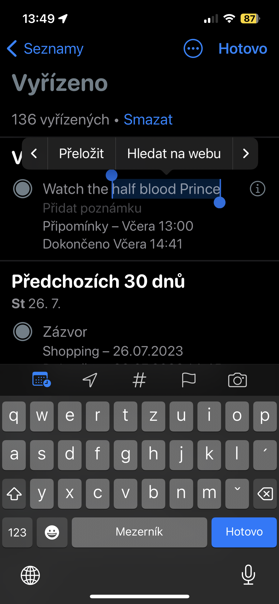 - Otevřete aplikaci Připomínky a vyberte připomínku obsahující text, který chcete vyhledat.