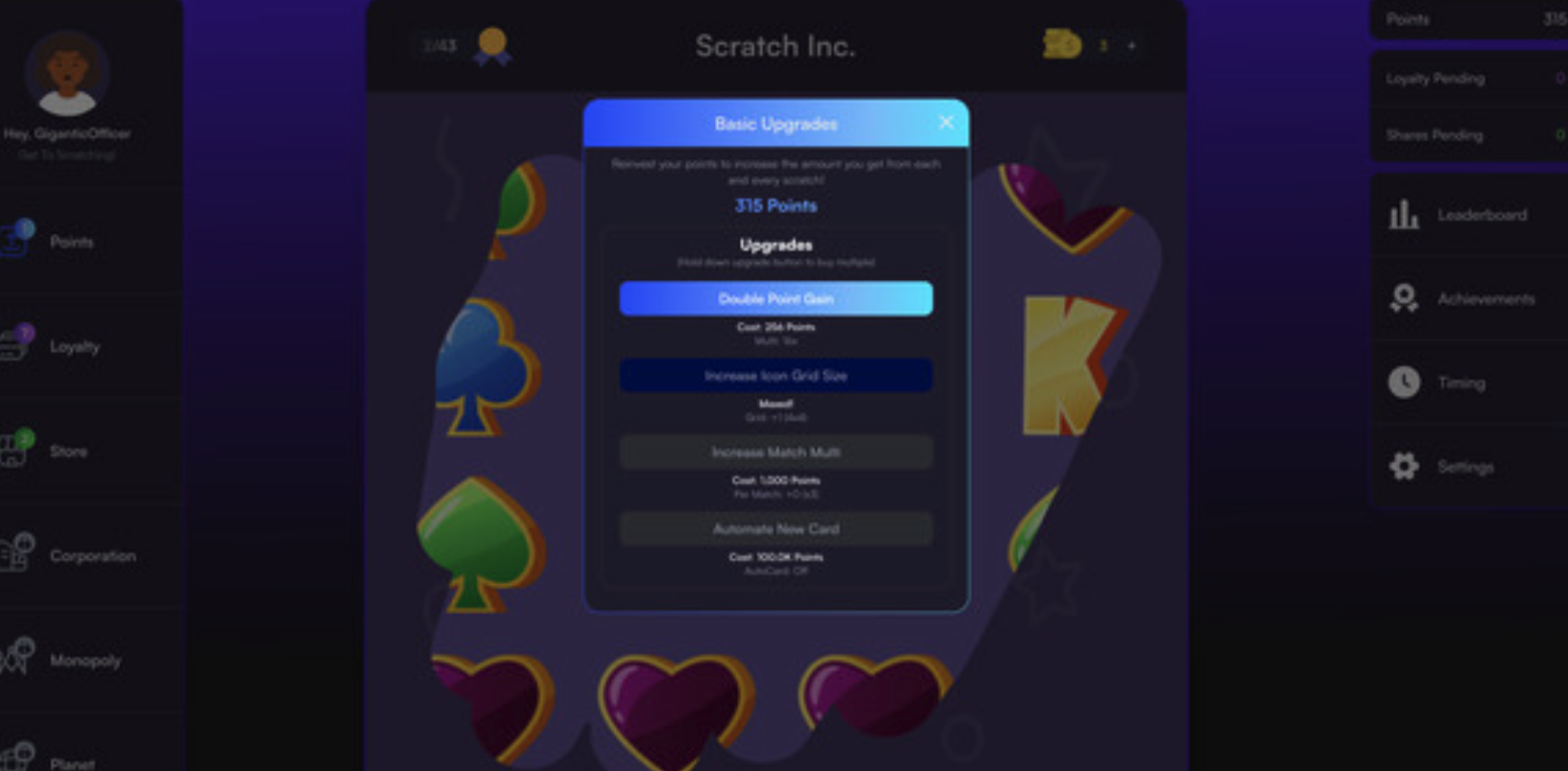 Scratch Inc.: Build an Empire, From Scratch je oddechová hra, ve které hráči budují své impérium pomocí stíracích karet. Za jejich odhalování získávají body, které lze dále násobit upgrady, automatizací a postupným rozšiřováním možností hry. Díky systému prestiže je možné resetovat postup a zároveň se posouvat hlouběji napříč vrstvami progrese. Hra nabízí také odměny za úspěchy, globální žebříčky a možnost hraní offline bez reklam a časových omezení. Scratch Inc. tak spojuje jednoduchý koncept se světem nekonečných čísel a strategického růstu.