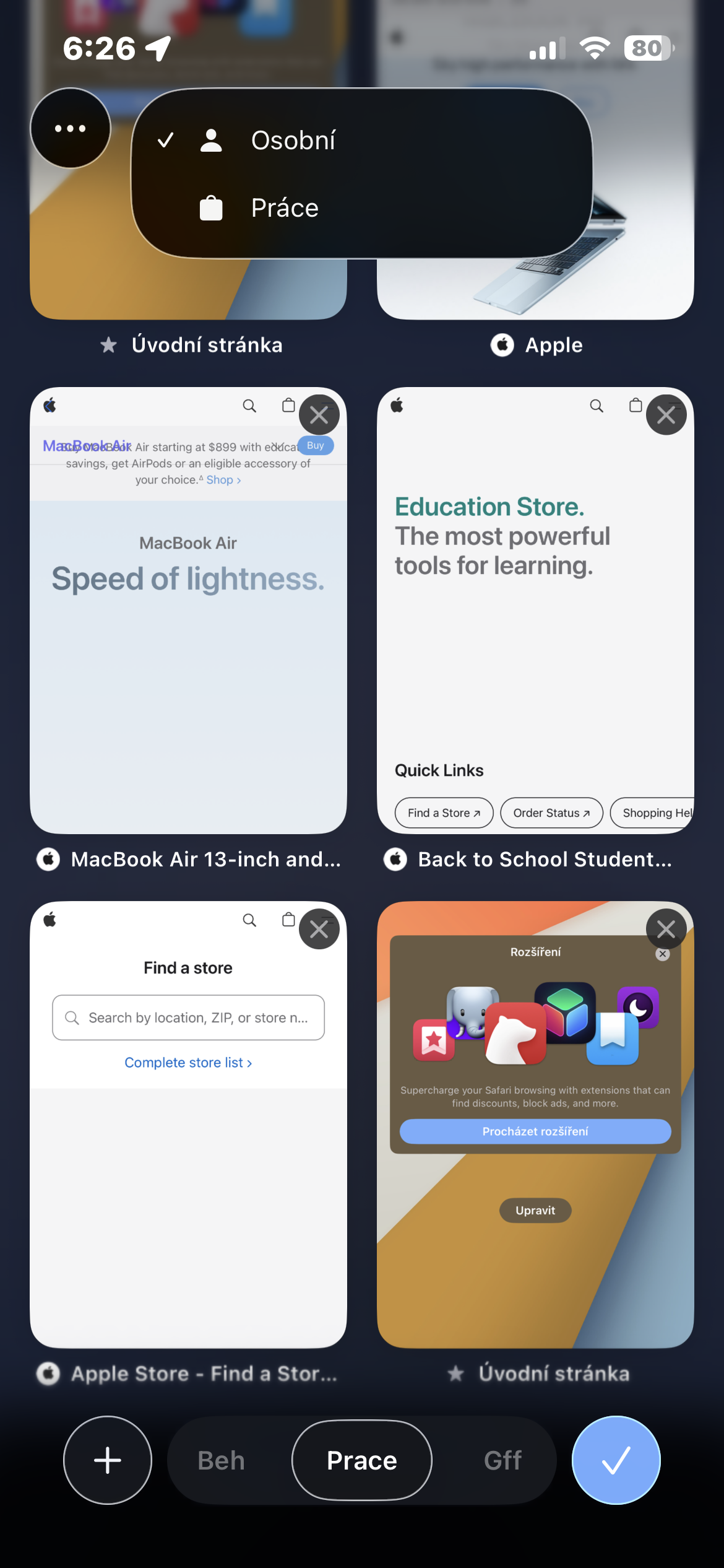 Apple přidal do Safari v iOS 26 nový kompaktní režim zobrazení, ve kterém jsou některé funkce (např. sdílení nebo záložky) schované pod ikonou se třemi tečkami. Tento režim šetří místo, ale může být méně pohodlný pro ty, kdo často mezi funkcemi přepínají. Stále ale zůstává možnost přepnout zpět na klasické horní nebo spodní zobrazení známé z předchozích verzí. Správa karet rovněž prošla výrazným zjednodušením – jednotlivé karty lze vzájemně přehazovat pomocí gesta, přibyl přehled aktuálního počtu otevřených panelů a rychlé přepínání mezi profily.