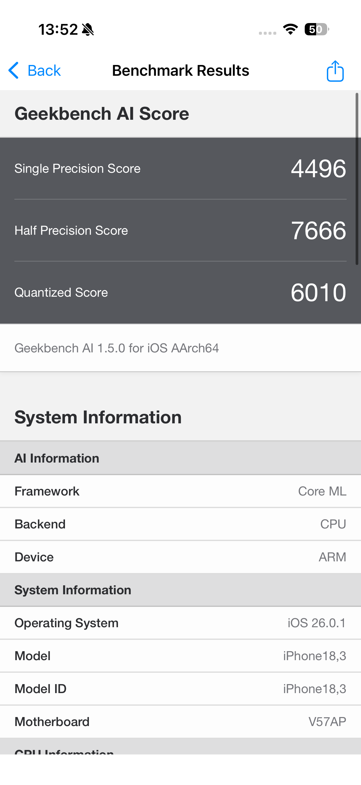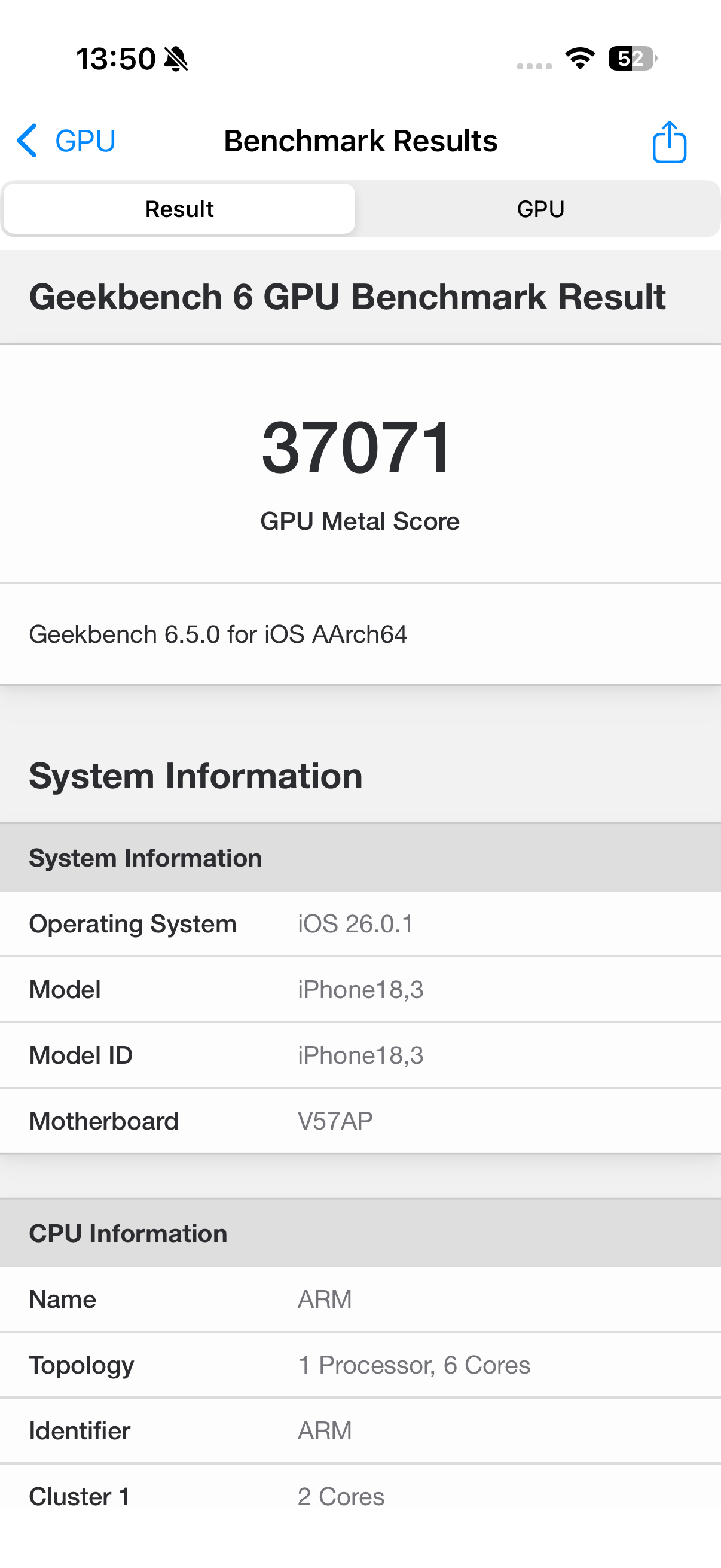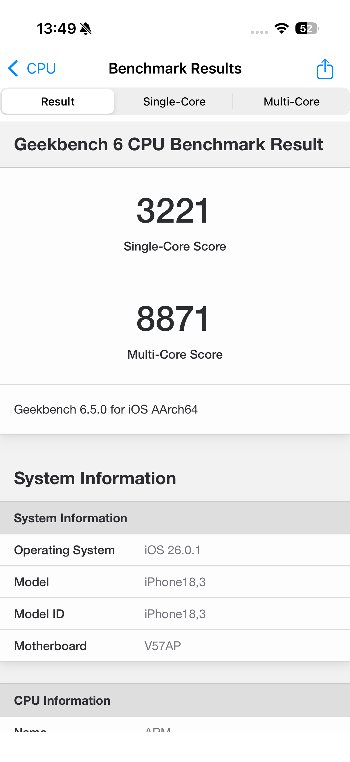Tedy, iPhone 17 například mírně pomaleji spustil například AAA hry typu Assassin’s Creed nebo třeba Hitman: Absolution, ale bavíme se skutečně o nepatrném rozdílu v řádu jednotek vteřin. Na nedostatečný výkon, který by vás jakkoliv omezoval, si tu tedy rozhodně stěžovat nebudete. Ostatně, ještě aby ano. Vždyť čip A19 nabízí stejně jako A19 Pro 6jádrové CPU se 2 výkonnostními a 4 úspornými jádry, přičemž hlavní rozdíl tkví v tom, že má „jen“ 5jádrové GPU, zatímco A19 Pro z iPhonu 17 Pro má 6jádrové GPU. Pro lepší představu o výkonu nicméně naleznete níže ve screenshotech z benchmarkové aplikace Geekbench.