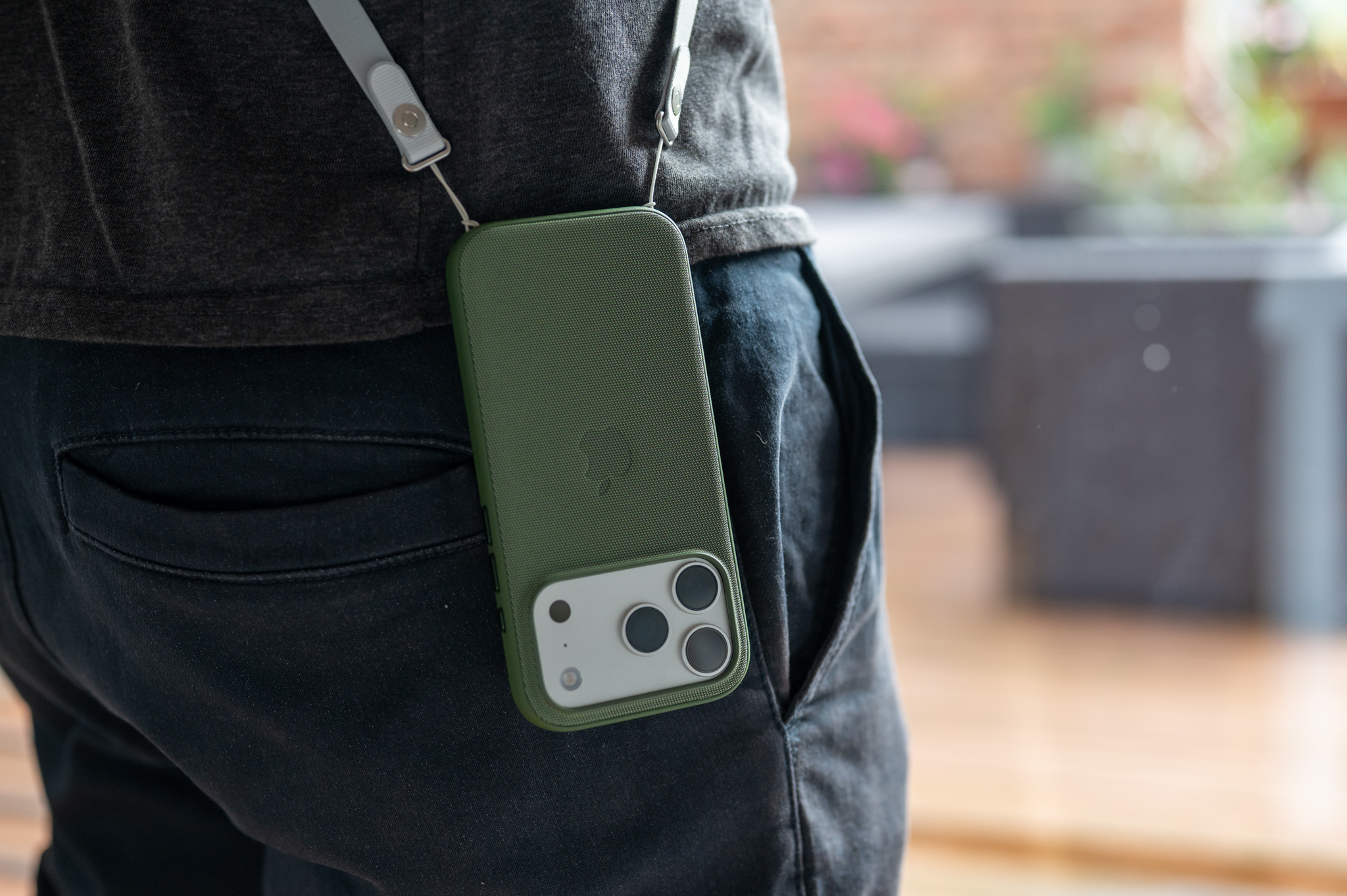 Šířka popruhu je 12 mm, což je za mě dobrý kompromis mezi minimalistickým designem a popruhem, který se vám nebude nepříjemně zařezávat do ramene kvůli hmotnosti telefonu. Respektive, neměl by. Já osobně jsem popruh testoval se všemi letos vydaným iPhony a musím říci, že ani v případě Pro Max modelu mi nepřišlo, že by měl popruh tendenci se nějak zásadně zařezávat. Nejvíce času jsem jej pak používal v kombinaci s iPhonem 17 Pro a Air, které jsem na něm prakticky necítil. V tomto směru si tedy nemůžu absolutně stěžovat. A to samé v bledě modrém pak platí i o tom, jak drží popruh na ramenu. Protože je vyroben z matného materiálu, nemá tendenci z vás jakkoliv klouzat a to ani v případě, že si vezmete například šusťákovou bundu s lesklejším povrchem.