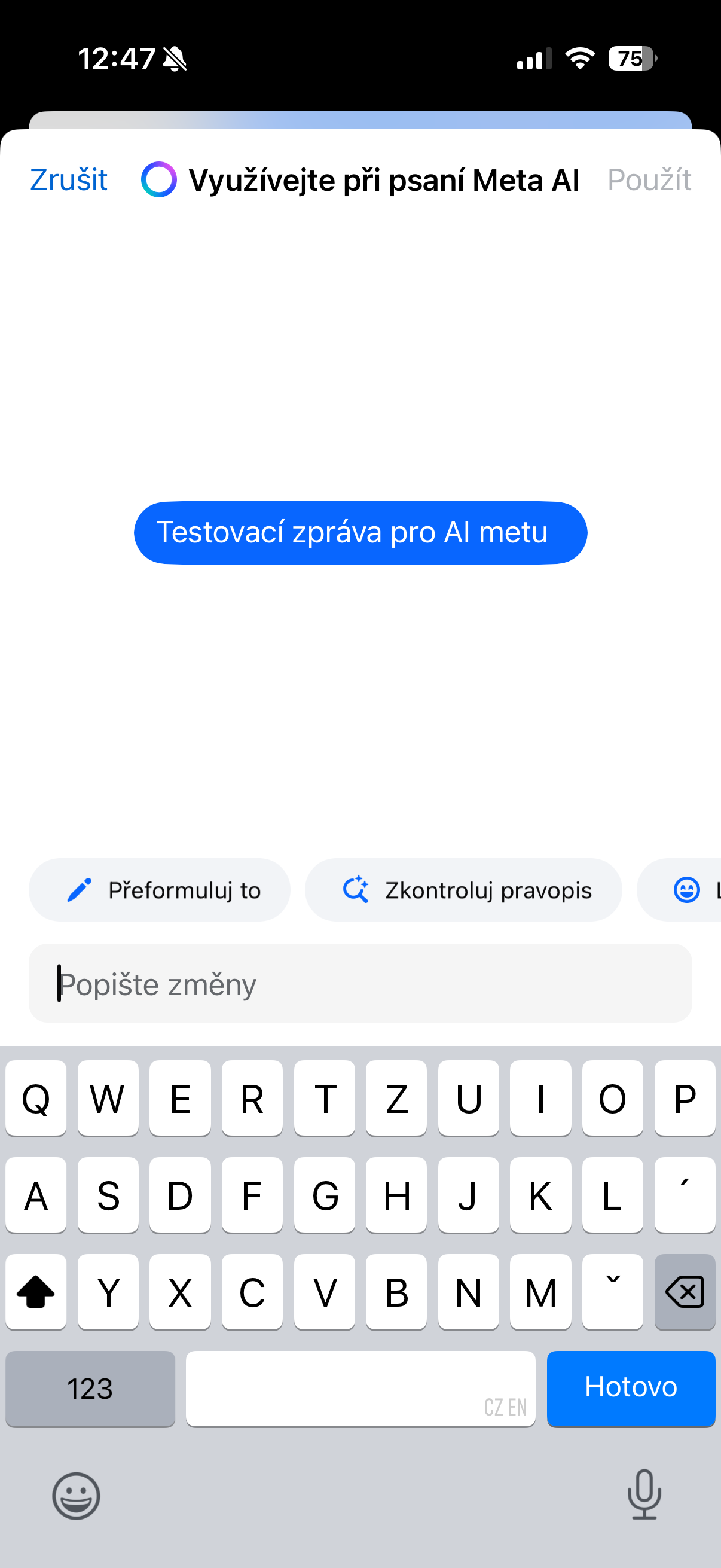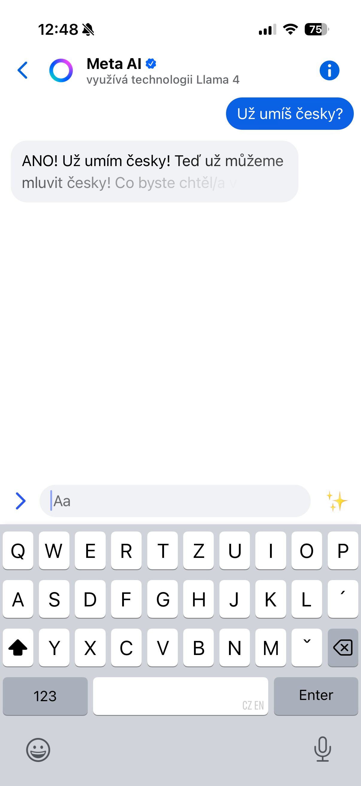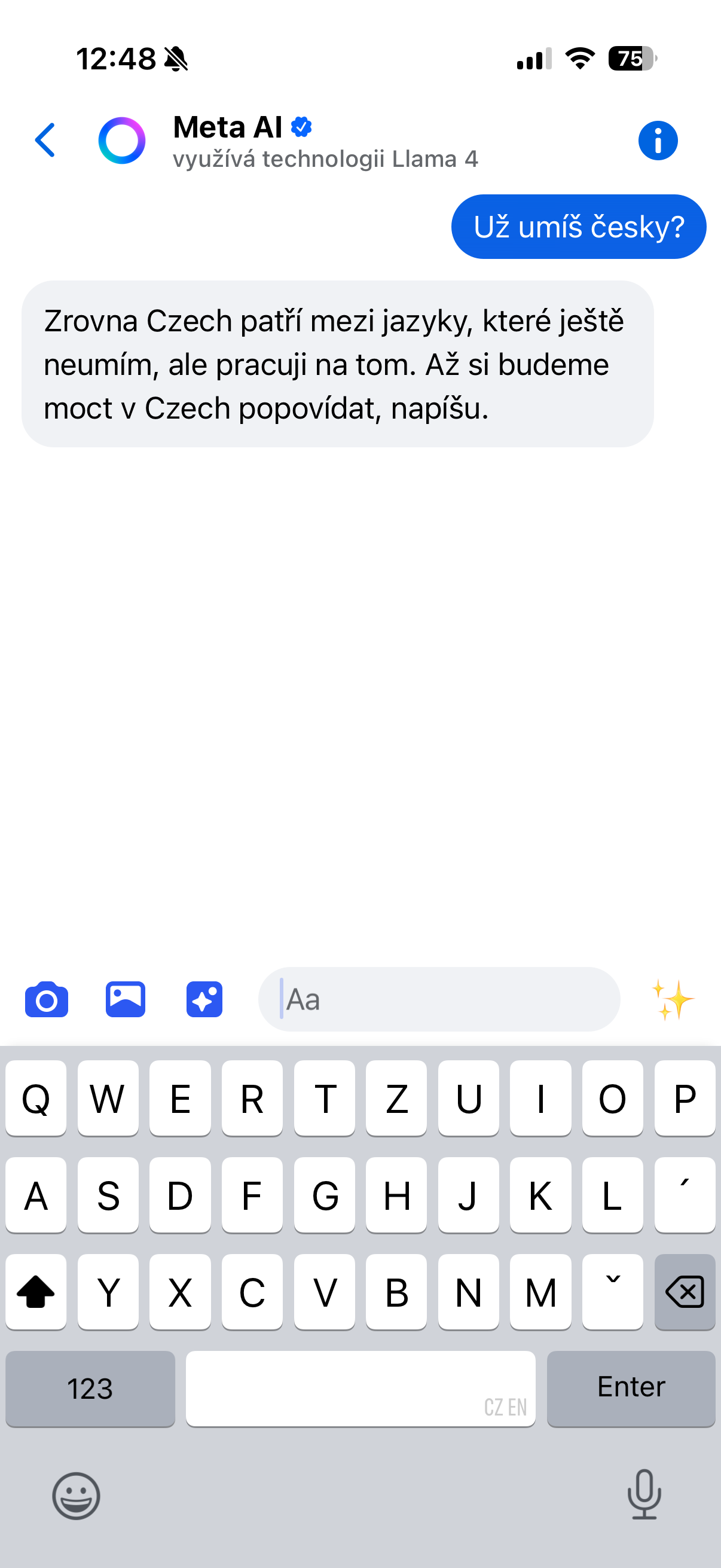 Jak můžete sami vidět, do Messengeru přibyly nové ikony pro AI funkce při psaní či posílání fotek. Háček je však v tom, že jakmile na ně tapnete, vše je v nich sice k dispozici v češtině, nicméně nic se nestane, protože daná funkce vždy selže a oznámí to hláškou „Něco se nepovedlo“. Stejně tak se stále nechce mluvit česky Meta AI ve vlákně chatu. I nadále je sice v jeho rozepsané zprávě vidět, že česky umí docela dobře, nicméně nakonec se vám odešle zpráva, ve které Meta AI tvrdí, že češtinu zatím neovládá. Nechme se tedy překvapit, na jak dlouho. Přípravy na spuštění jsou totiž čím dál tím evidentnější.