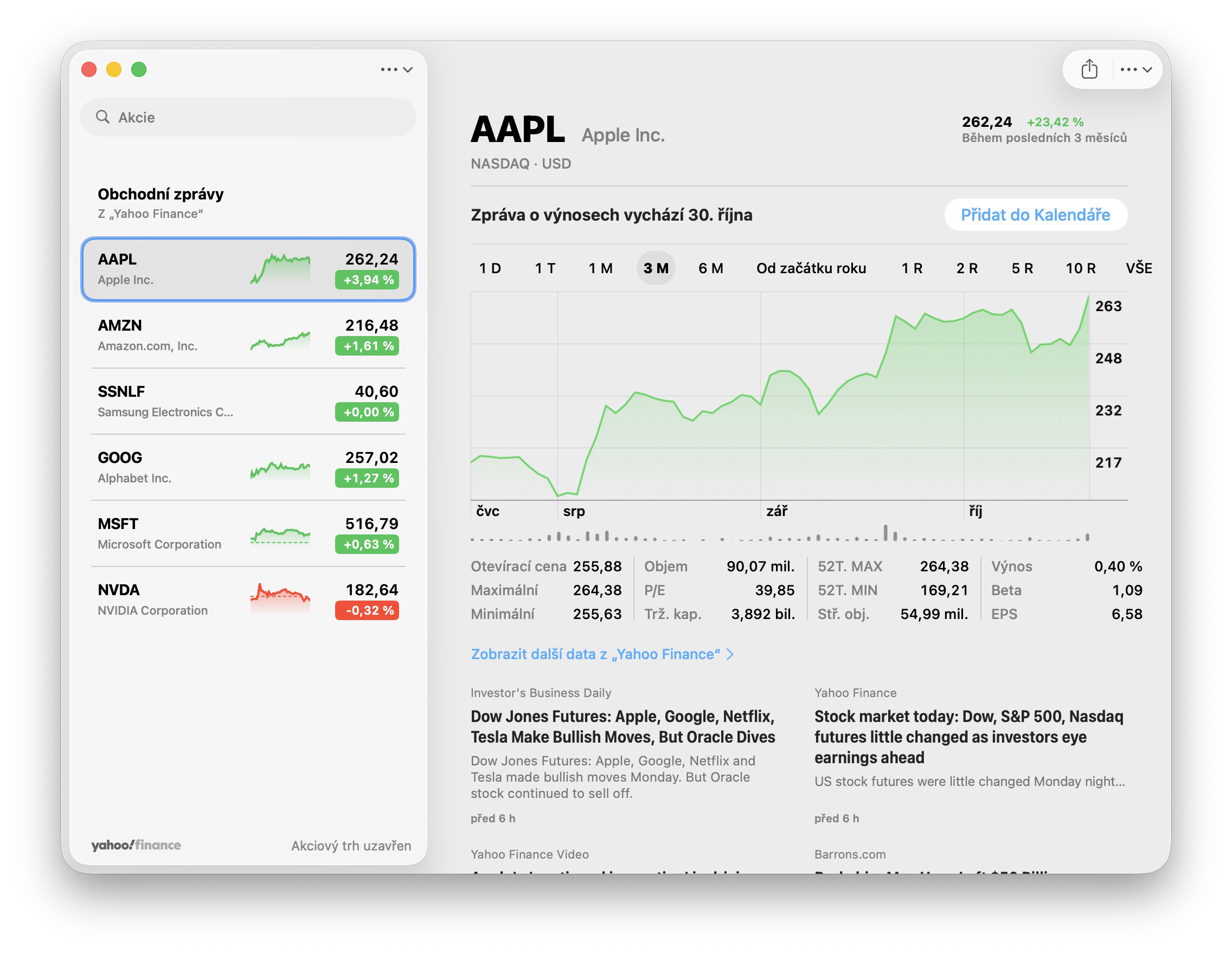 Naopak model iPhone Air, který měl být cenově dostupnější alternativou, se mimo čínský trh setkal s vlažnějším zájmem. V Číně sice krátce po uvedení vyprodal zásoby, ale v Evropě a USA prodeje stagnují. Je třeba připomenout, že akcie Applu prošly od vstupu na burzu již pěti děleními, přičemž poslední, v poměru 4 ku 1, proběhlo v roce 2020. Očekává se, že společnost zveřejní své čtvrtletní výsledky 30. října, které by mohly potvrdit pokračující trend růstu.