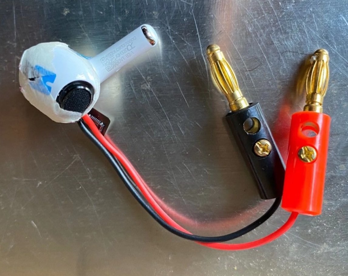 Na první pohled je jasné, že tohle nejsou obyčejná sluchátka. Každé z nich má totiž externí „banana plugy“ pro napájení, doplněné o fabrické štítky, QR kódy a různé výrobní značky, které se běžně používají pro testování funkčnosti během interního vývoje. Samotné tělo sluchátek je přitom designově téměř totožné s finální verzí AirPods Pro, což jasně ukazuje, že šlo o finální testovací kusy těsně před uvedením na trh.