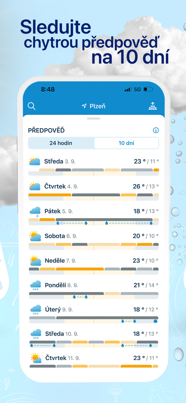 Hlavní část aplikace tvoří vysouvací karta s předpovědí – jak na 24 hodin, tak na několik dní dopředu. Kromě klasických grafů přináší i speciální denní souhrny. Pomocí tzv. meteo-proužků uživatelé na první pohled zjistí, v jakou denní dobu lze očekávat déšť či slunečné počasí.