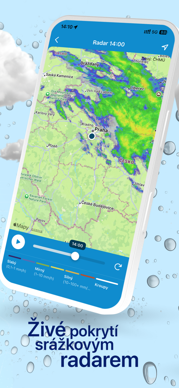 Pod přehledem měření je umístěn interaktivní radar, který zobrazuje aktuální vývoj srážek v reálném čase. Novinkou je možnost zobrazit i predikci radaru na příští hodinu, díky které uživatel snadno zjistí, zda se blíží déšť přímo do jeho oblasti.