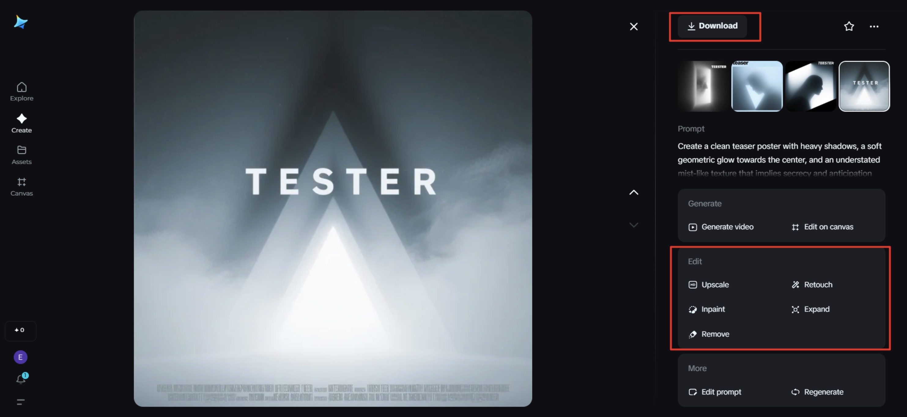 Now refine your intrigue-inducing masterpiece with Dreamina’s AI features, such as inpaint, expand, erase, and retouch. You can stretch shadows, blur edges, or erase extraneous details to add more depth to the mystery. When your design attains that perfect balance of silence and implication, tap Download to save and ready it for your release rollout.