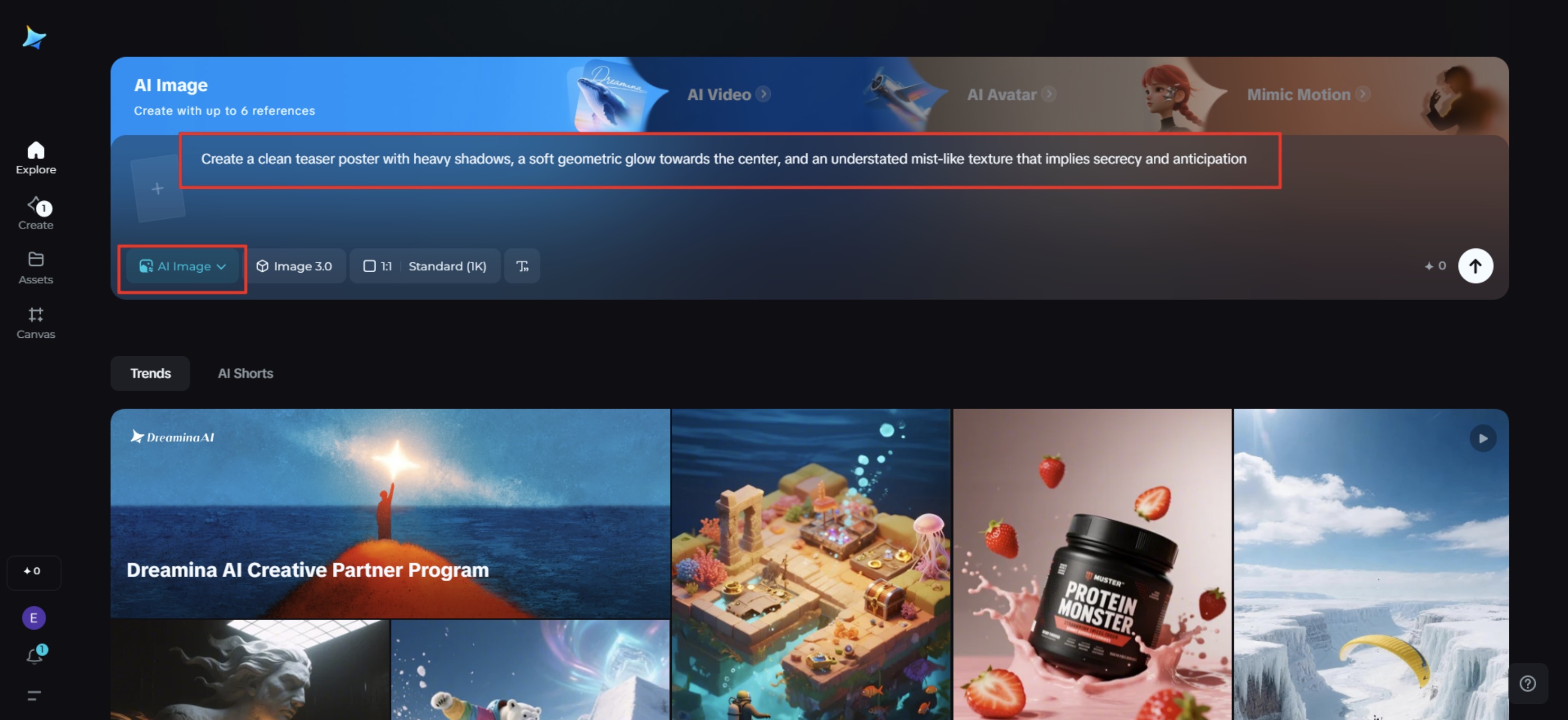 To start your mystery design, launch Dreamina and write a descriptive prompt that speaks of atmosphere, tone, and vagueness instead of objects. Emphasize emotion and texture.