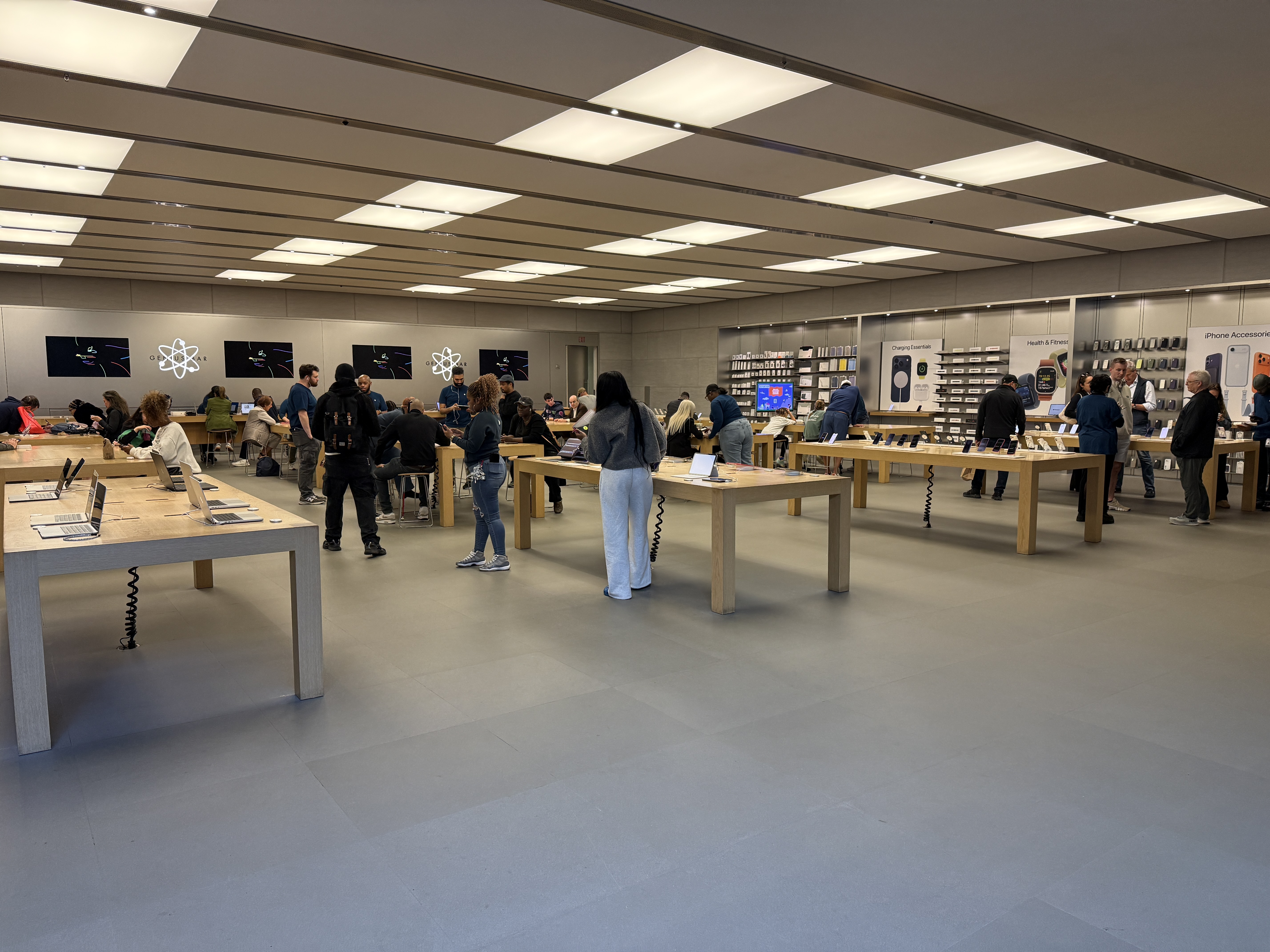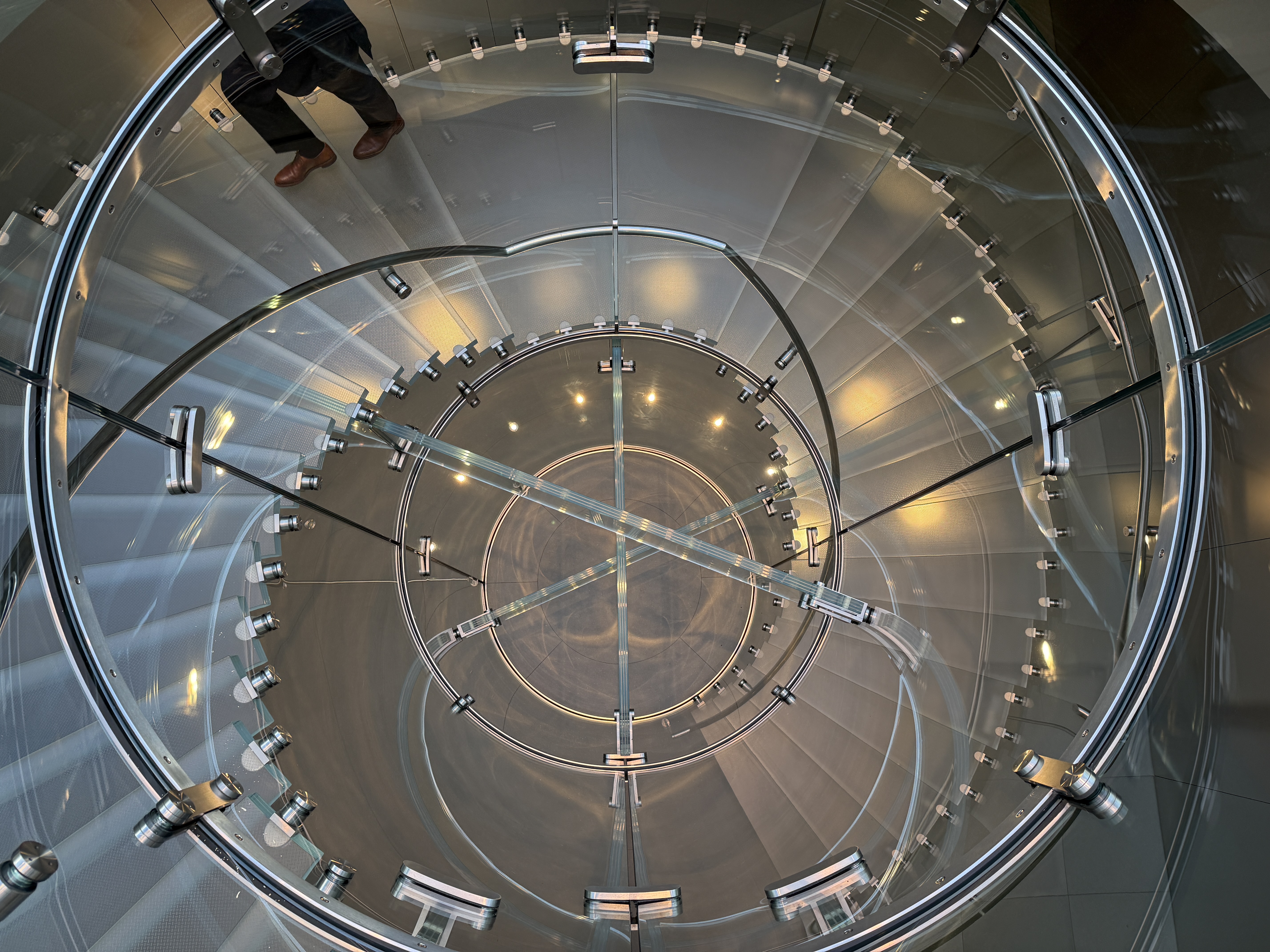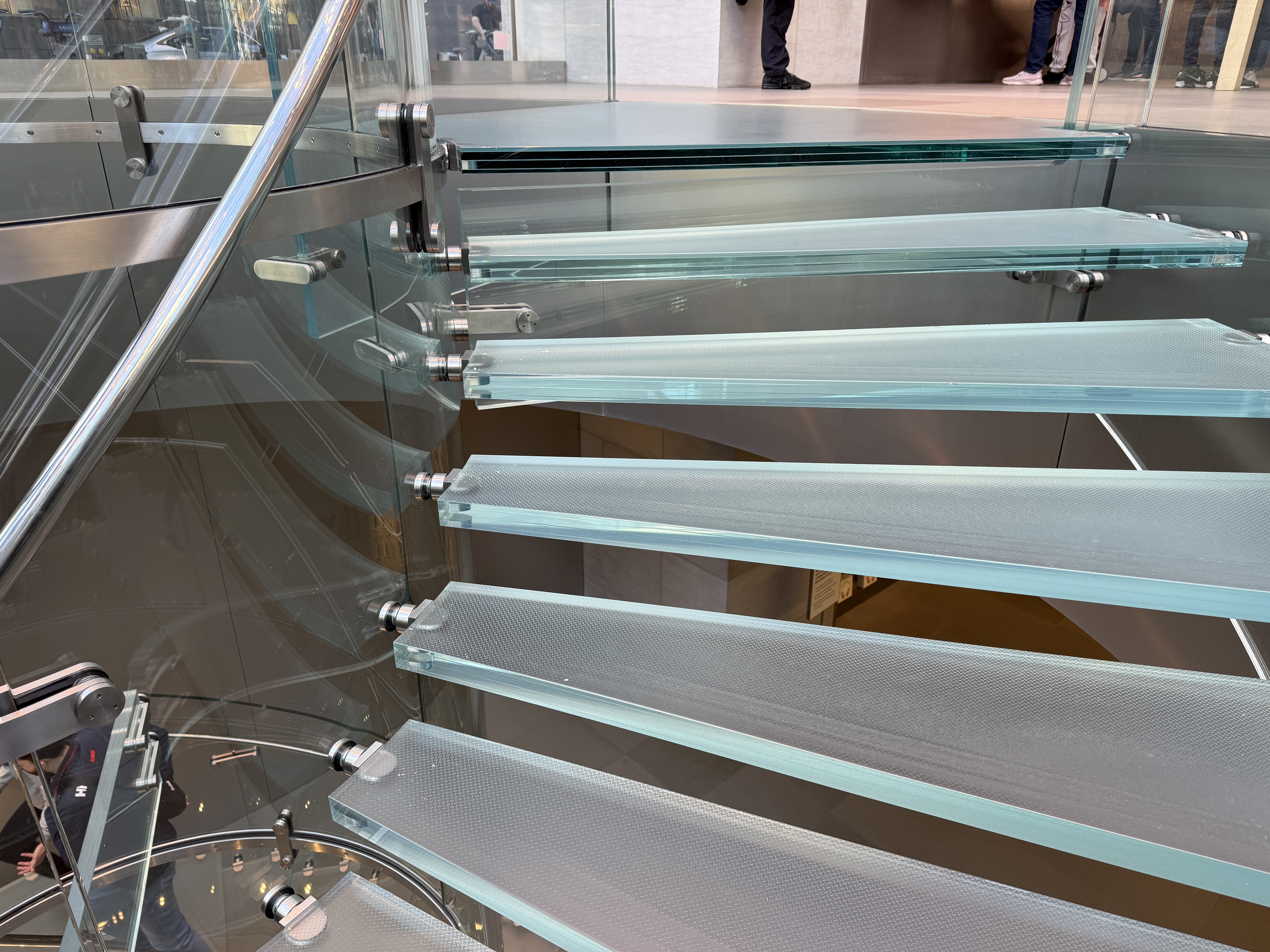 Jinak se jedná o dvě patra, z nichž zatím co do toho horního je přiváděno světlo přes prosklenou střechu, tak druhé musí spoléhat kompletně na umělé osvětlení. Nic kromě schodiště, co by stálo za řeč zde nenajdete a bohužel díky absenci prvků jako je zelená stěna nebo nějakých rostlin a podobně působí tento Apple Store na pohled nejchladněji a nejméně zajímavě ze všech, které jsem doposud navštívil.