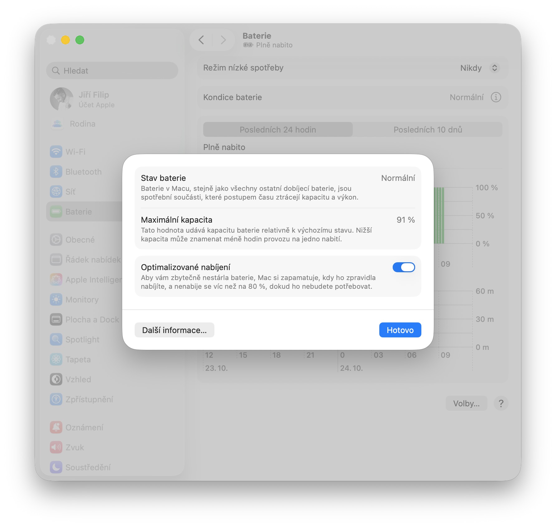 Obecně ale platí, že pokud při koupi použitého Macu zjistíte, že má například 100 až 200 cyklů, jde o velmi dobrý výsledek a baterie by měla být ve výborném stavu. Naopak hodnota kolem 800 až 1000 cyklů už značí akumulátor na konci své životnosti, který může být potřeba brzy vyměnit. To by vám ale měl ve výsledku ukázat i procentuální indikátor přímo v Nastavení – Baterie. Jen pro představu, nedávno jsem pořizoval MacBook Air M1 s tím, že se mi přes Mobil Pohotovost podařil sehnat krasavec s pouhými 78 nabíjecími cykly, tedy 97% kapacitou baterie. I přesto, že se jedná o stroj z podzimu 2020, tedy je jeho baterie takřka netknutá.