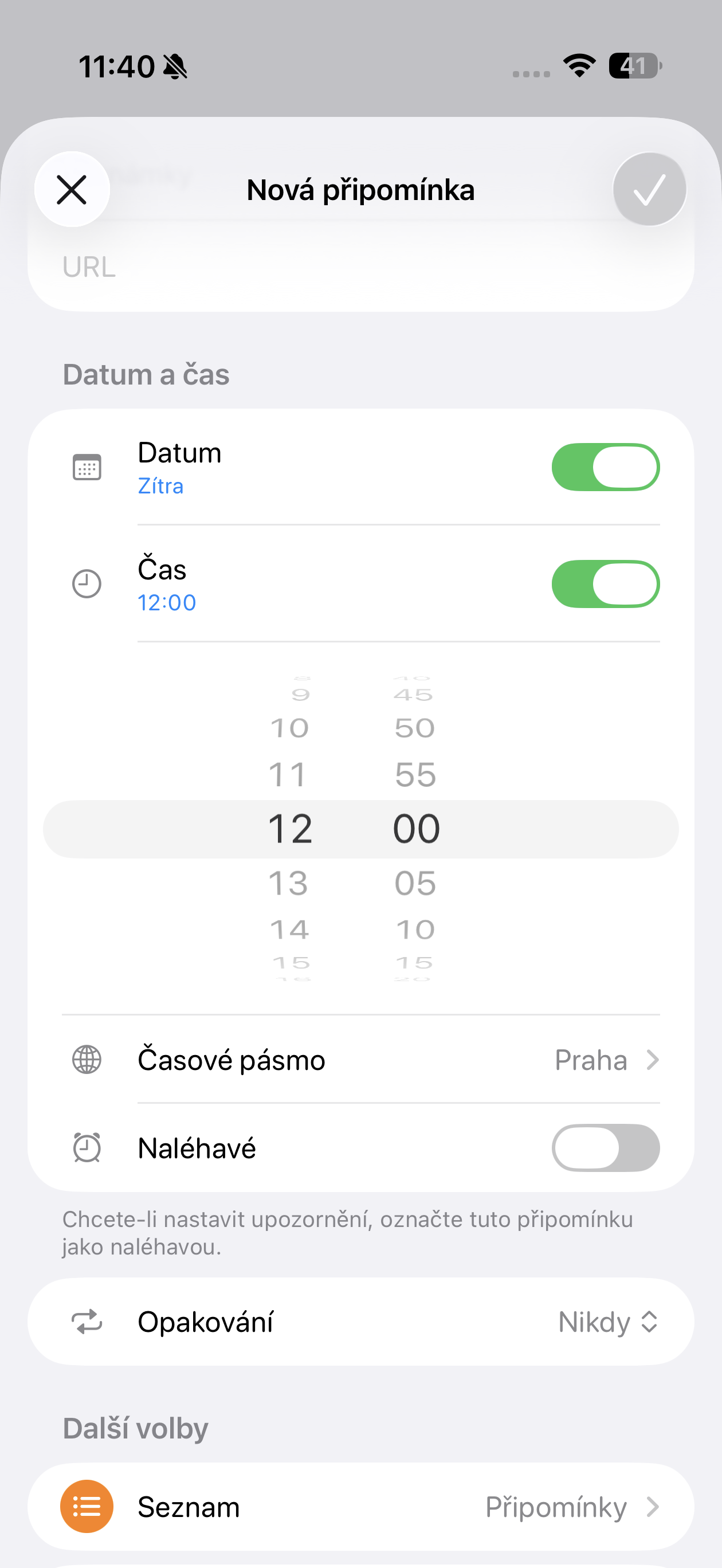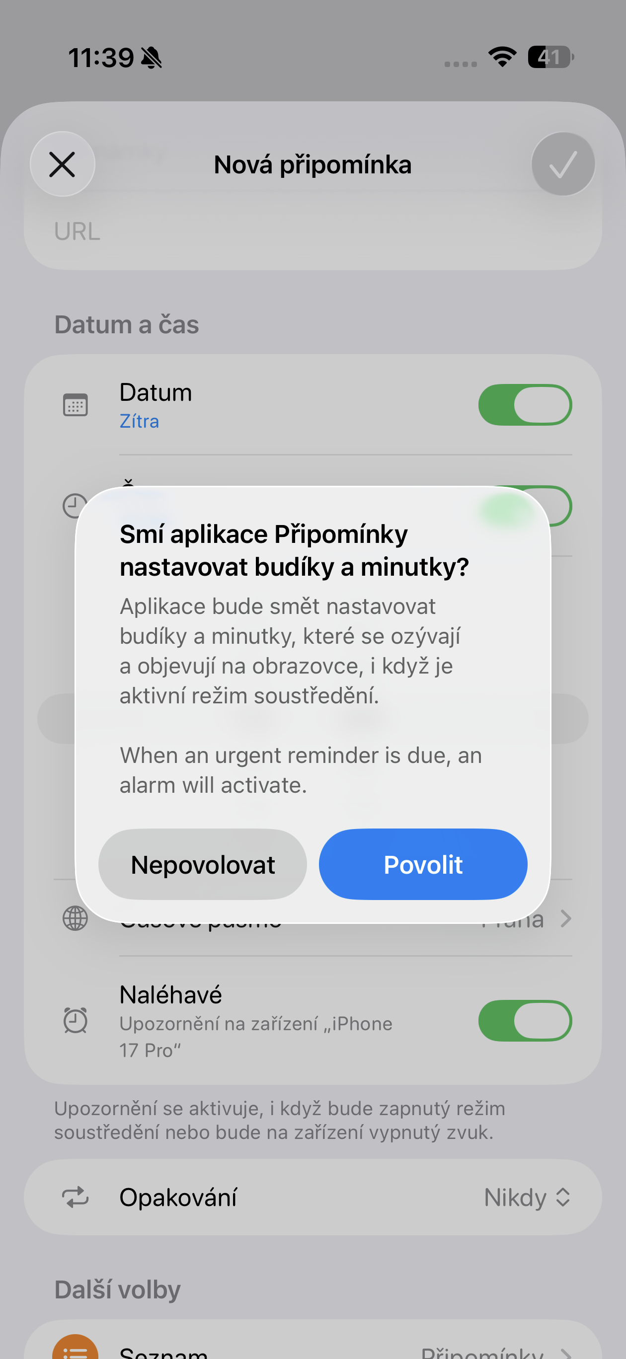 Jakmile v Připomínkách vyberete čas a zapnete přepínač „Naléhavé“, iPhone v nastavený moment spustí klasický budík a to se vší parádou – tedy se zvukem a možností odložit nebo zastavit. Pokud pak alarm odložíte, na zamčené obrazovce se objeví odpočet s nabídkou připomínku dokončit nebo přeplánovat. Klepnutím na dokončení vás pak iOS rovnou přepne do aplikace Připomínky, kde ji potvrdíte.