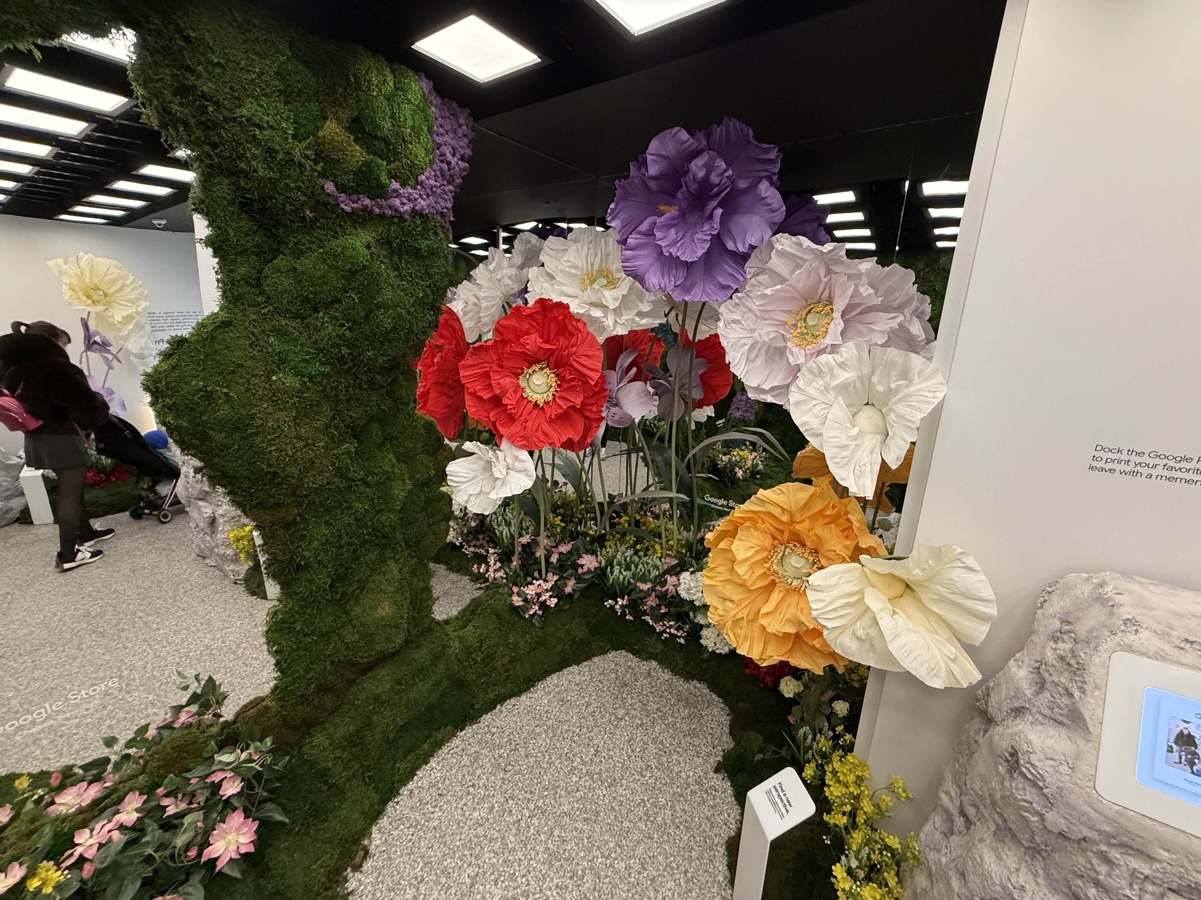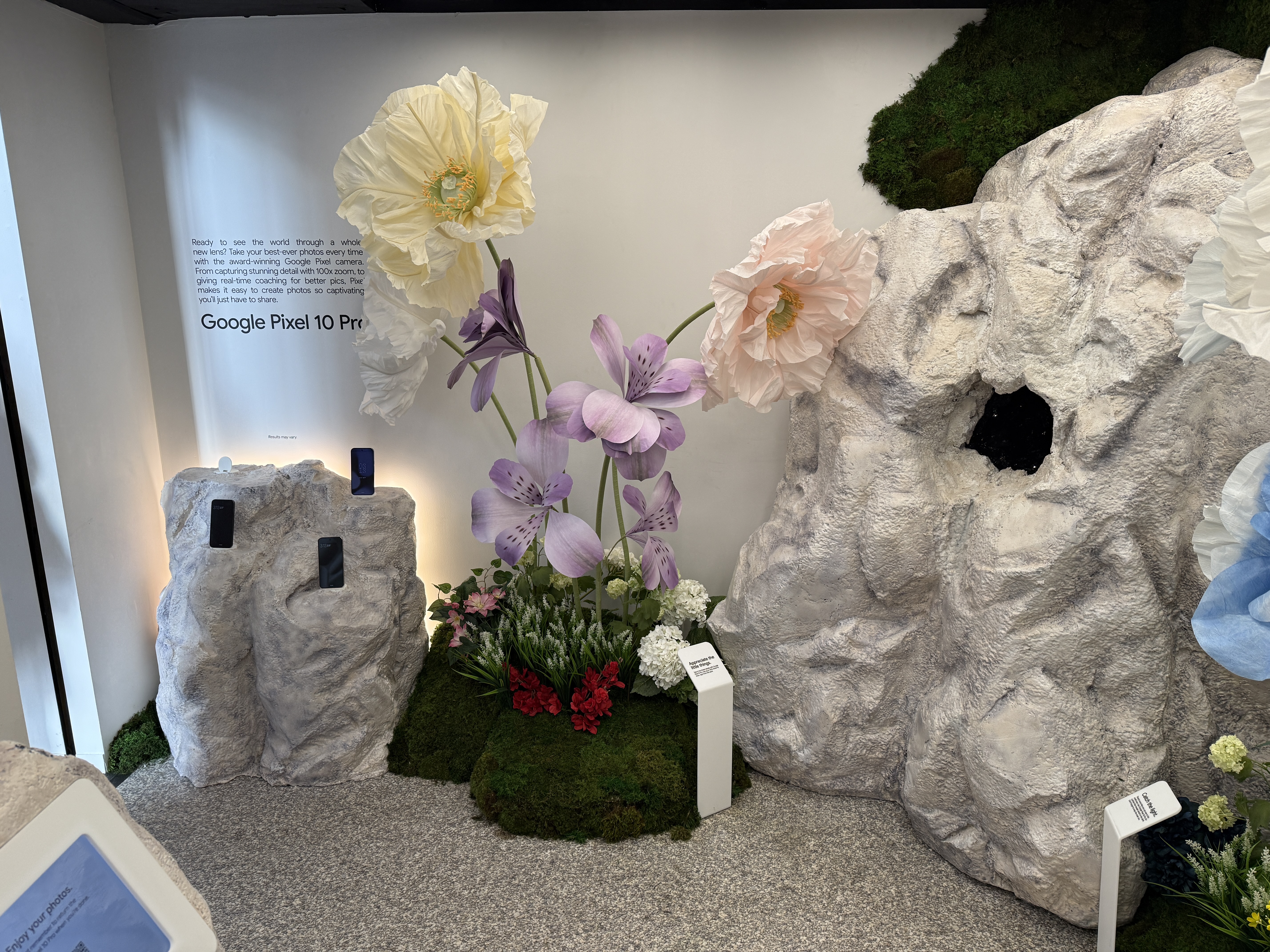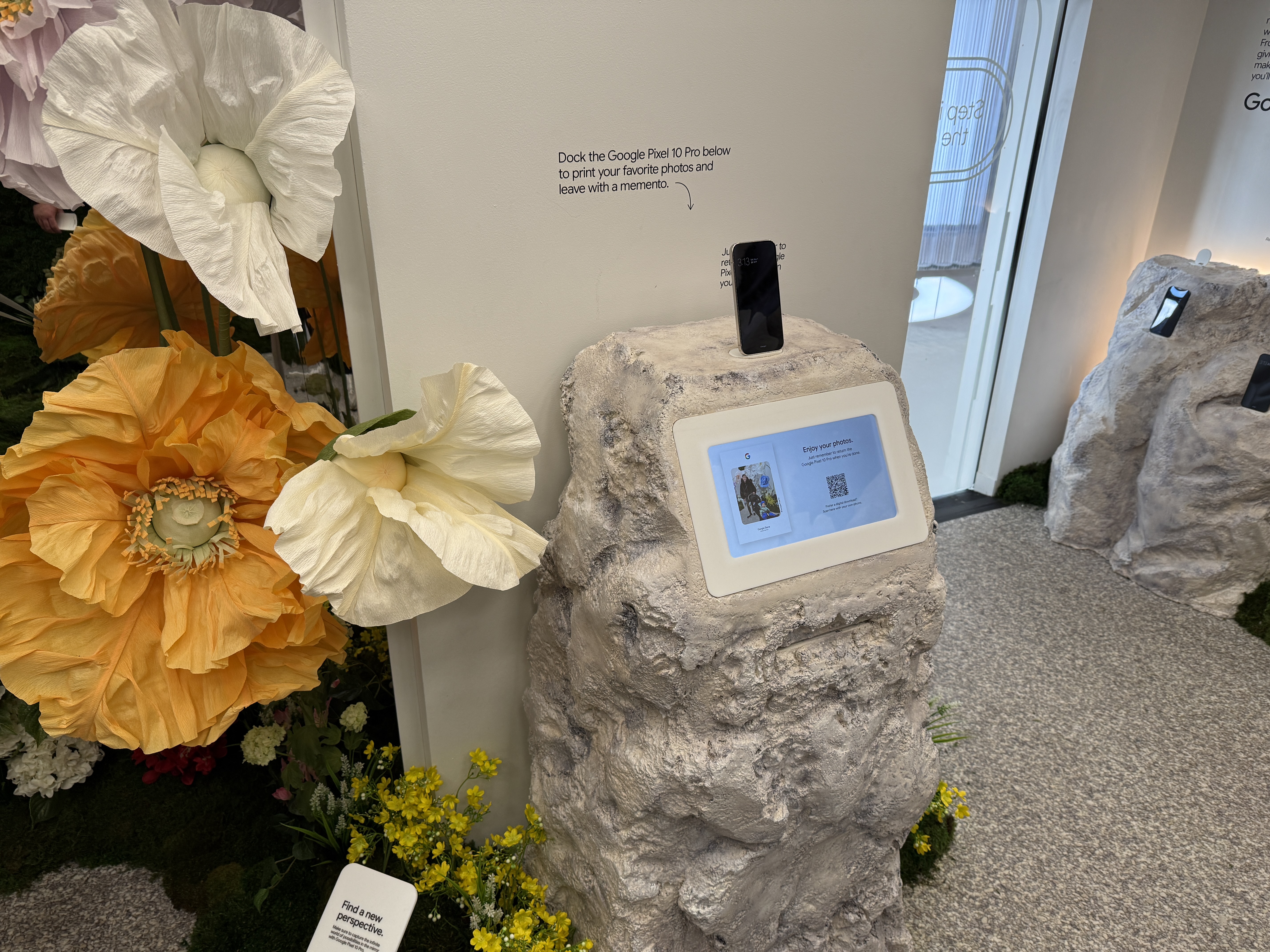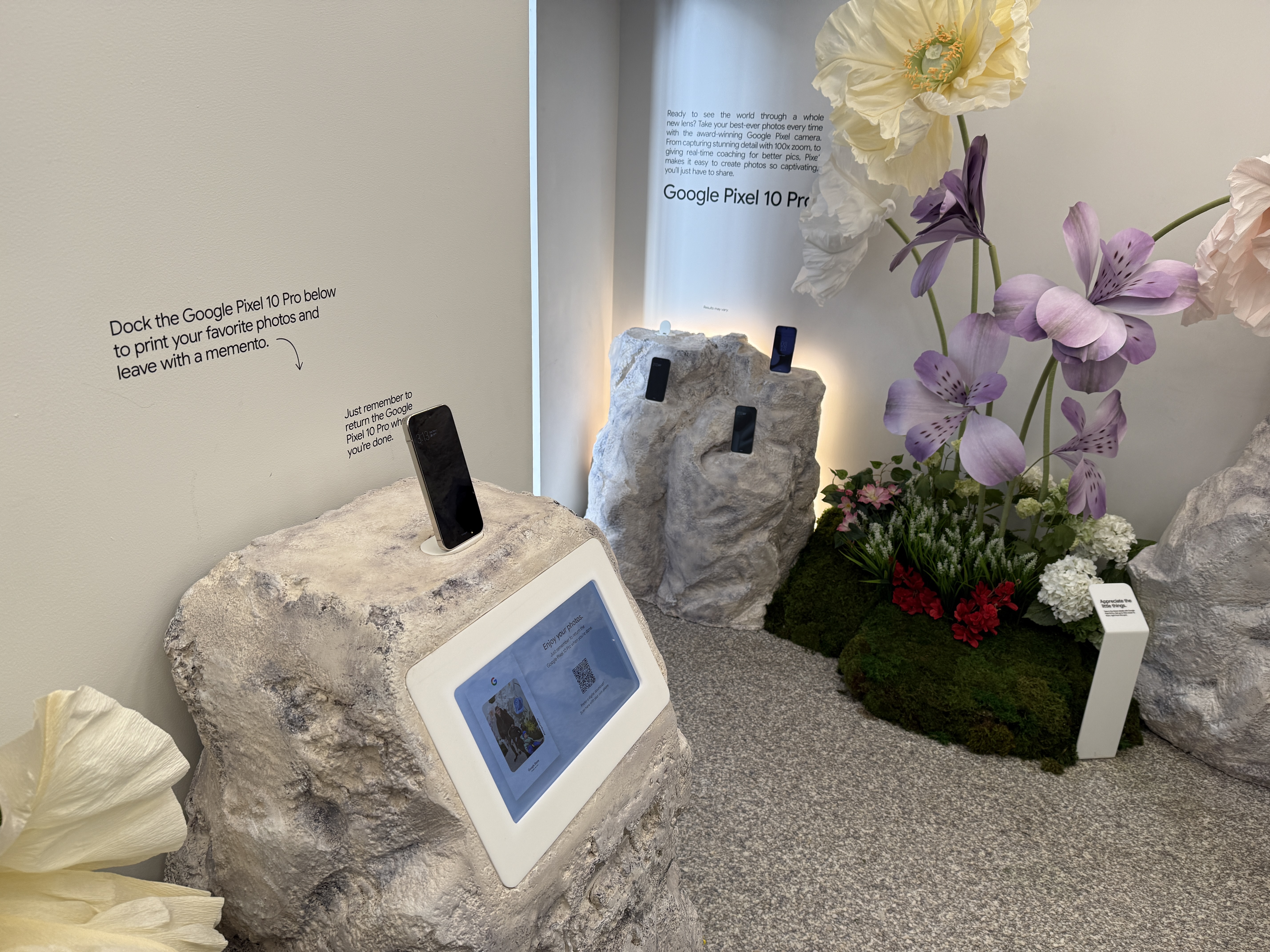 V rámci mísnosti Pixel Camera si vezmete jeden ze čtyř telefonů Pixel 10 a projdete mísnost, ve které najdete květiny, umělou jeskyni, zrcadla, mech a další věci, které jsou fotogenické. Můžete si jednoduše vzít jeden ze čtyř telefonů a nafotit cokoli, co se vám líbí a co vás jen napadne. Vyzkoušíte si tak focení v různých podmínkách. Jakmile vyfotíte svoji nejlepší fotografi, jednoduše zapojíte telefon Pixel 10 do tiskárny, a fotografii si samozřejmě zdarma okamžitě vytisknete a odnesete domů na památku.