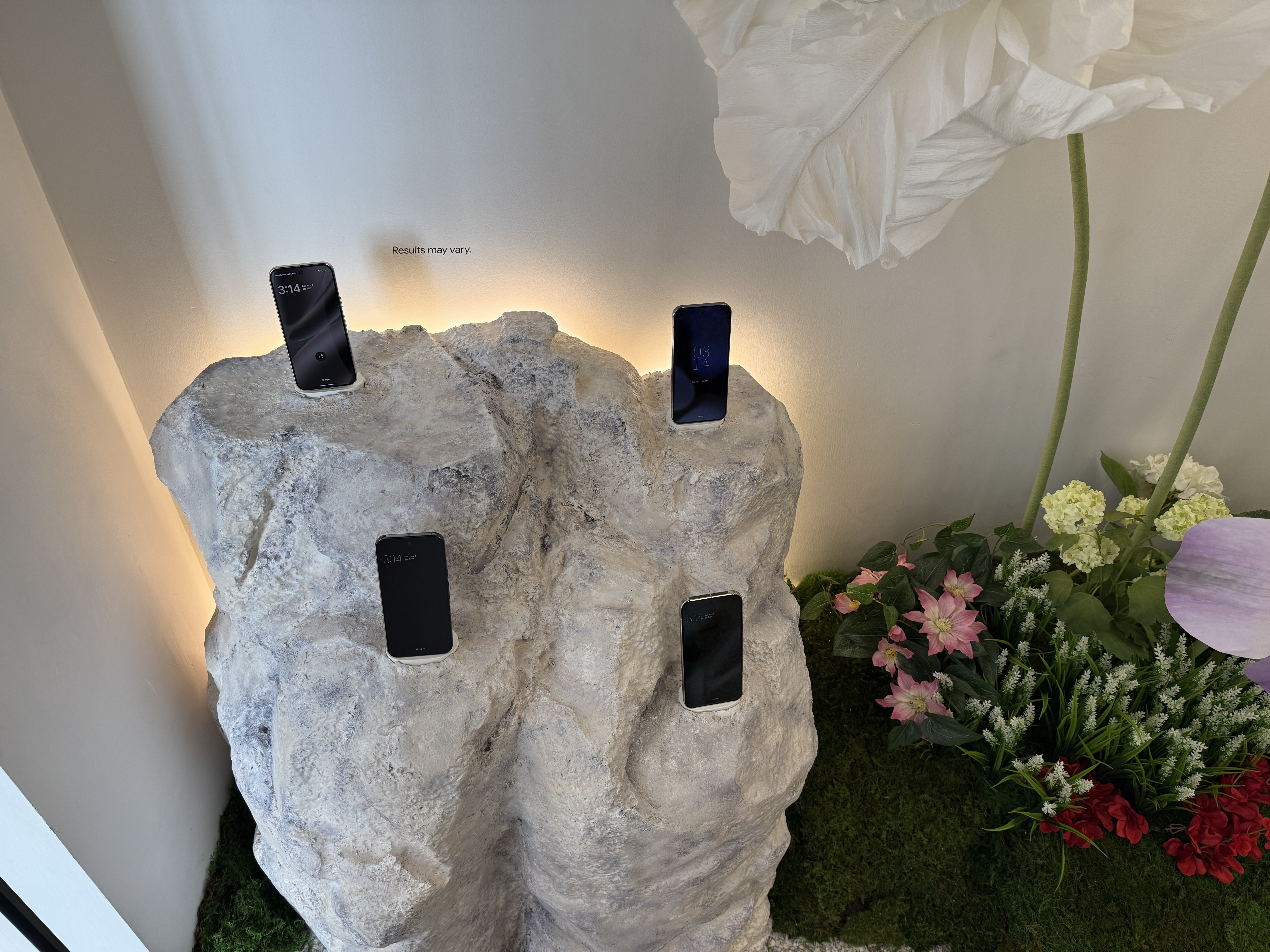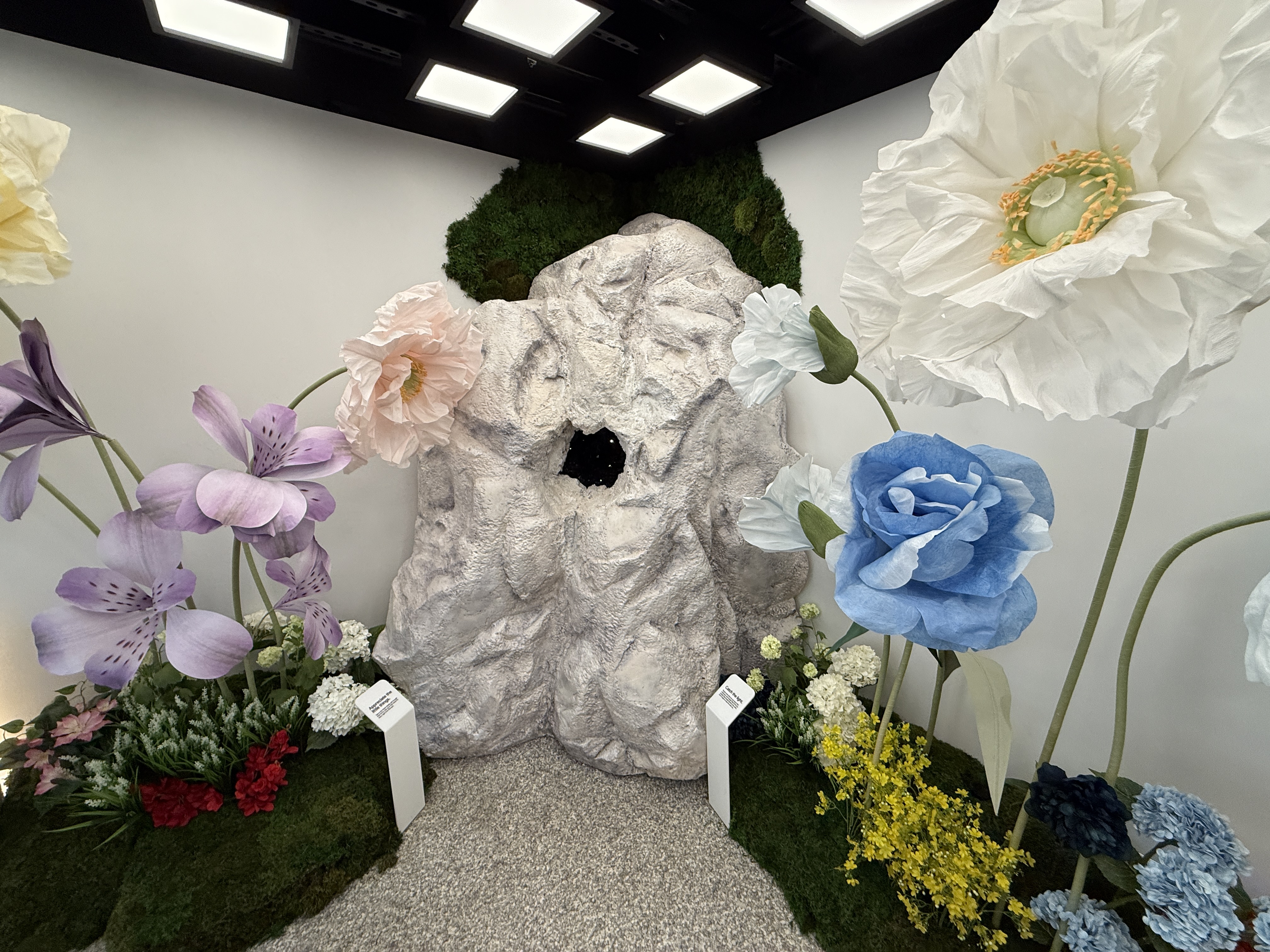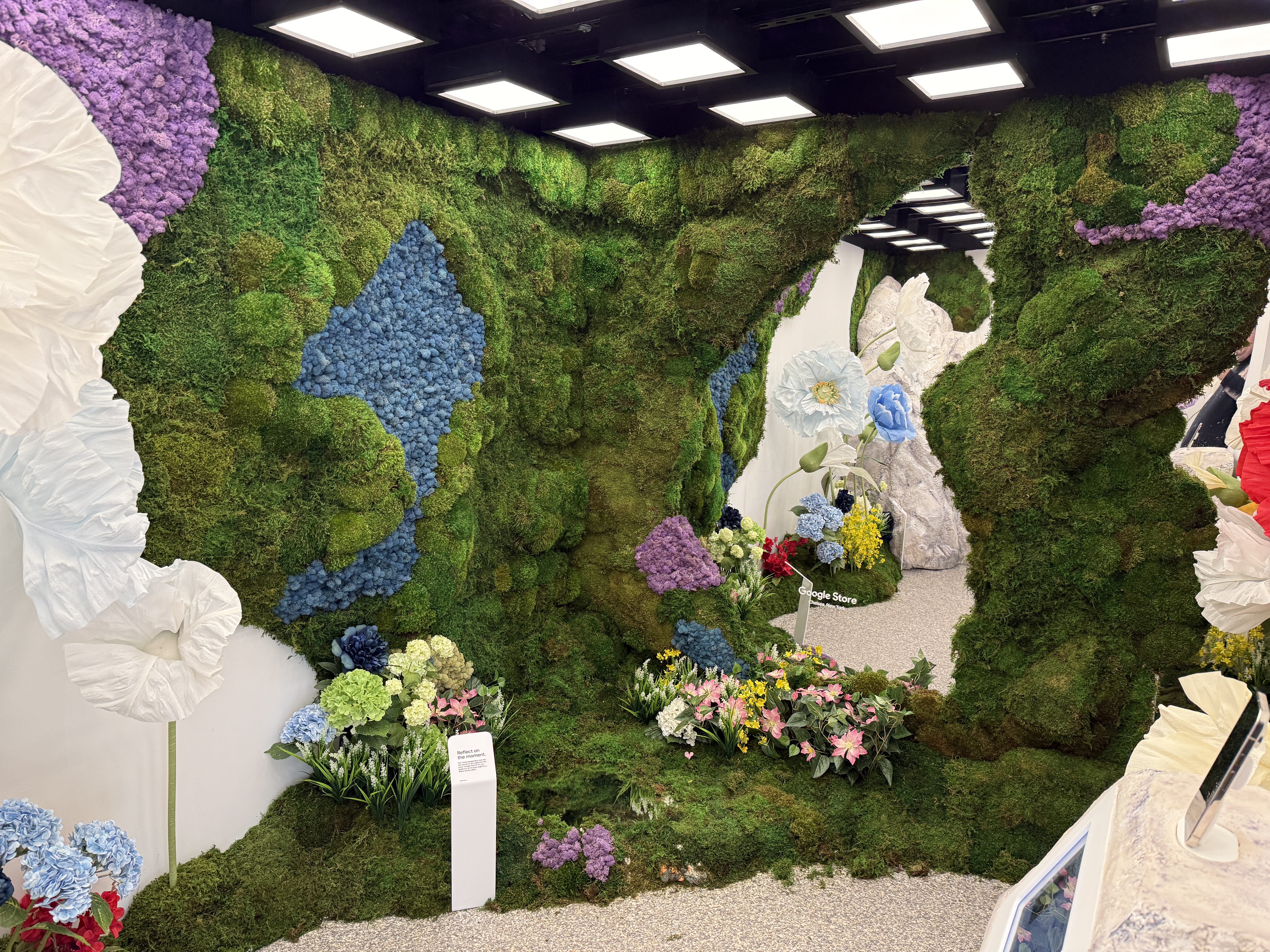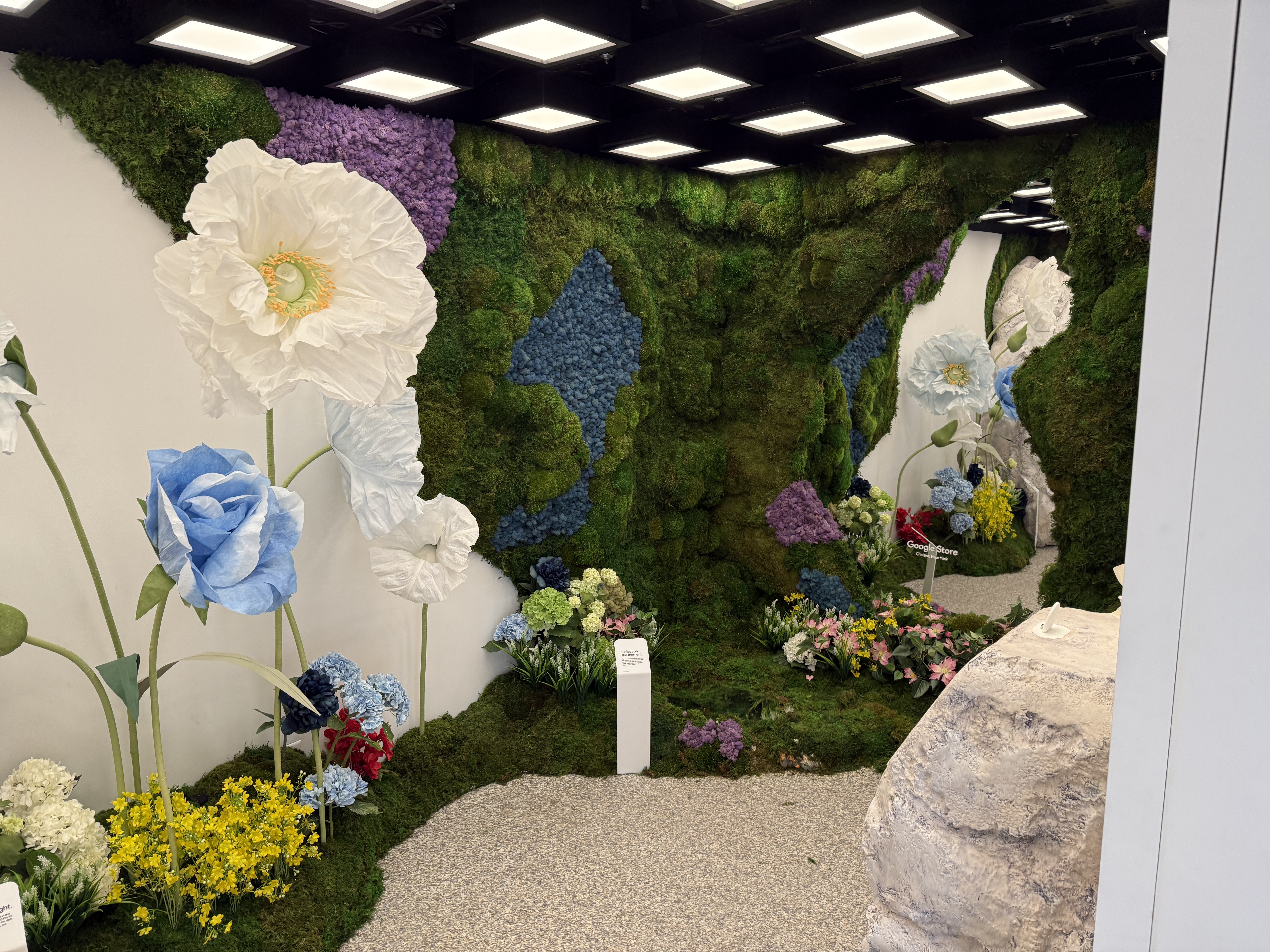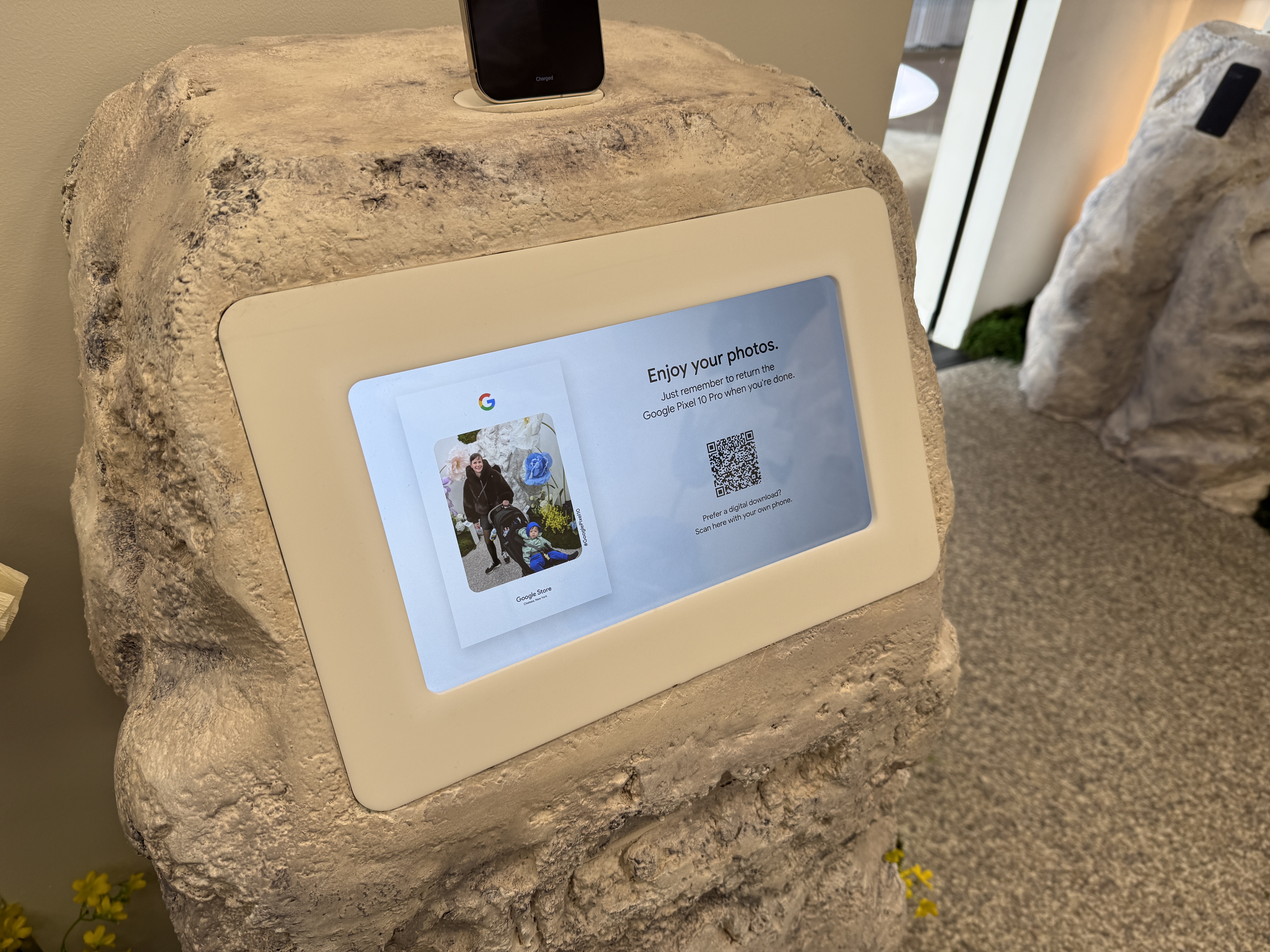V rámci mísnosti Pixel Camera si vezmete jeden ze čtyř telefonů Pixel 10 a projdete mísnost, ve které najdete květiny, umělou jeskyni, zrcadla, mech a další věci, které jsou fotogenické. Můžete si jednoduše vzít jeden ze čtyř telefonů a nafotit cokoli, co se vám líbí a co vás jen napadne. Vyzkoušíte si tak focení v různých podmínkách. Jakmile vyfotíte svoji nejlepší fotografi, jednoduše zapojíte telefon Pixel 10 do tiskárny, a fotografii si samozřejmě zdarma okamžitě vytisknete a odnesete domů na památku.