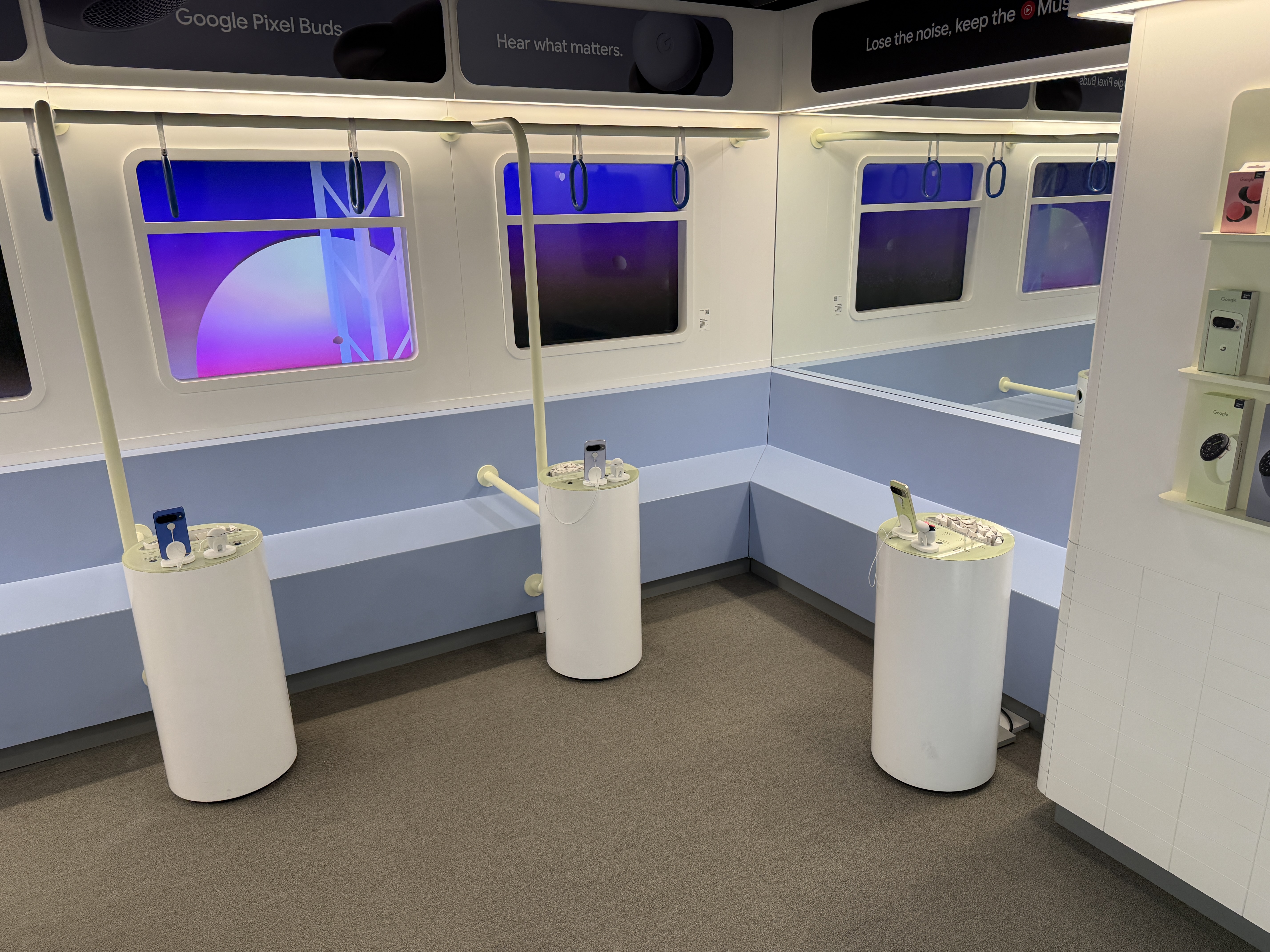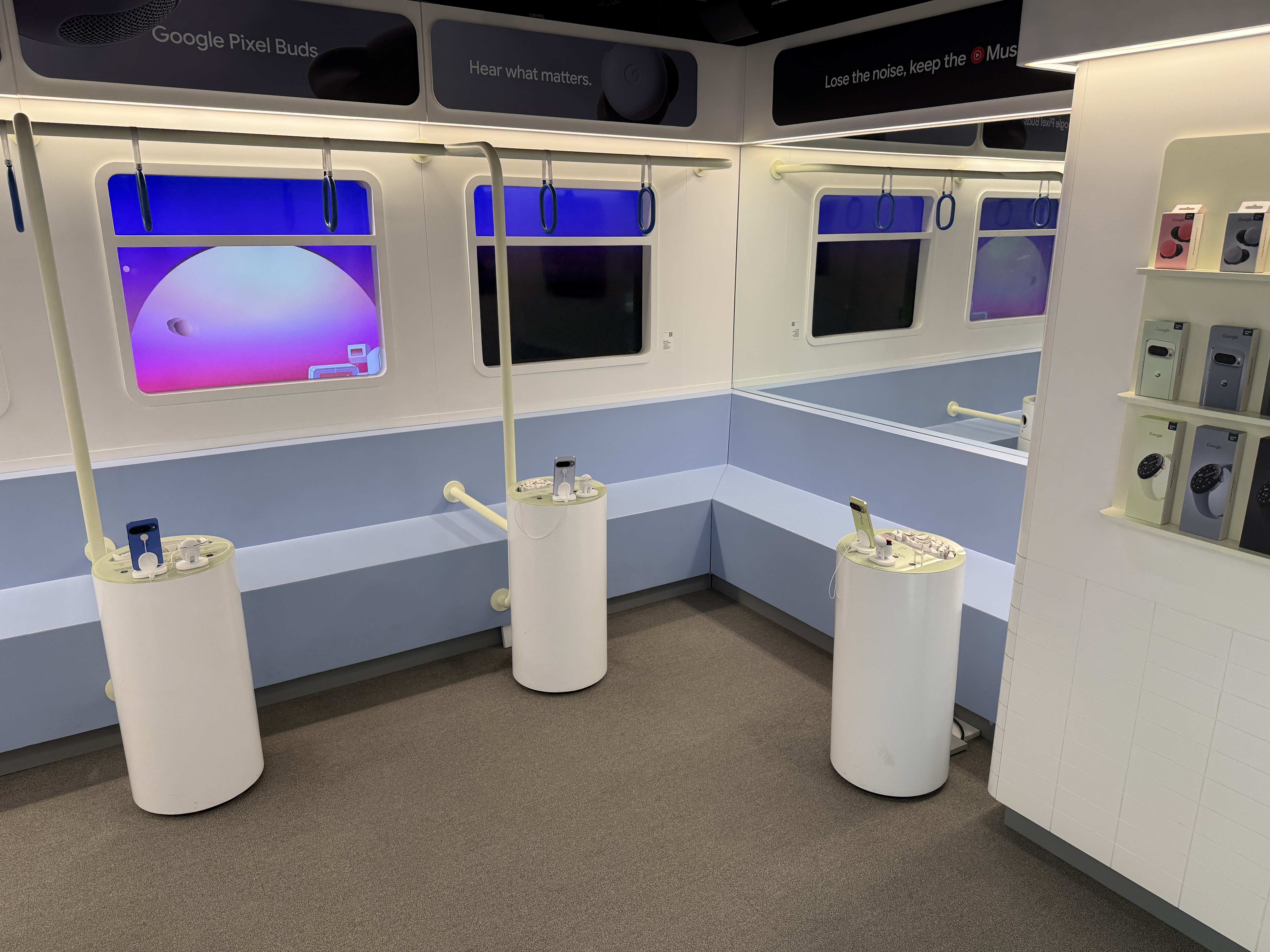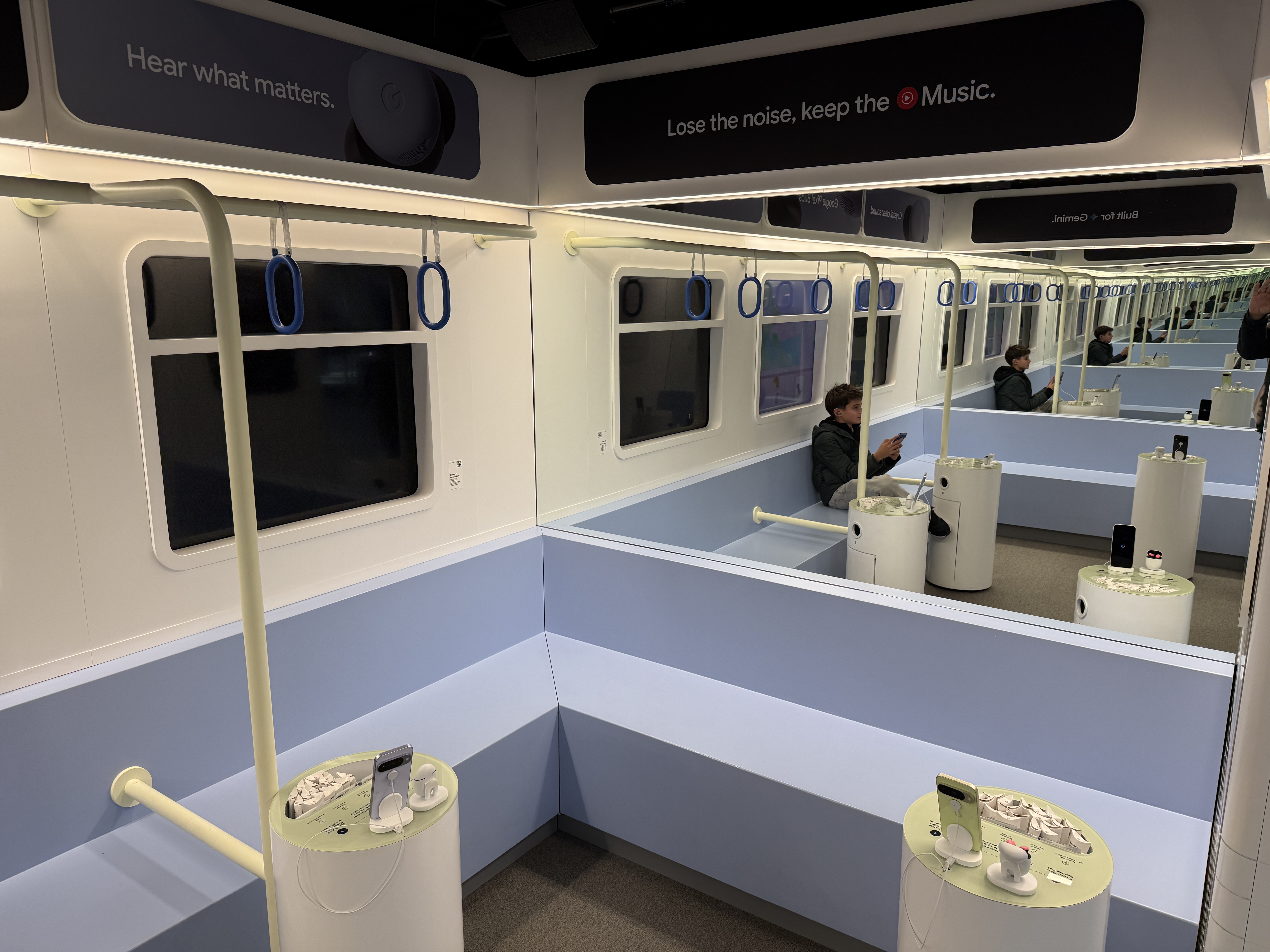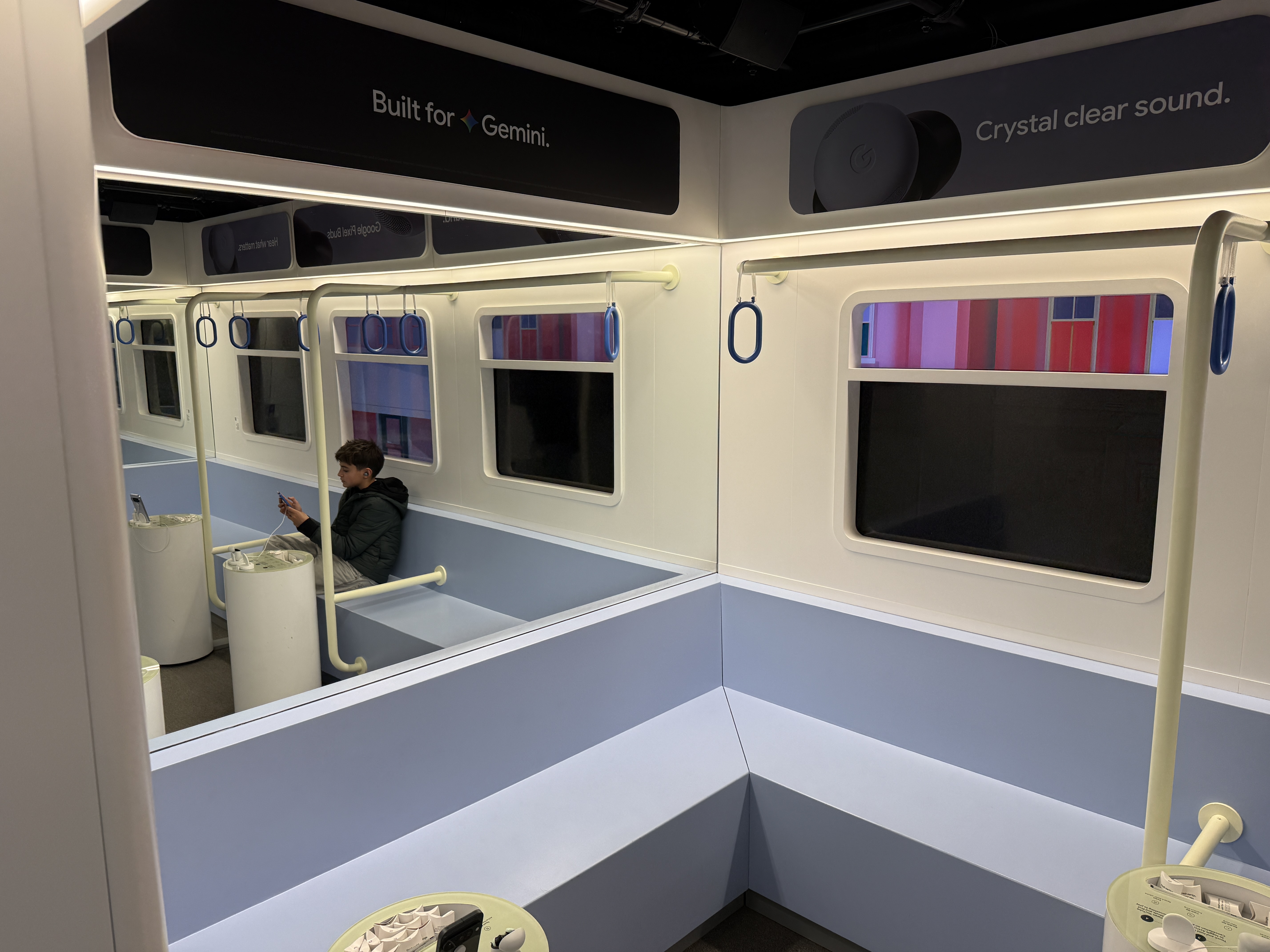 V místnosti Buds si můžete vyzkoušet sluchátka Buds, především pak jejich anc. Místnost totiž celá vypadá jako vagón metra a to včetně oken, které jsou tvořeny obrazovkami, díky čemuž máte pocit, že skutečně jedete metrem. Kromě projekce samozřejmě nechybí ani zvuk typický pro metro a právě ten máte možnost nechat odfiltrovat díky sluchátkům Buds. K dispozici jsou zde čtyři telefony Pixel 10 se spárovanými sluchátky Buds a stovky jednorázových špuntů, které jednoduše vezmete, vytáhnete z krabičky, nasadíte na Buds a můžete poslouchat hudbu a vyzkoušet nejen jak sluchátka hrají, ale také jak funguje potlačování okolního hluku, který v tomto případě zní skutečně jako byste jeli metrem. Po poslechu jednoduše použité špunty vyhodíte do přilehlého koše.