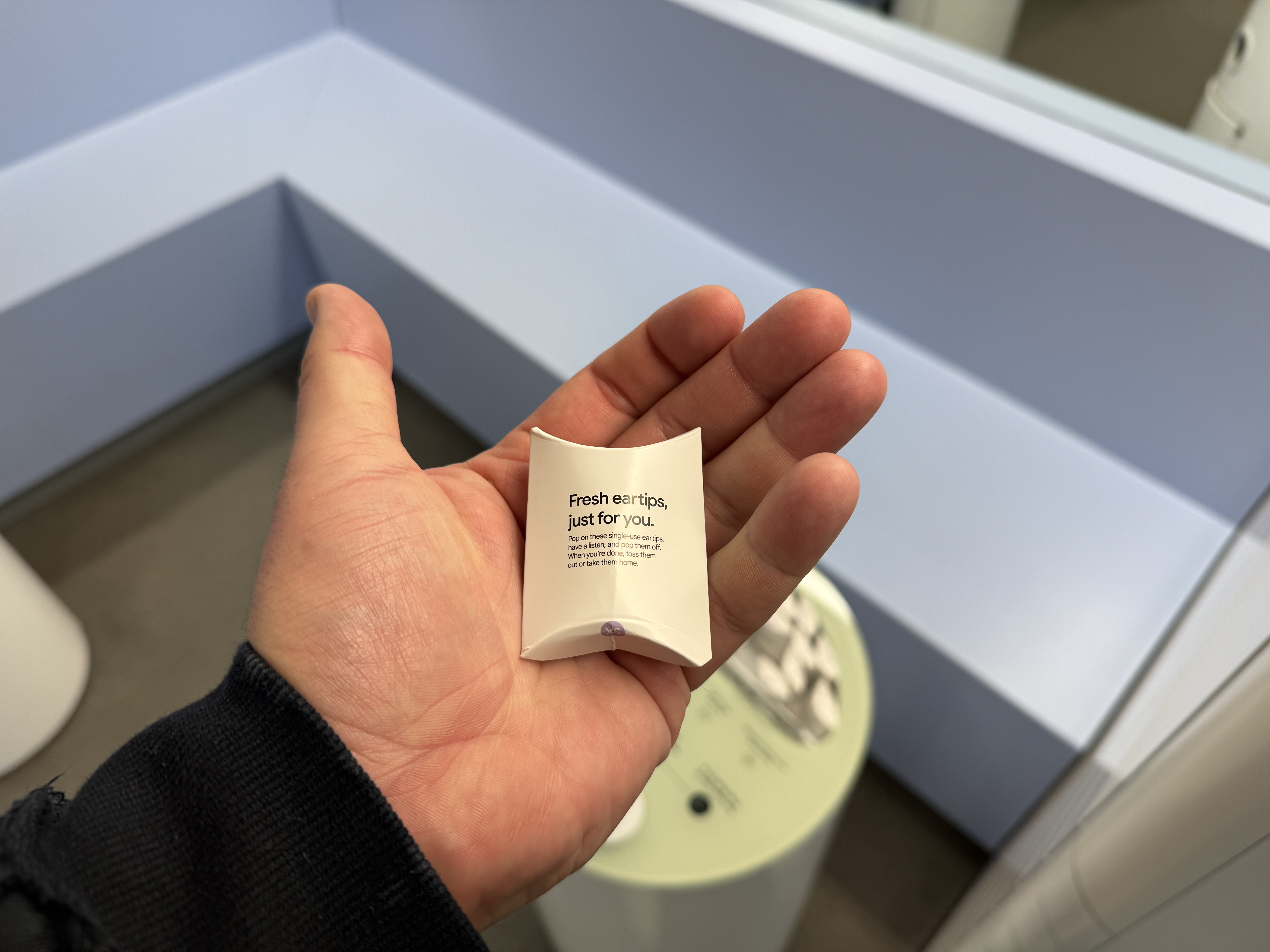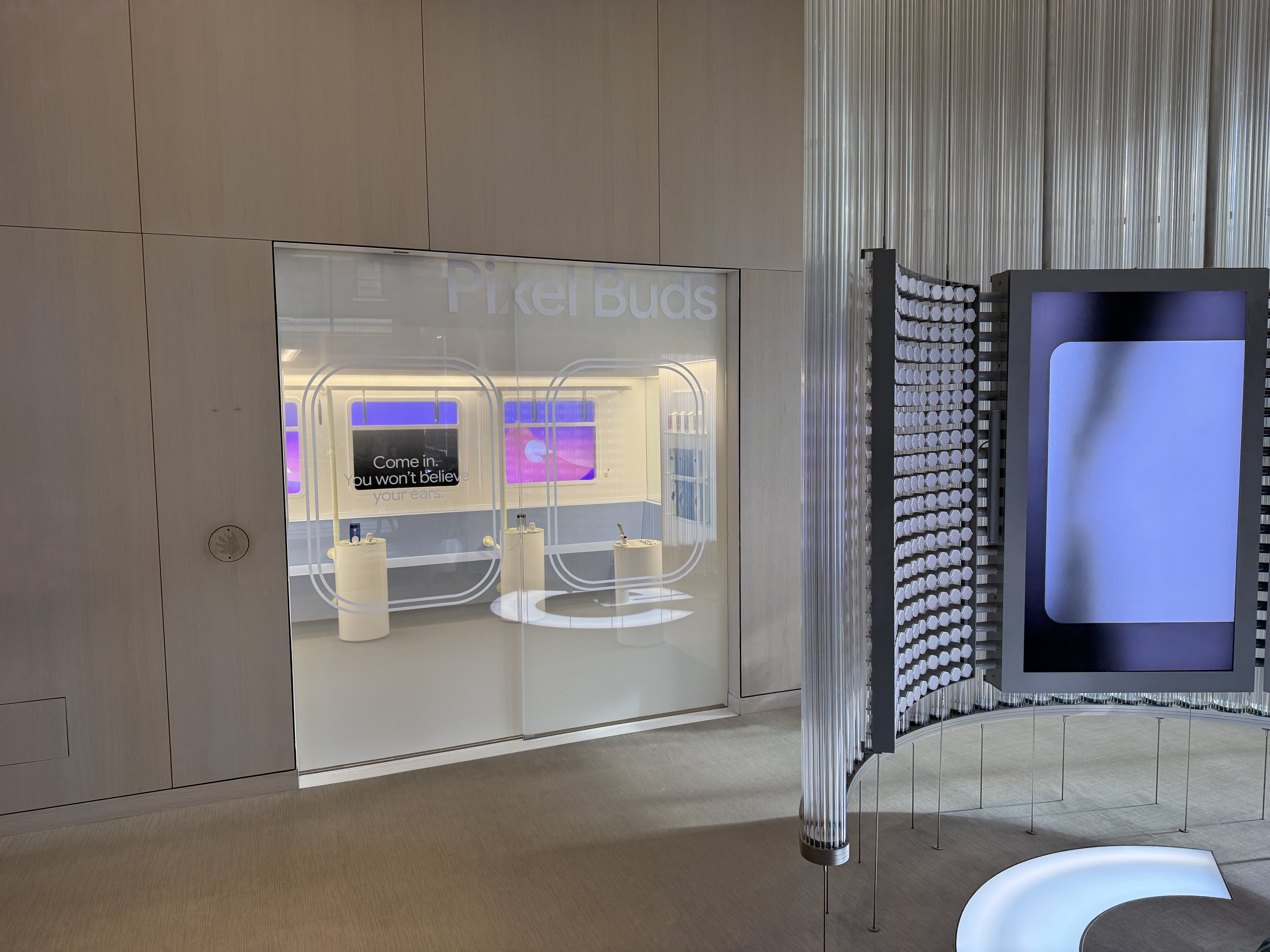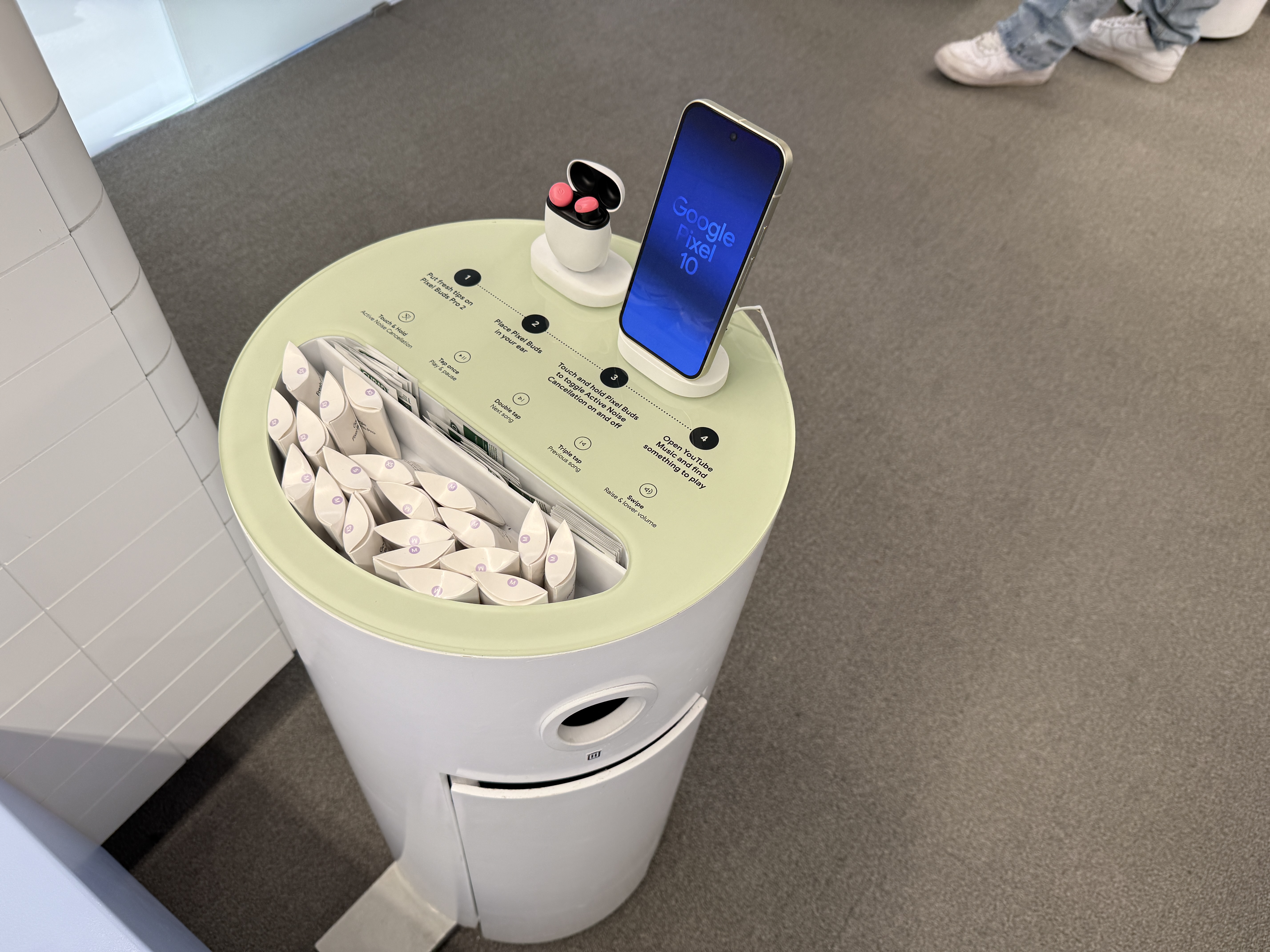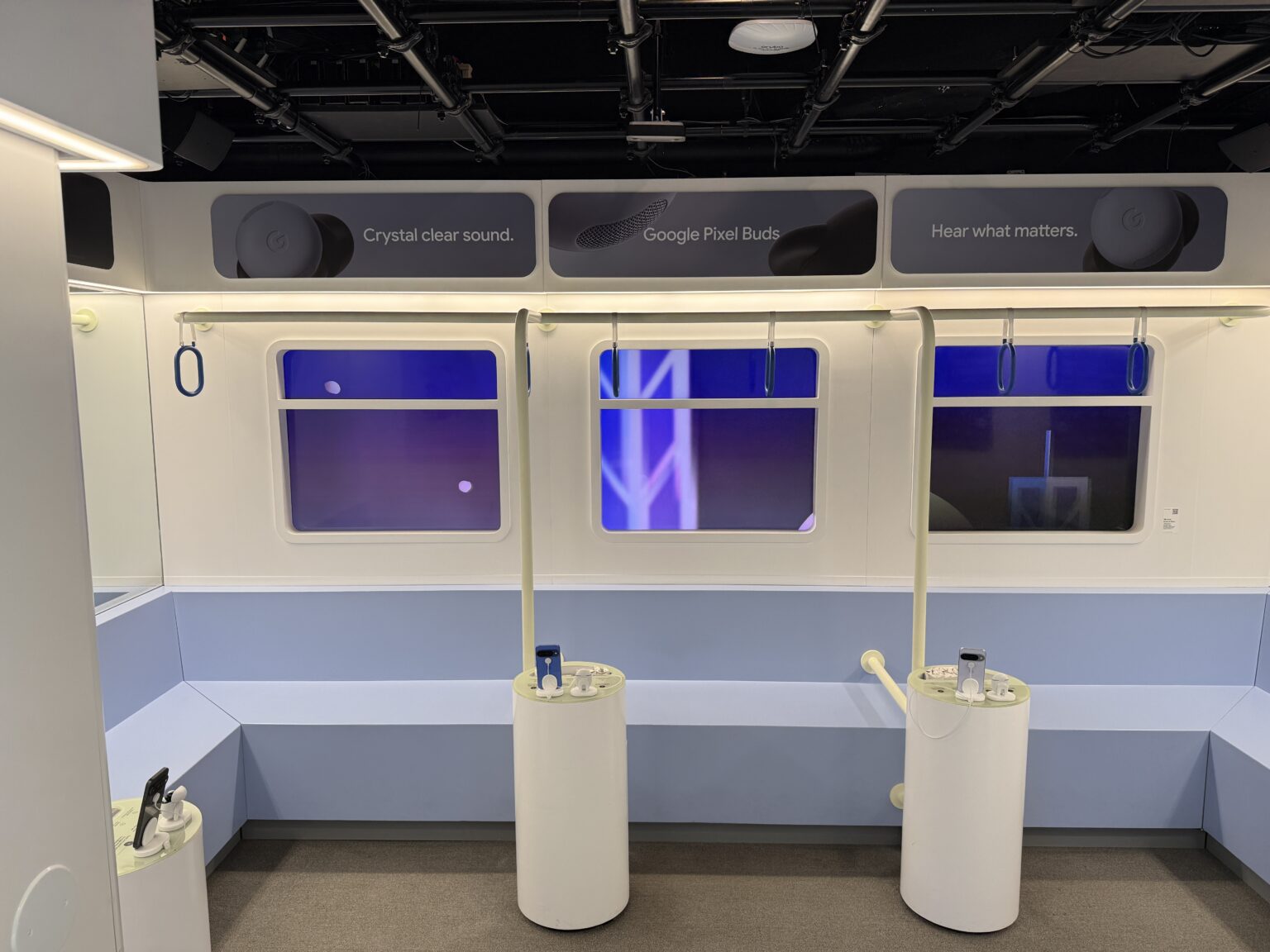 V místnosti Buds si můžete vyzkoušet sluchátka Buds, především pak jejich anc. Místnost totiž celá vypadá jako vagón metra a to včetně oken, které jsou tvořeny obrazovkami, díky čemuž máte pocit, že skutečně jedete metrem. Kromě projekce samozřejmě nechybí ani zvuk typický pro metro a právě ten máte možnost nechat odfiltrovat díky sluchátkům Buds. K dispozici jsou zde čtyři telefony Pixel 10 se spárovanými sluchátky Buds a stovky jednorázových špuntů, které jednoduše vezmete, vytáhnete z krabičky, nasadíte na Buds a můžete poslouchat hudbu a vyzkoušet nejen jak sluchátka hrají, ale také jak funguje potlačování okolního hluku, který v tomto případě zní skutečně jako byste jeli metrem. Po poslechu jednoduše použité špunty vyhodíte do přilehlého koše.